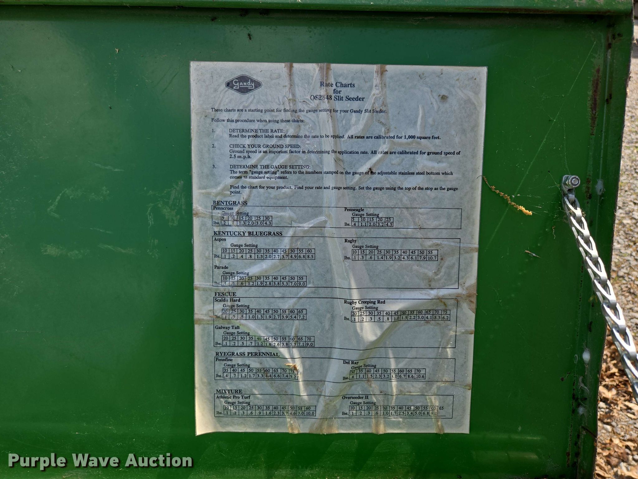 Purple Wave is selling a used Grain Drill or Seeder in Kansas. This item is a Gandy 2848DP seeder with the following: Width: 4', Row units: 24, Row spacing: 2", Serial: 82192