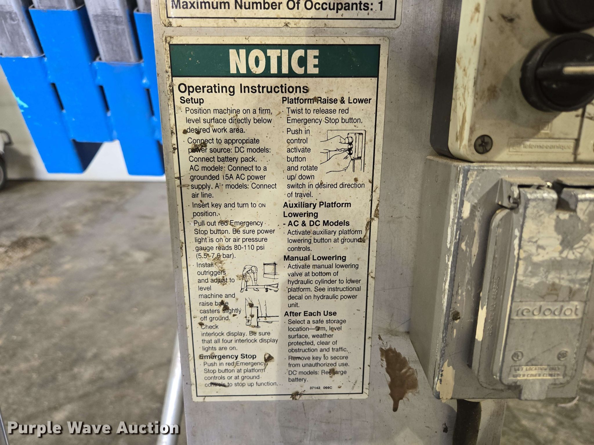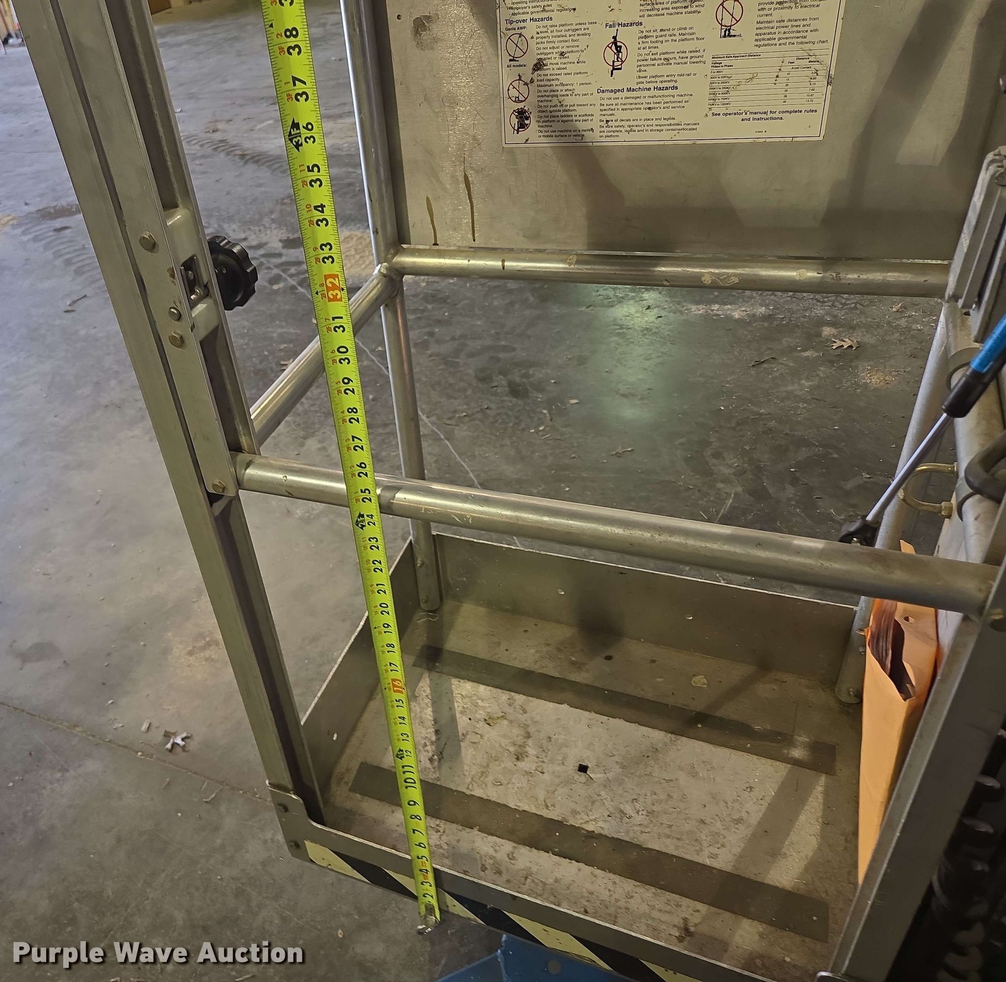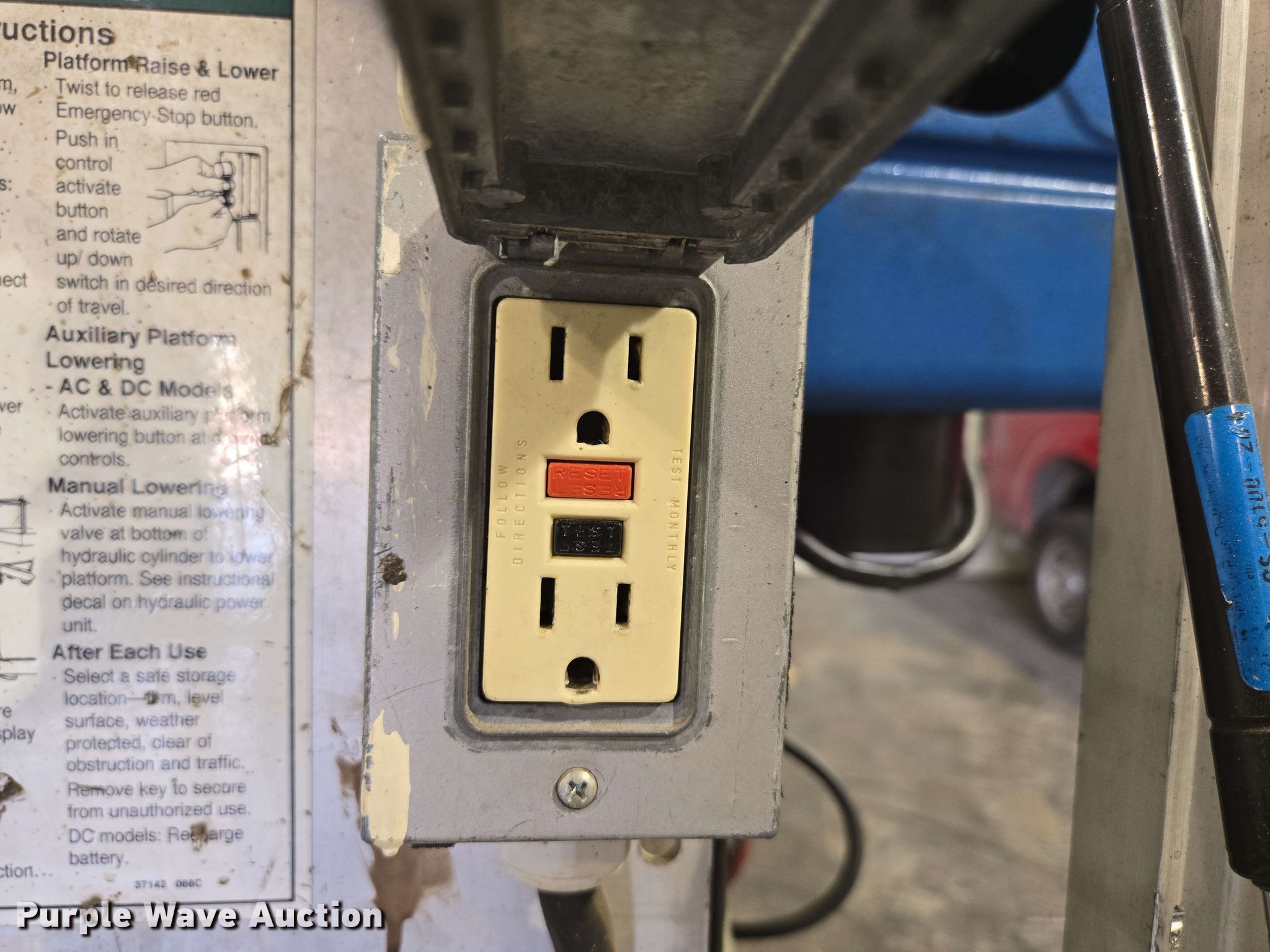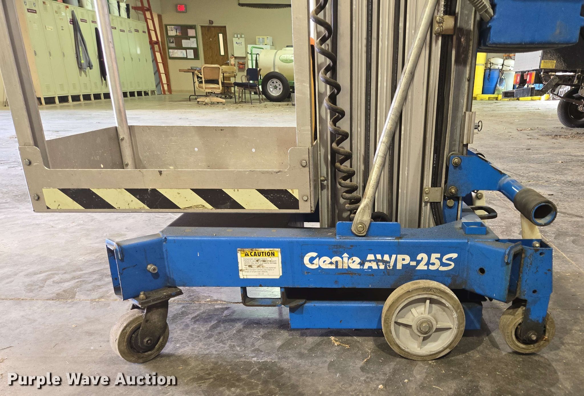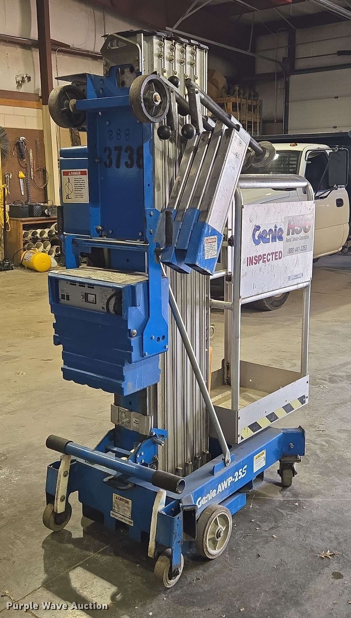 Genie AWP-25S vertical lift. Unit #: 3738. Features Maximum lift capacity: 350 lbs, Maximum lift height: 25', Platform: 25.5" L x 19.5" W, AC power outlet, Controls: Platform, Ground. Tires Solid. Notes Lifting issues, Key issues, broken inside switch, Non-operational unit. Pittsburg State University. Pittsburg, KS 66762