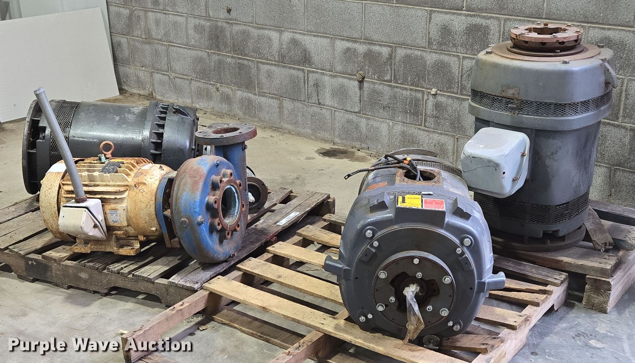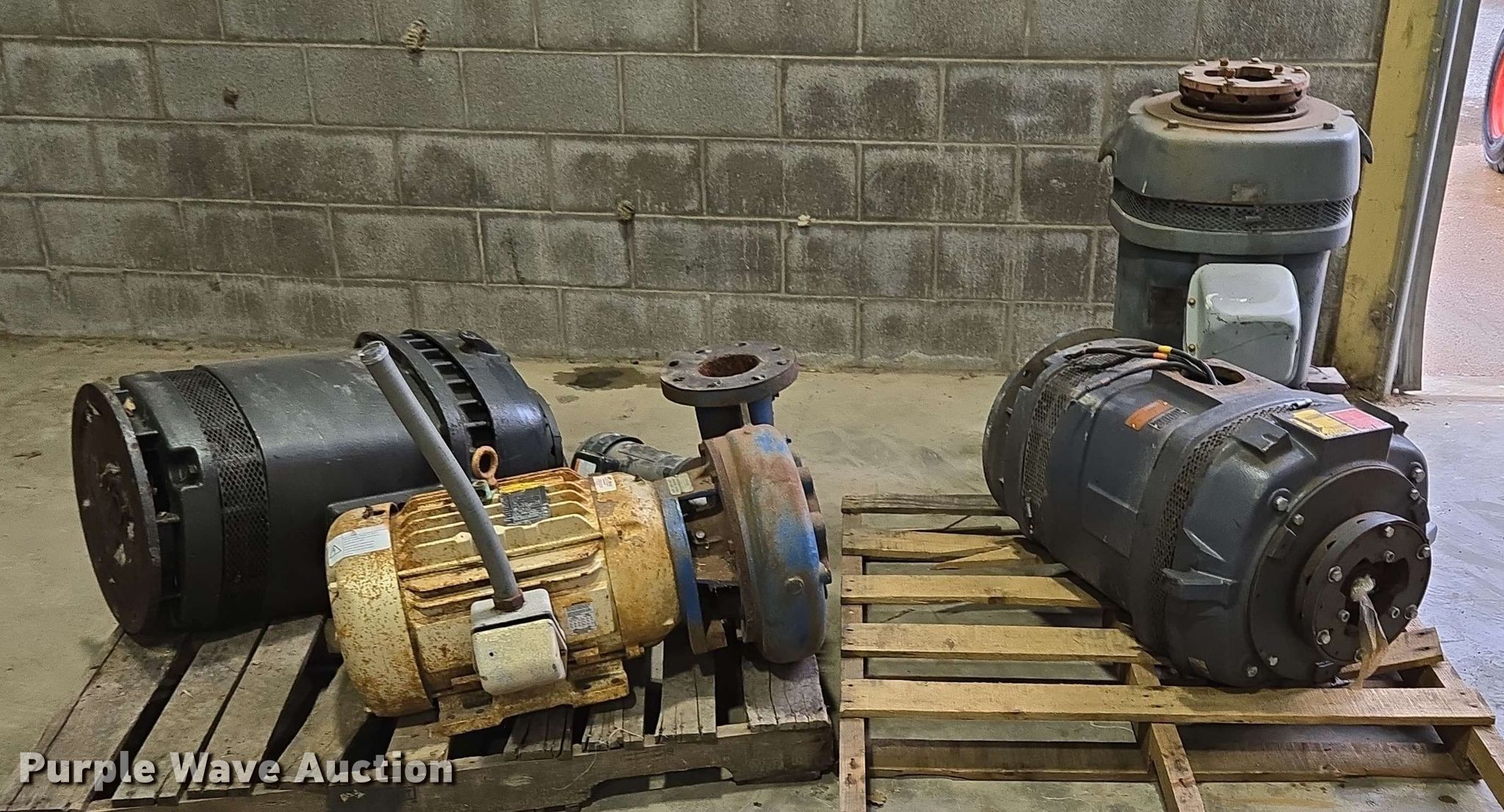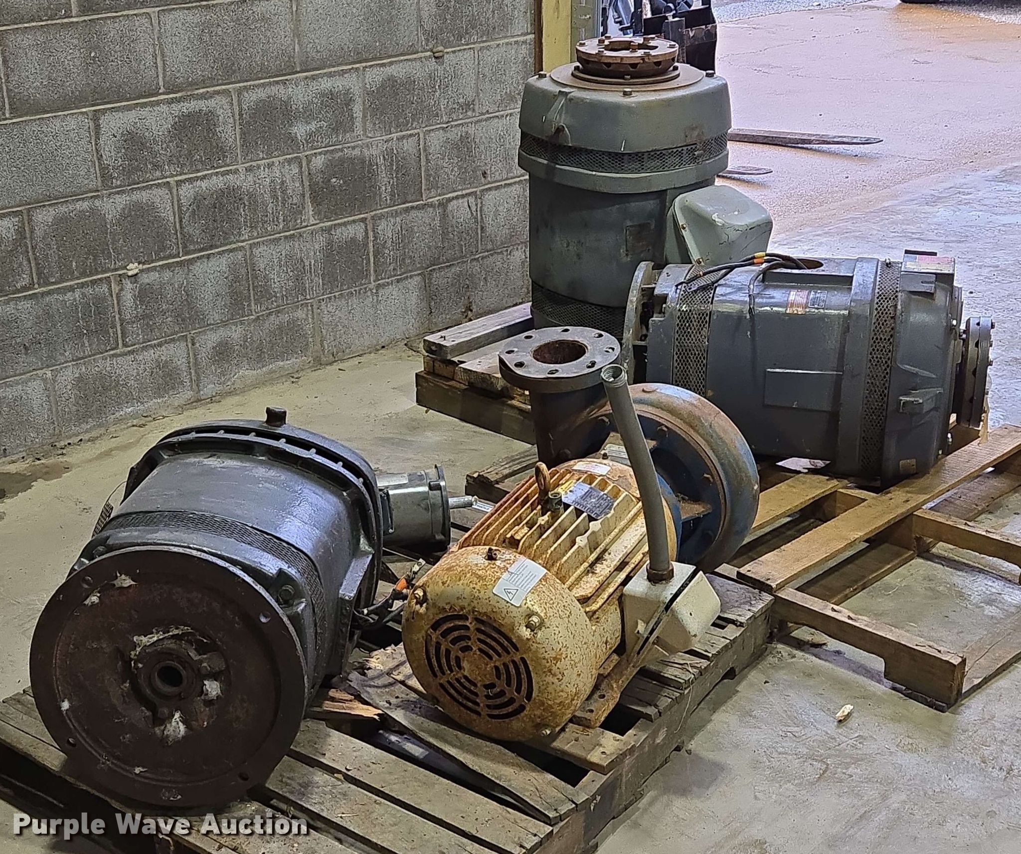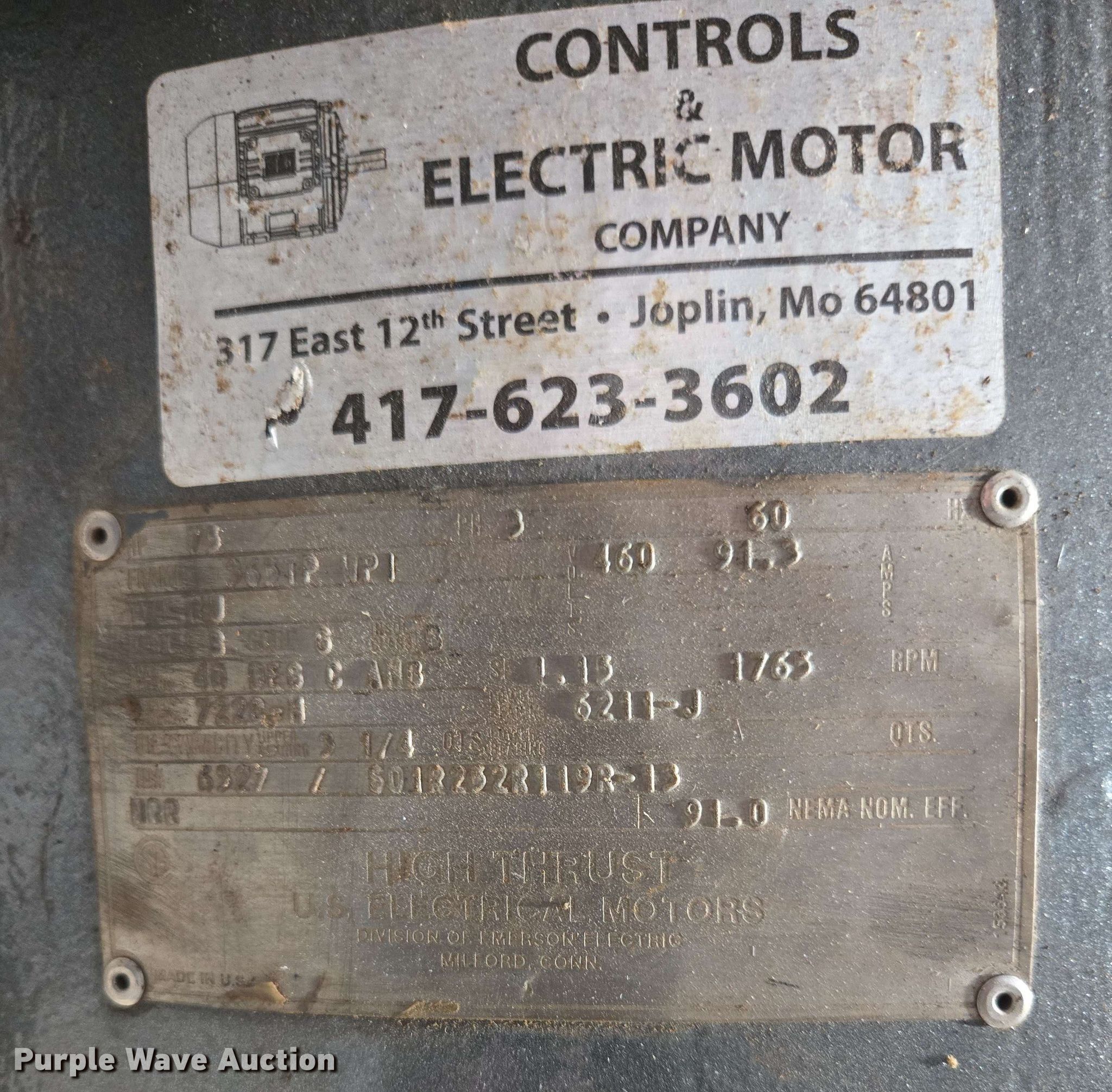 Purple Wave is selling a used Electric Motor in Kansas. This item is a (5) electric motors with the following: NIDEC Motor Corporation BF64A, HP: 75, Volts: 230/460, Phase: 3, Baldor Reliance Super-E, HP: 20, Volts: 230/460, Phase: 3, Pentair Aurora 391BF centrifugal pump, Serial: AS41409, GPM: 700,, High Thrust U.S Electrical Motors, HP: 75, Volts: 460, Phase: 3, Dayton 4THX3, HP: 1, Volts: 208-230/460, Phase: 3, Unknown make