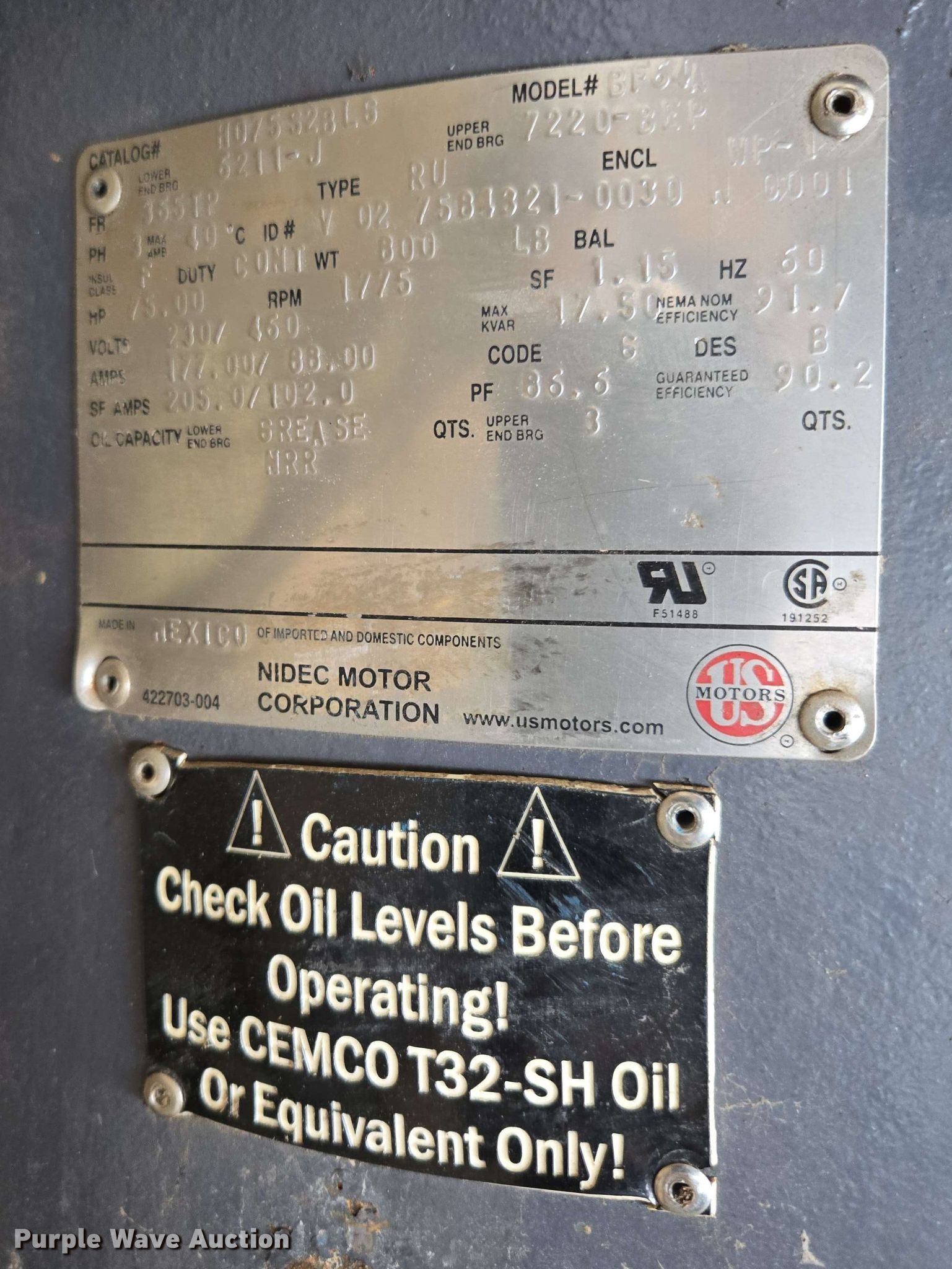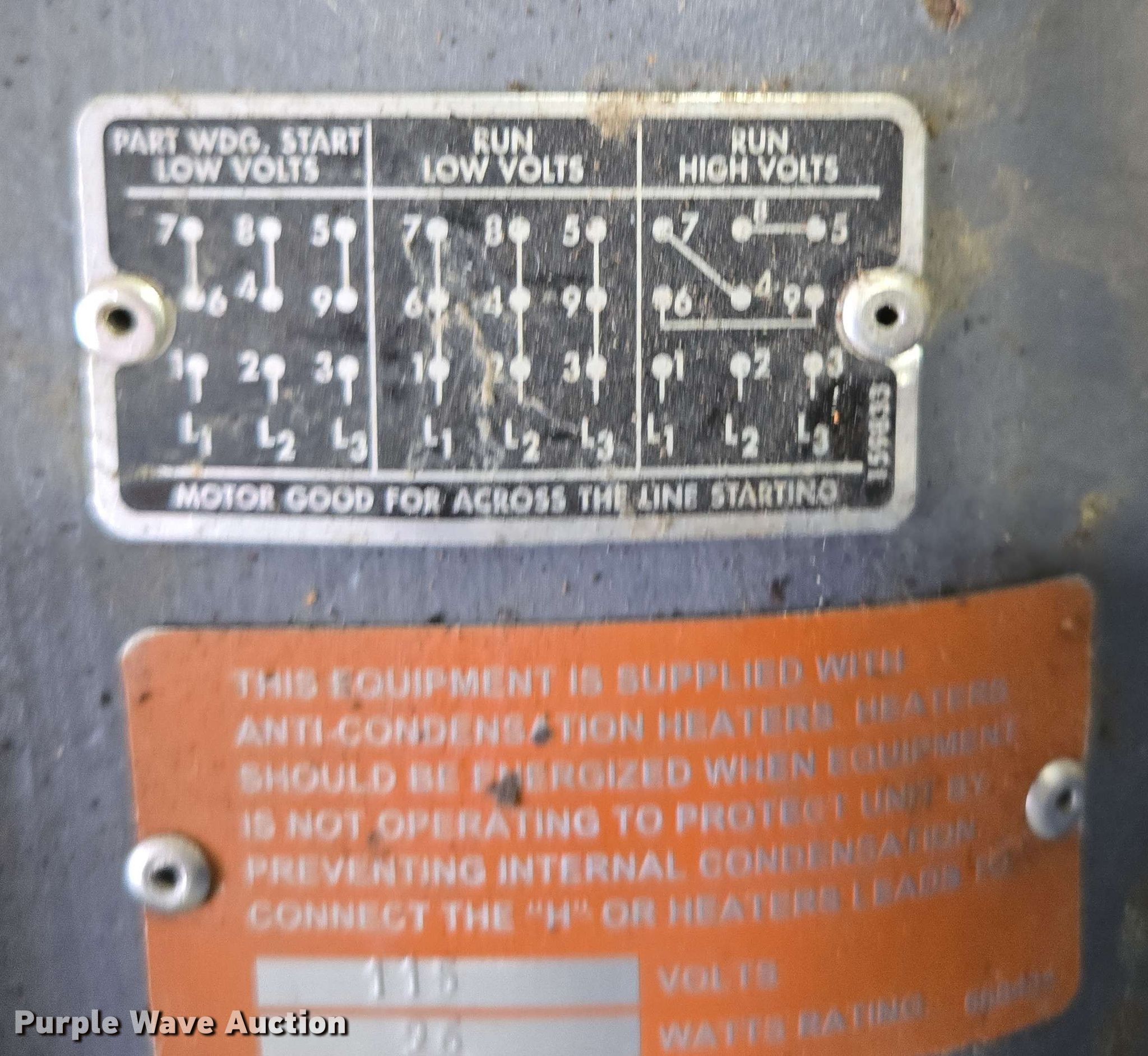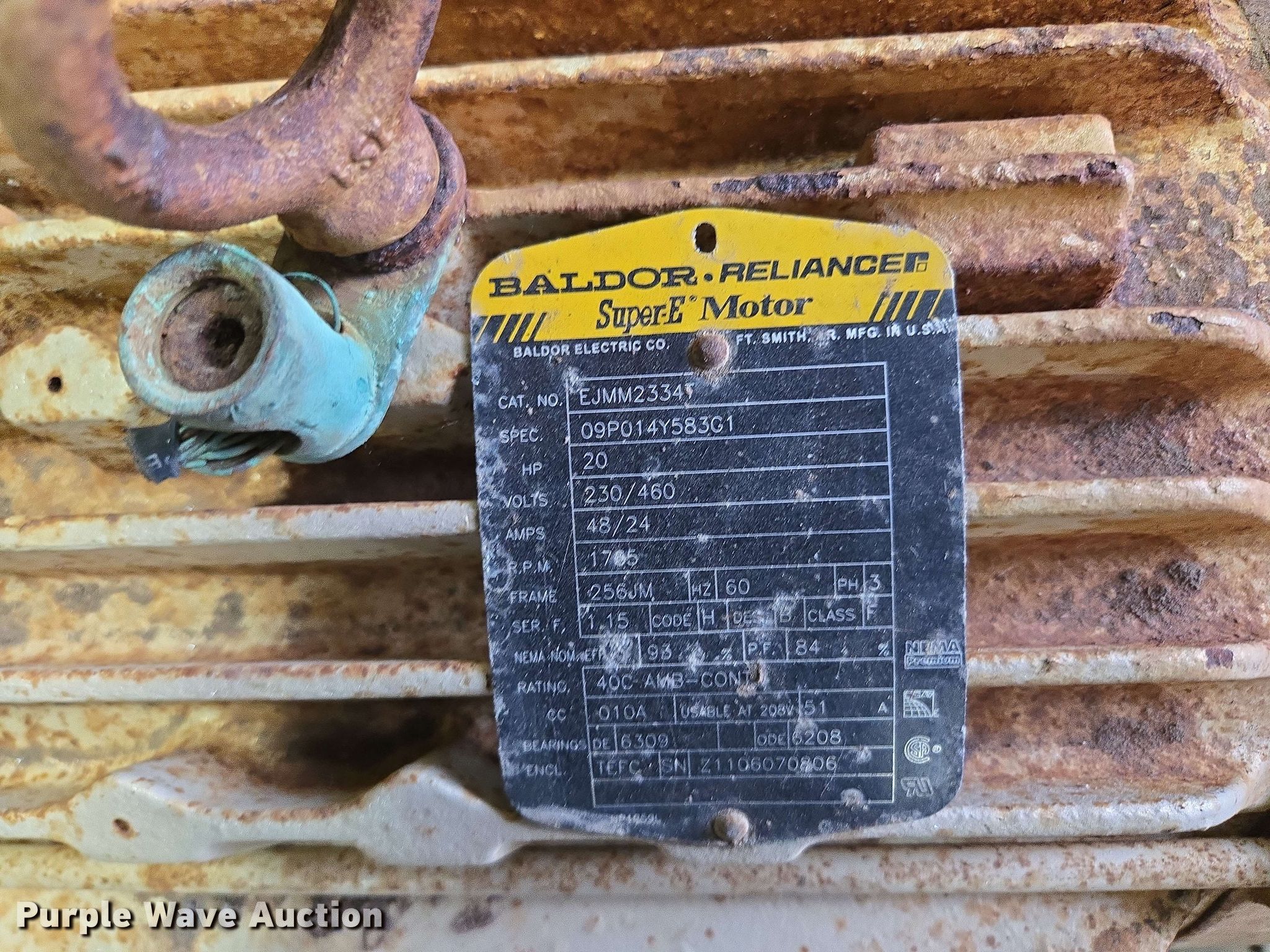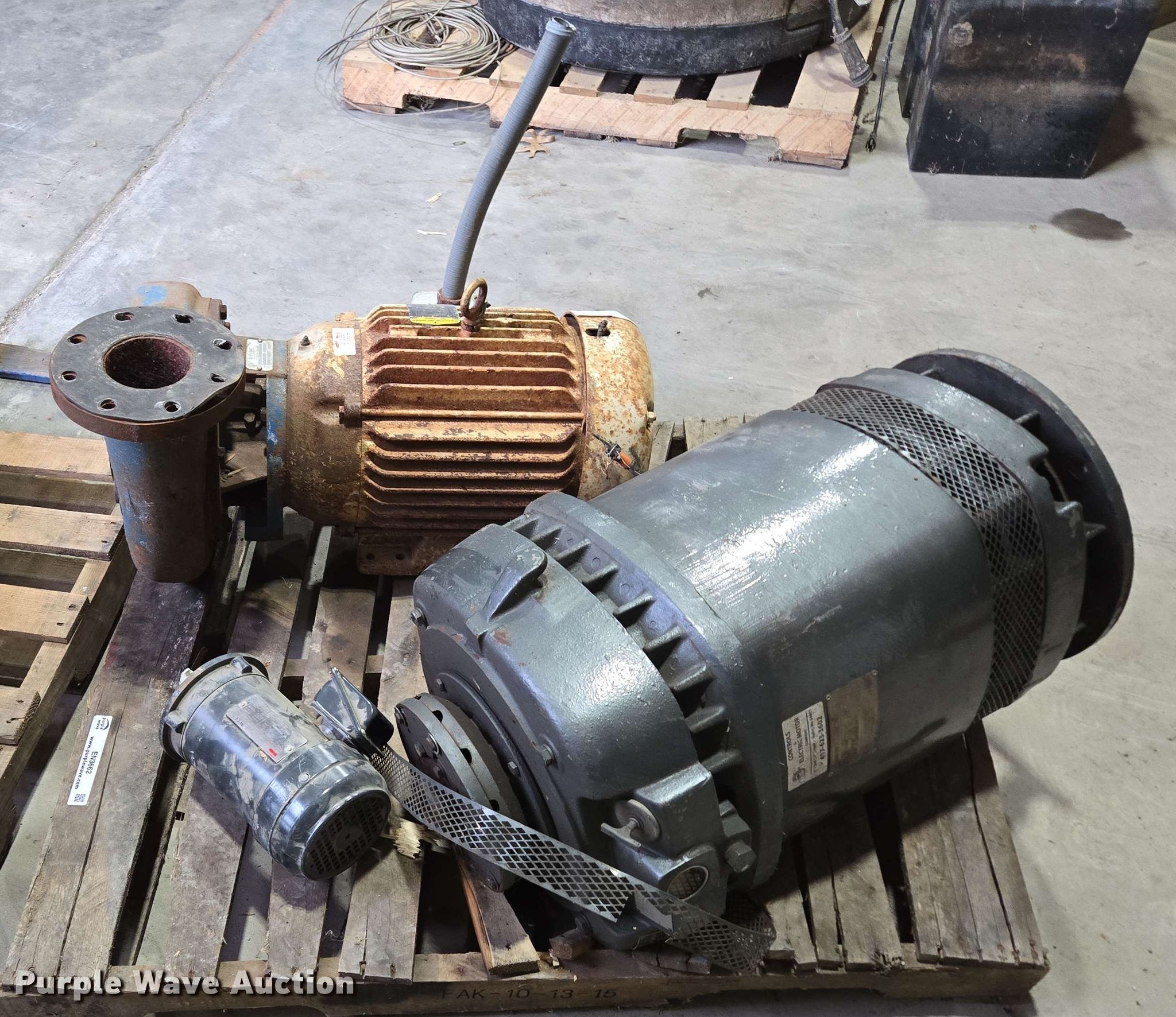 Purple Wave is selling a used Electric Motor in Kansas. This item is a (5) electric motors with the following: NIDEC Motor Corporation BF64A, HP: 75, Volts: 230/460, Phase: 3, Baldor Reliance Super-E, HP: 20, Volts: 230/460, Phase: 3, Pentair Aurora 391BF centrifugal pump, Serial: AS41409, GPM: 700,, High Thrust U.S Electrical Motors, HP: 75, Volts: 460, Phase: 3, Dayton 4THX3, HP: 1, Volts: 208-230/460, Phase: 3, Unknown make