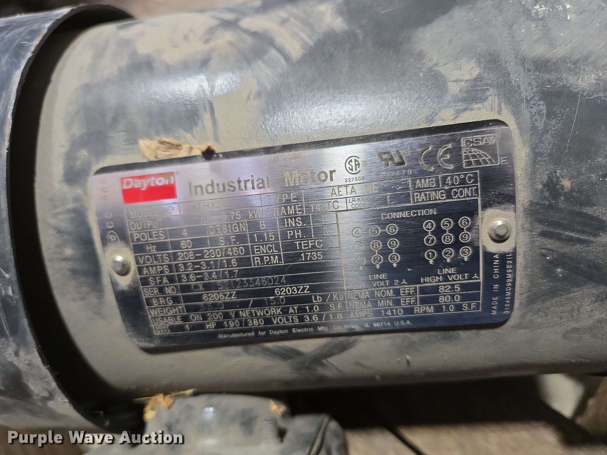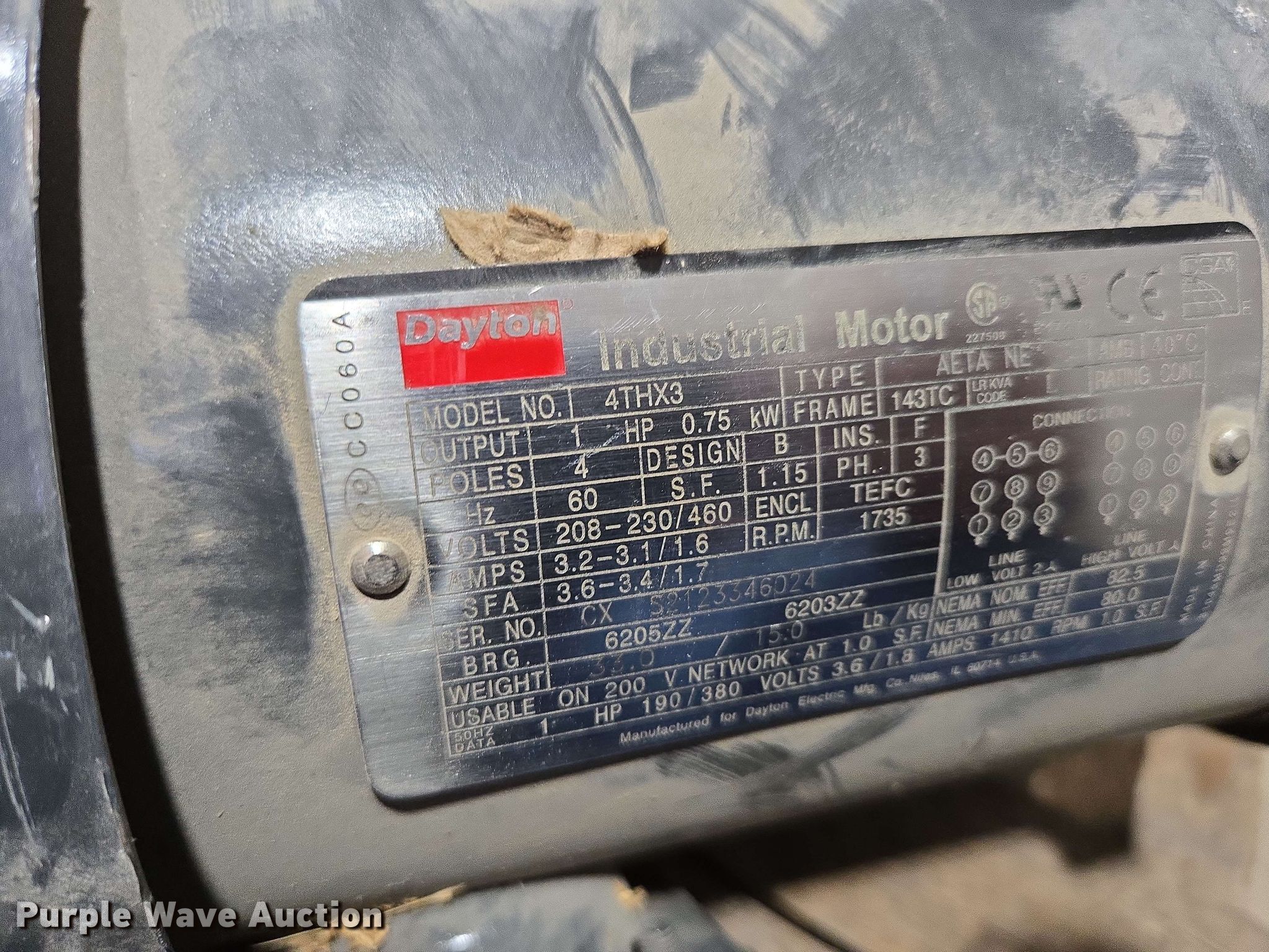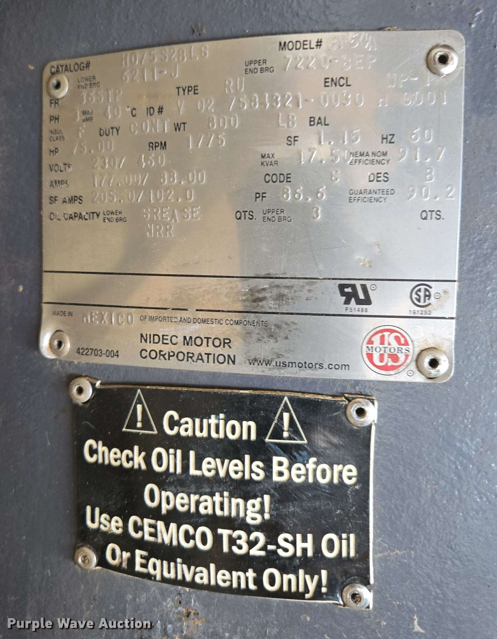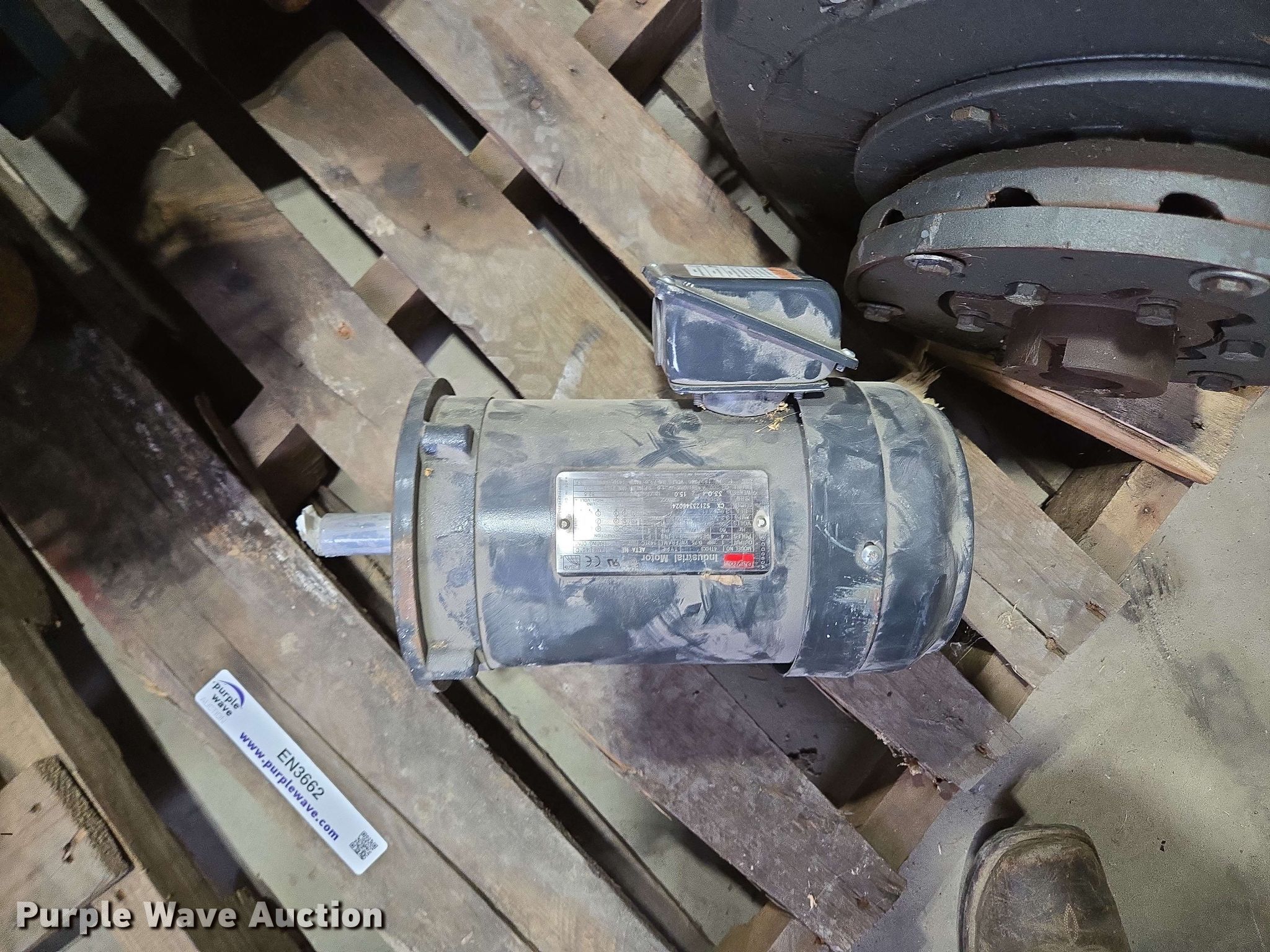 Purple Wave is selling a used Electric Motor in Kansas. This item is a (5) electric motors with the following: NIDEC Motor Corporation BF64A, HP: 75, Volts: 230/460, Phase: 3, Baldor Reliance Super-E, HP: 20, Volts: 230/460, Phase: 3, Pentair Aurora 391BF centrifugal pump, Serial: AS41409, GPM: 700,, High Thrust U.S Electrical Motors, HP: 75, Volts: 460, Phase: 3, Dayton 4THX3, HP: 1, Volts: 208-230/460, Phase: 3, Unknown make
