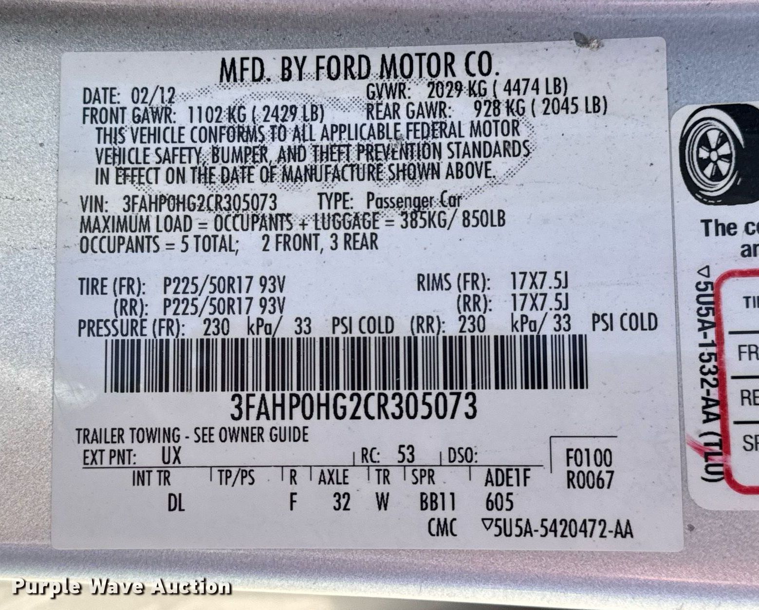 • VIN: 3FAHP0HG2CR305073