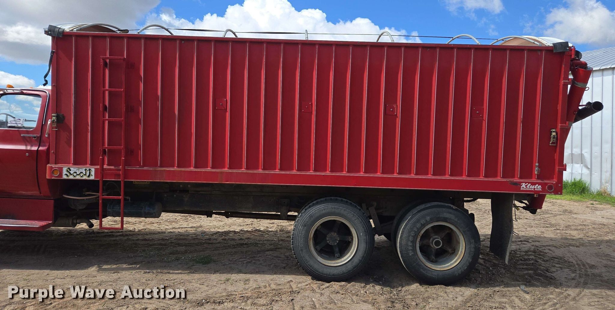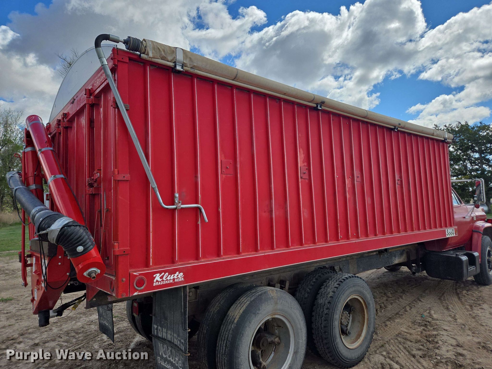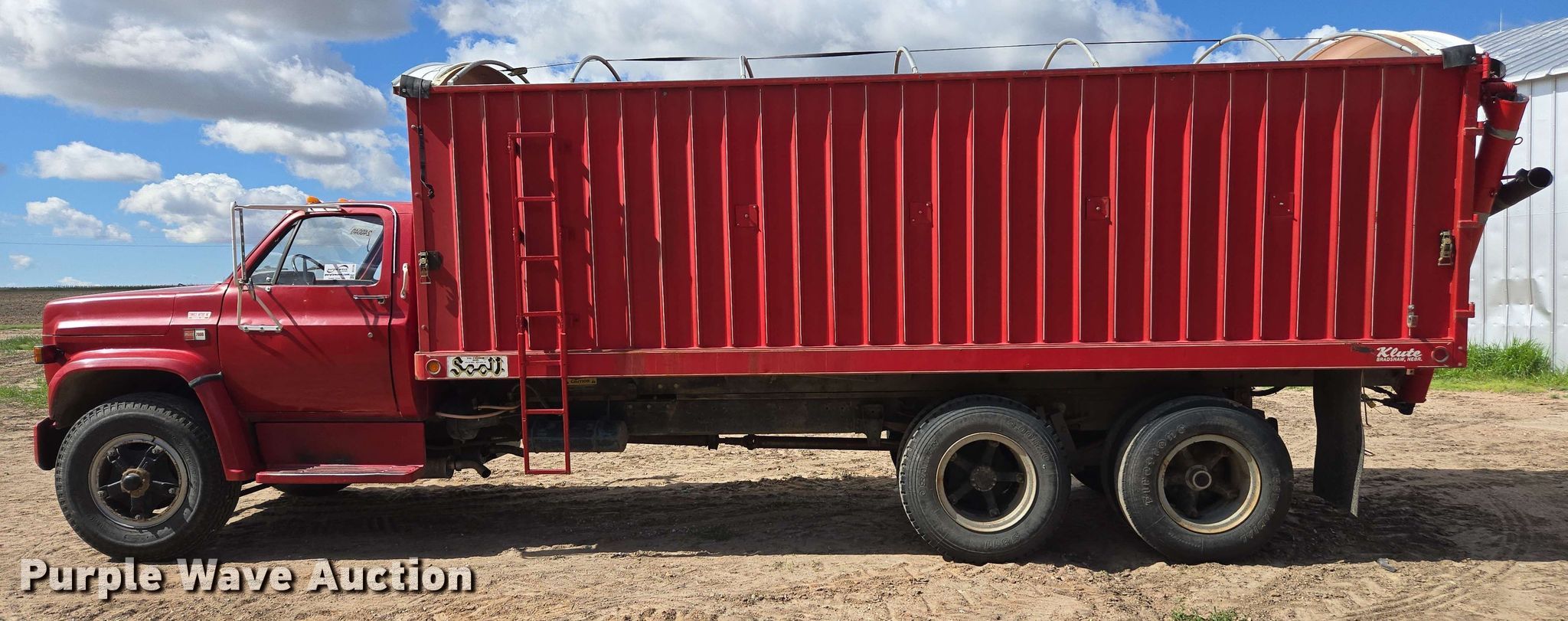1986 GMC 7000 grain truck. Miles: 70,000 on odometer, VIN: 1GDL7D1BXGV524961. Engine Displacement: 6.0L, Cylinders: 8, Fuel type: Gas. Transmission Manual, Speed: 5, plus 2. Chassis Axles: Tandem, Suspension: Spring, Brakes: Hydraulic, PTO, GVWR: 28,000 lbs FAWR: 9,000 lbs, RAWR: 19,000 lbs. Interior Heat. Features Dump bed Scott, 20' L x 96" W, Side height: 62", Bed type: Steel, Roll tarp, Ram: Dual, End gate: Manual, Auger Westfield Industries. Tires Front: 10.00-20, Rear: 9.00R20. Notes Windshield chipped or cracked. Kansas rebuilt salvage antique title. Title distribution may be delayed up to 30 days from verification of funds. Flipse Hay Service. Oakley, KS 67748