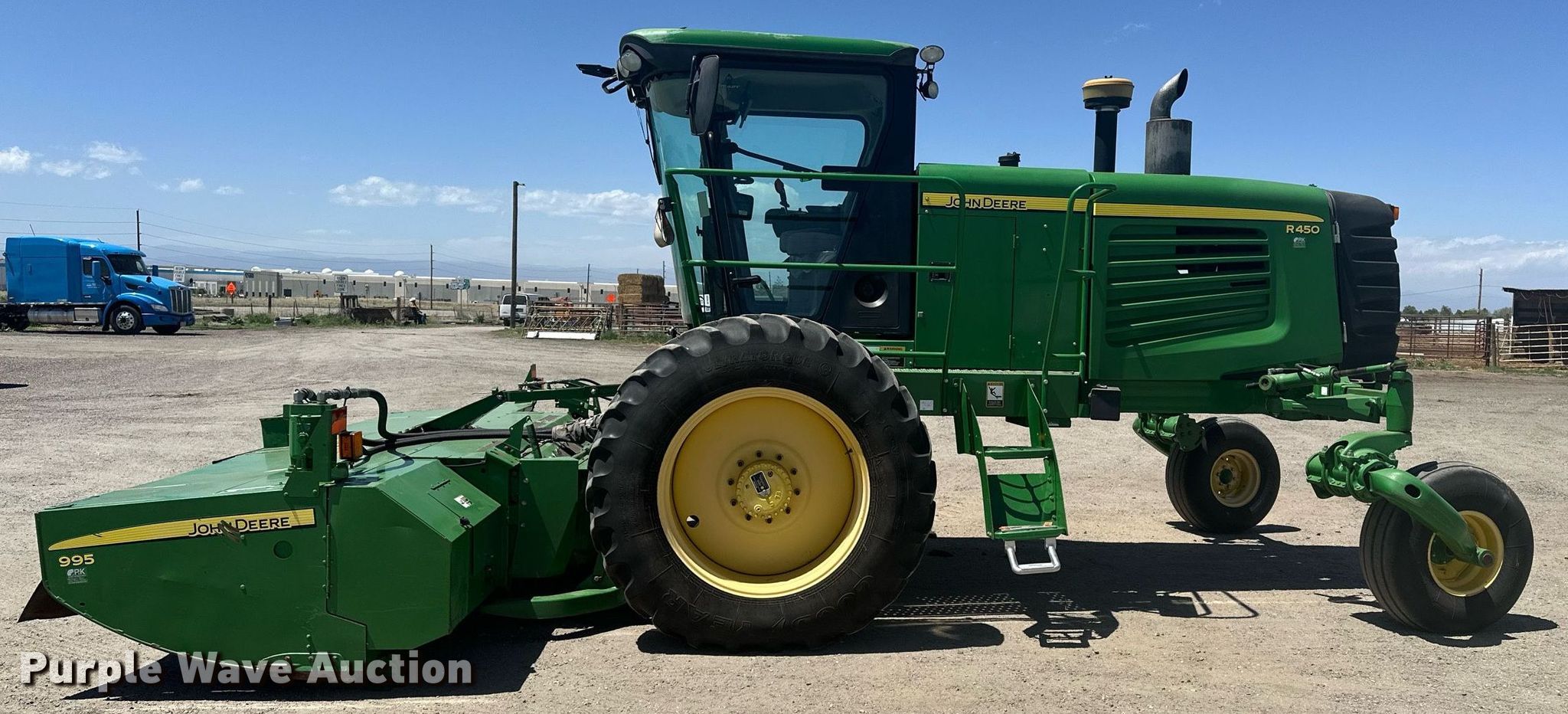 Purple Wave is selling a used Windrower Self Propelled in Colorado. This item is a 2013 John Deere R450 swather / windrower with the following: Engine hours: 1,976 on meter, Header hours: 1,254 on meter, Serial: 1E0R450XVDD391213