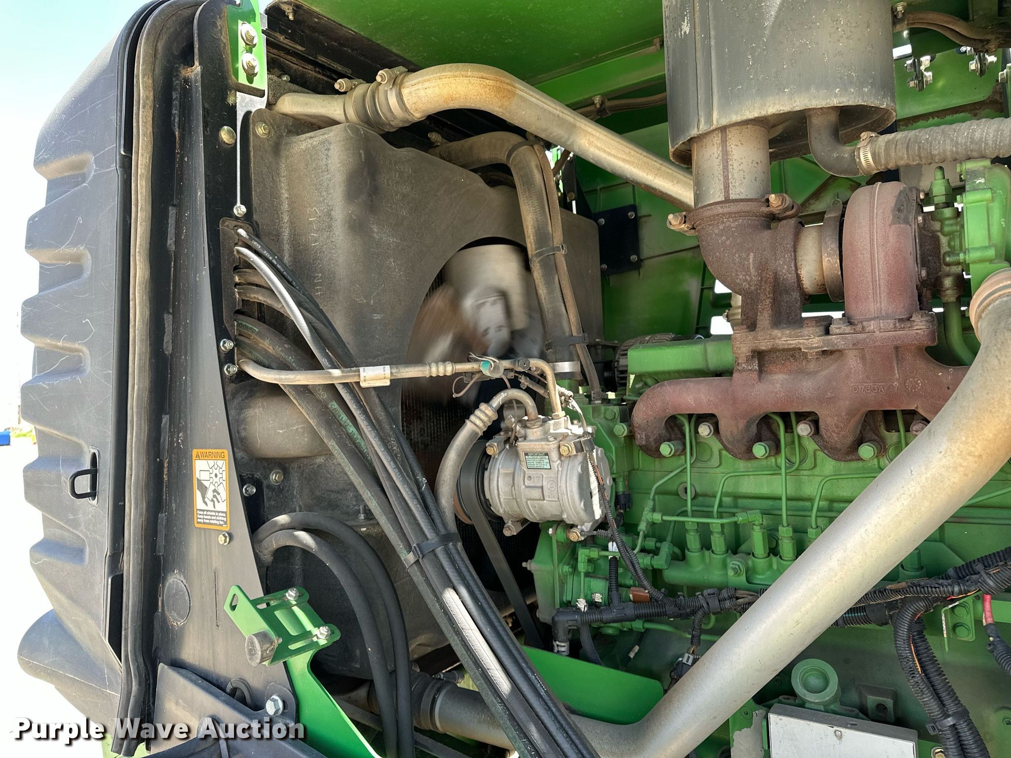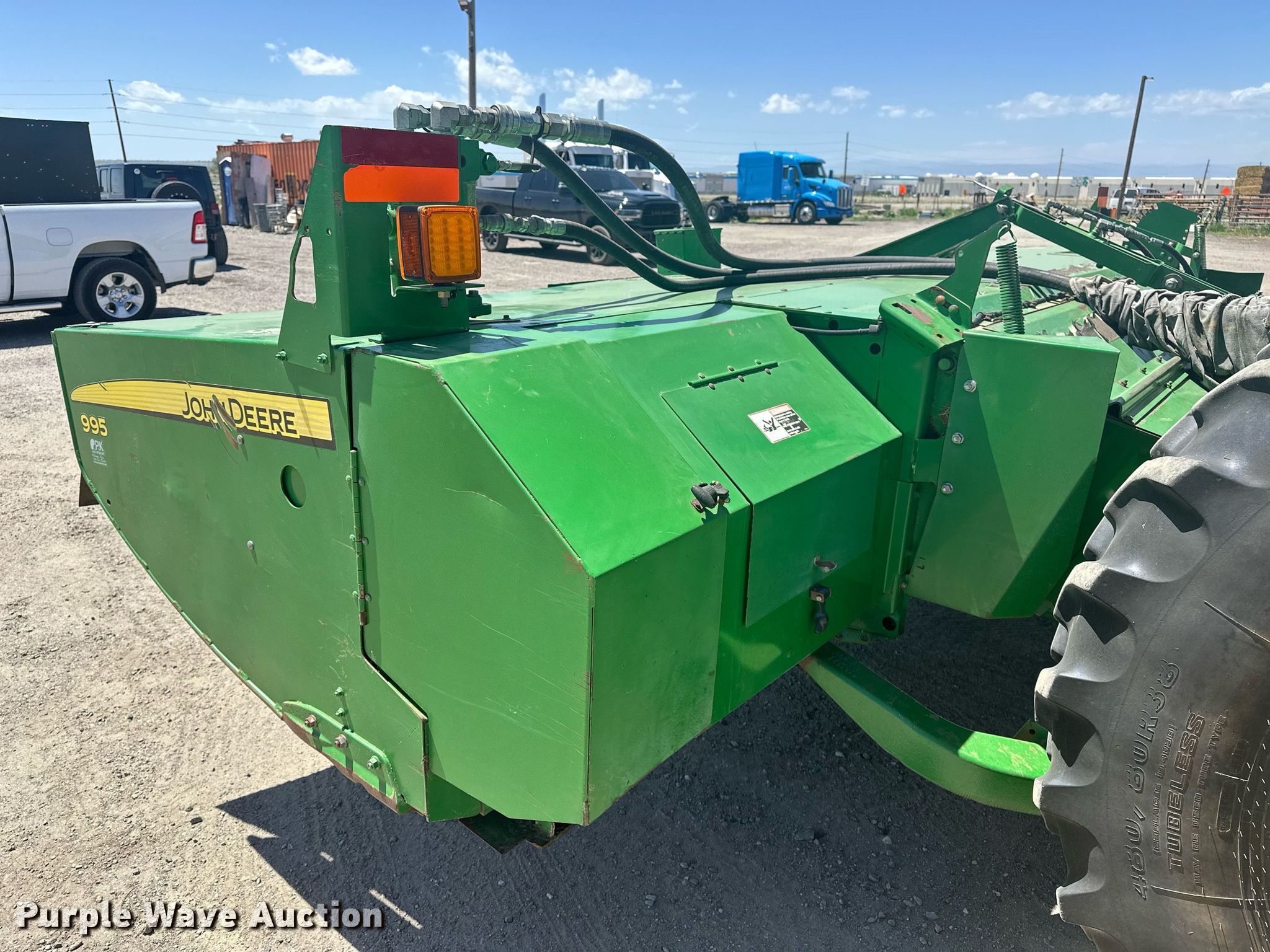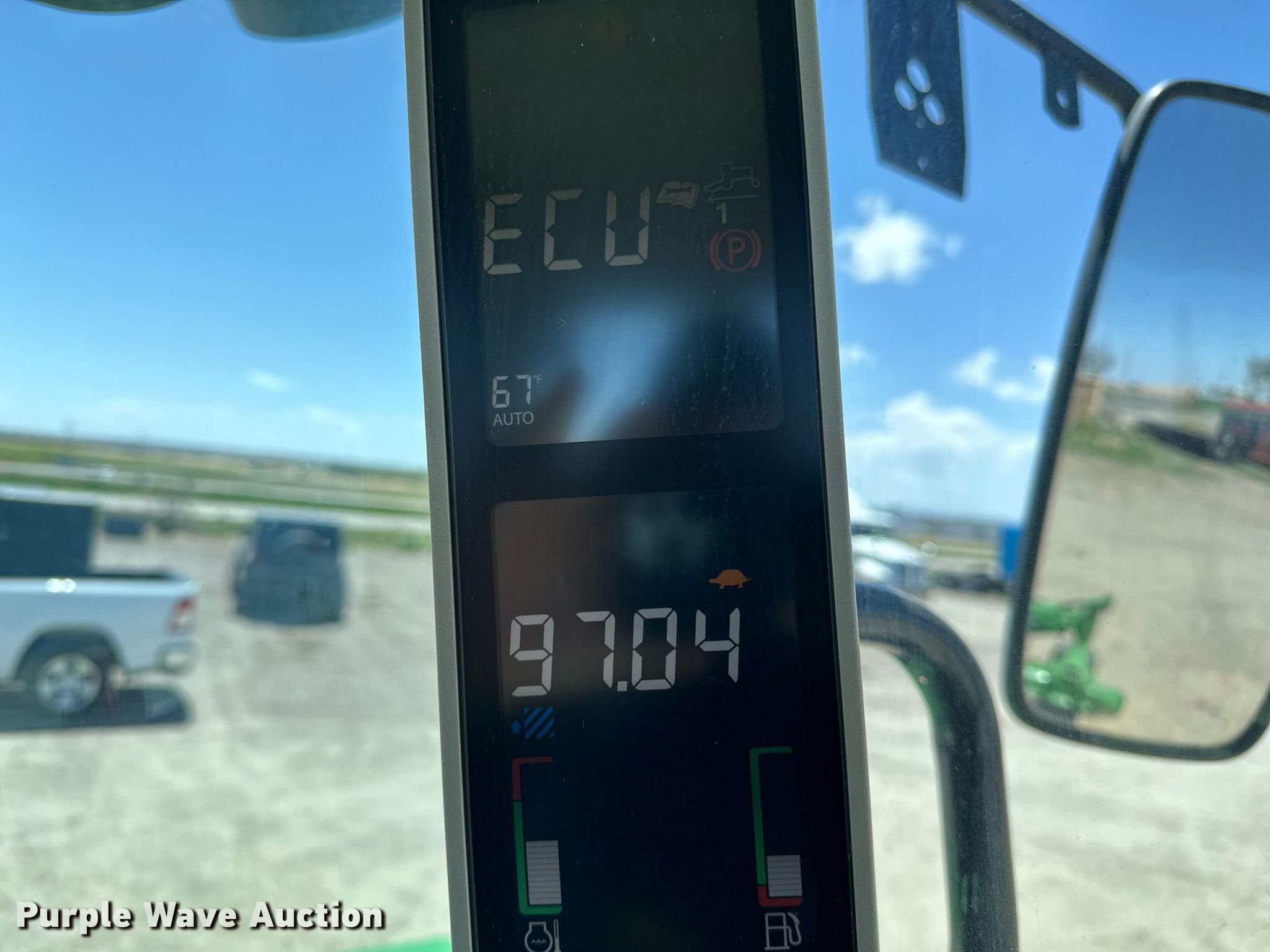 2013 John Deere R450 swather / windrower. Engine hours: 1,976 on meter, Header hours: 1,254 on meter, Serial: 1E0R450XVDD391213. Engine John Deere 6068HE051, Serial: PE6068L916524, Displacement: 6.8L, Cylinders: 6, Fuel type: Diesel. Transmission Hydrostatic, Two speed travel. Operators station AC, Heat. Features Electronics Auto steer John Deere AutoTrac Universal Steering Kit 200, Head Disc, John Deere 995, Serial: 1E00995TLDD390539, Width: 16', Hydraulic head tilt, Conditioners: Flail, Suitcase weights: 4. Tires Front: 480/80R38, Rear: 14L-16.1SL. Notes Dash warning indicator: ECU 97.03, ECU 97.04, MHC-Platform reverse switch stuck closed, MHC-Quick stop switch stuck closed. Elmer Hamann Retirement Auction. Aurora, CO 80011