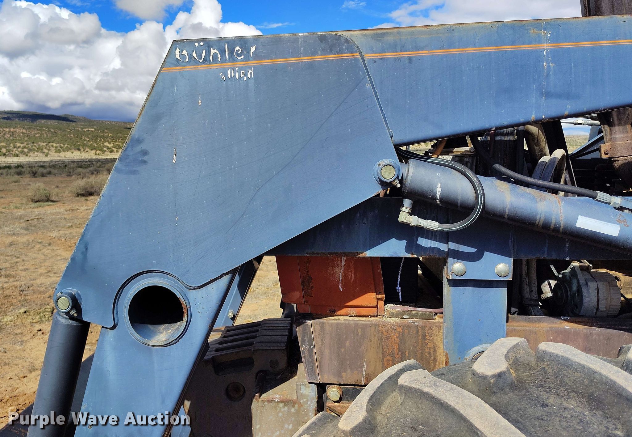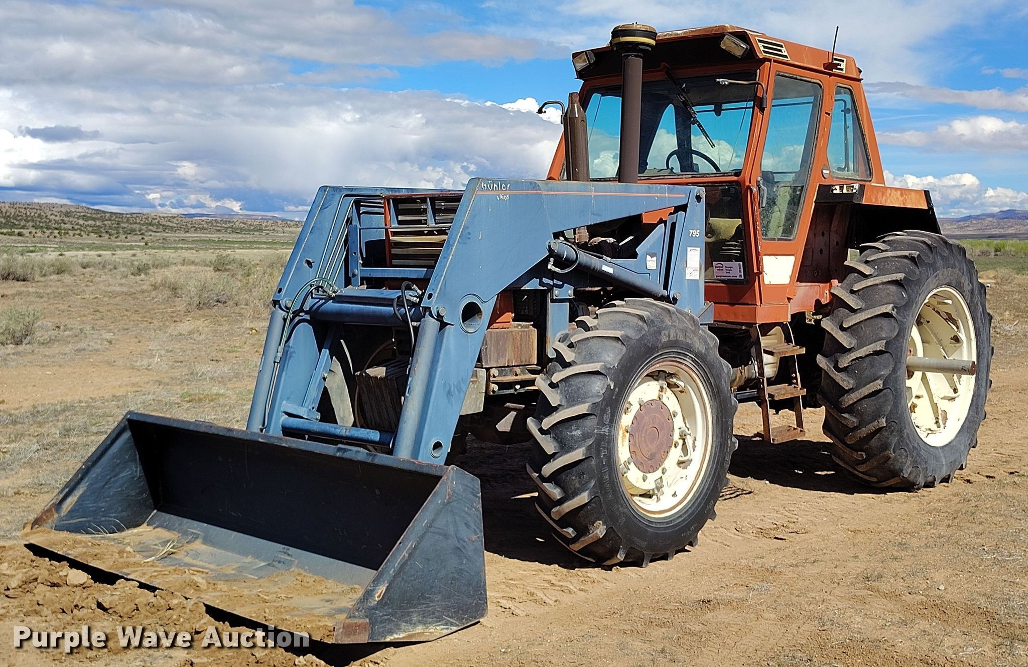 Fiat 1280DT tractor. Hours: 4,105 on meter, Serial: 760799. Engine Fiat 8065, Displacement: 5.5L, Cylinders: 6, Fuel type: Diesel. Transmission Manual, 12F - 4R, Differential lock. Operators station AC, Heat. Features PTO: 1000, Three point, Rear: 2, Suitcase weights: 5, Loader Buhler 795, Controls: Joystick, Bucket Width: 96".. Tires Front: 14.95-28, Rear: 18.4-38. Notes Non-operational AC, Non-operational three point. Eagle's Bluff Ranch. Egnar, CO 81325