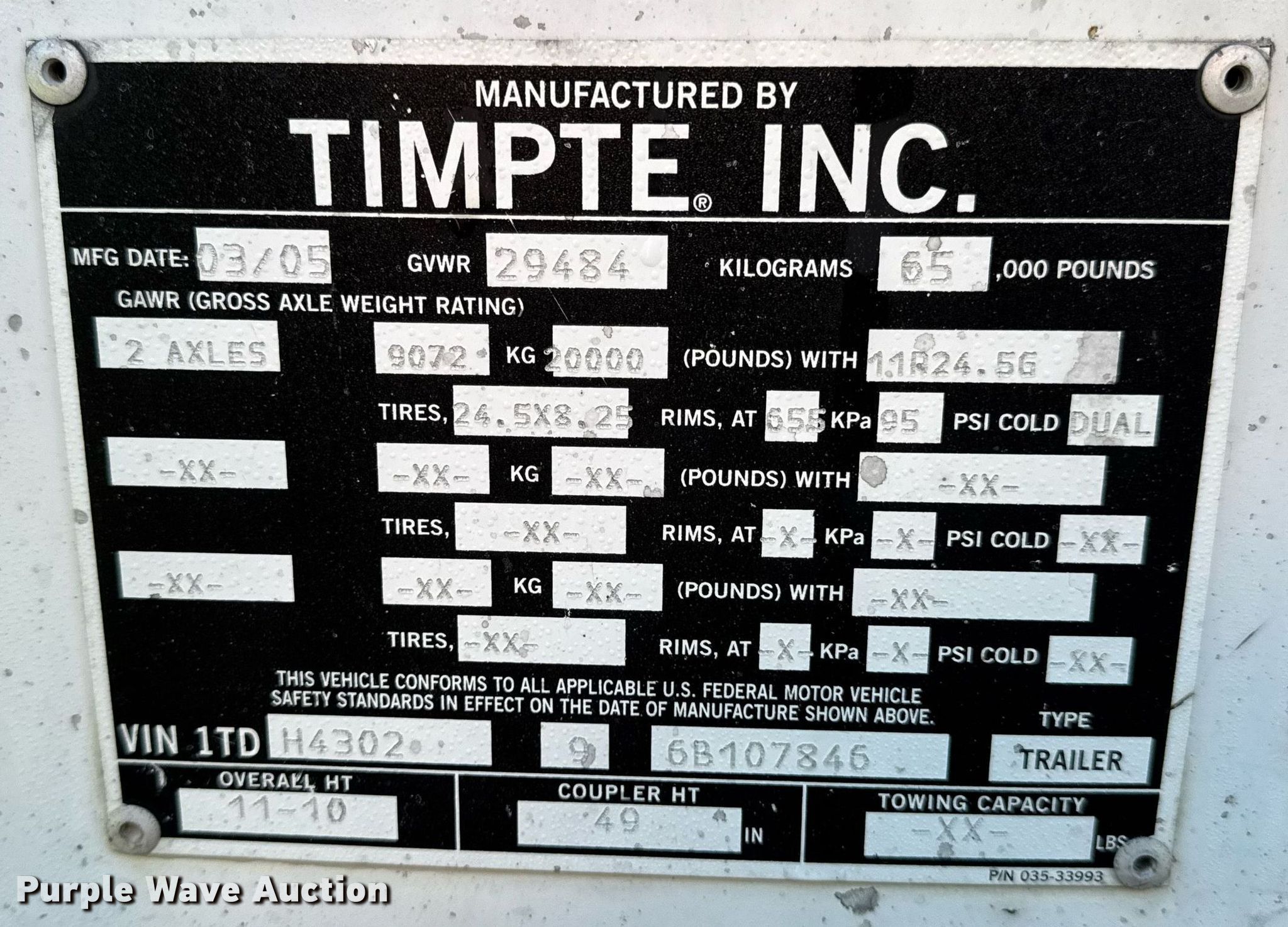 2006 Timpte Super Hopper grain trailer. VIN: 1TDH430296B107846. Dimensions Overall: 45' 1" L x 102" W, Body: 43' L x 99" W, Side height: 81". Features Body type: Aluminum, Hoppers: Double Trap gates: Manual, Floor: Belted bottom Belt/ chain width: 32", Roll tarp. Chassis Landing gear: Dual, Suspension: Air, Brakes: Air, Axles: Tandem, GVWR: 65,000 lbs, GAWR: 20,000 lbs. Tires Aluminum wheels, Size: 11R24.5. Notes Semi truck not included, Non-operational landing gear. Missouri title. Title distribution may be delayed up to 14 days from verification of funds. Carter Trucking. Urbana, MO 65767