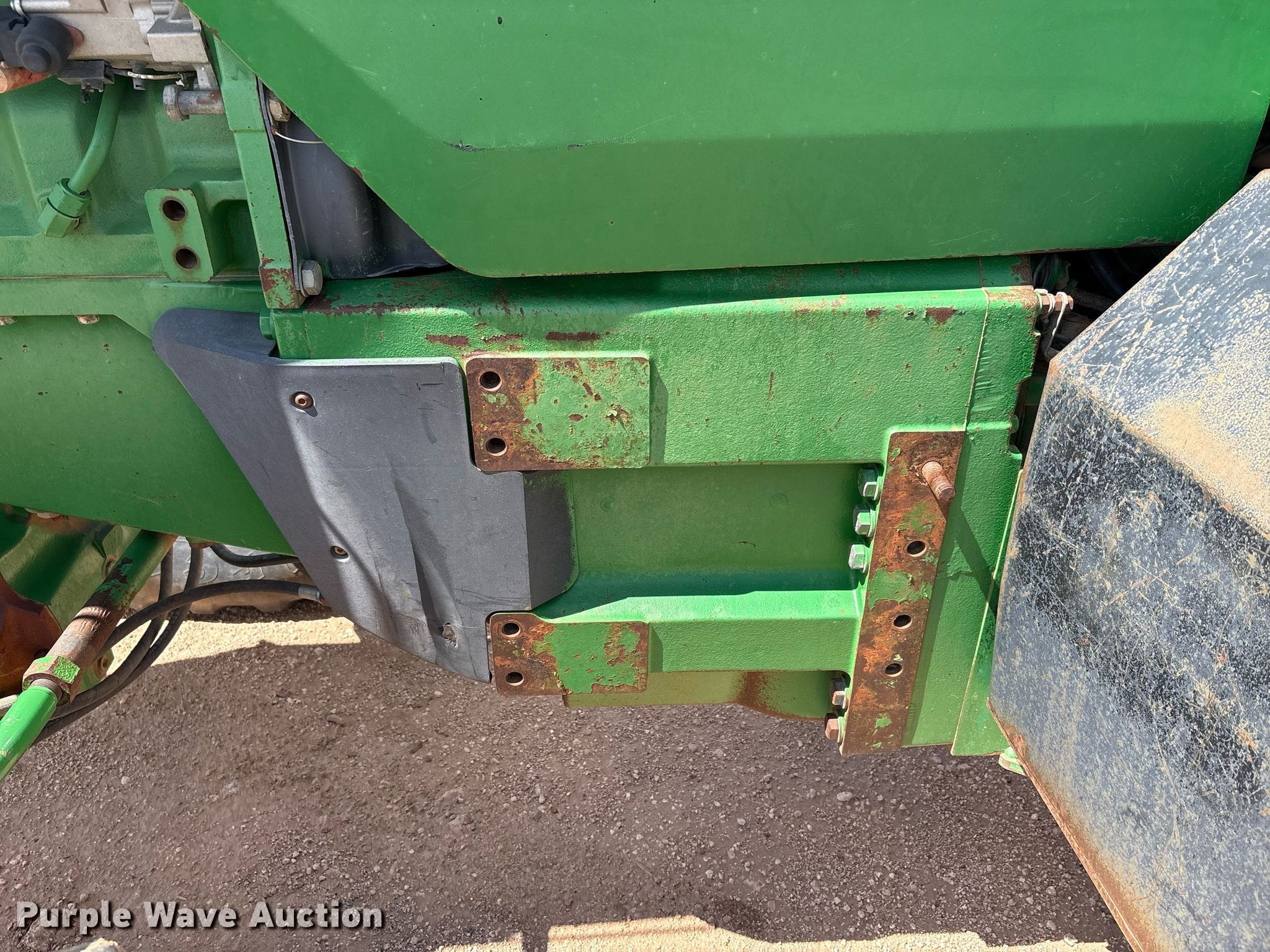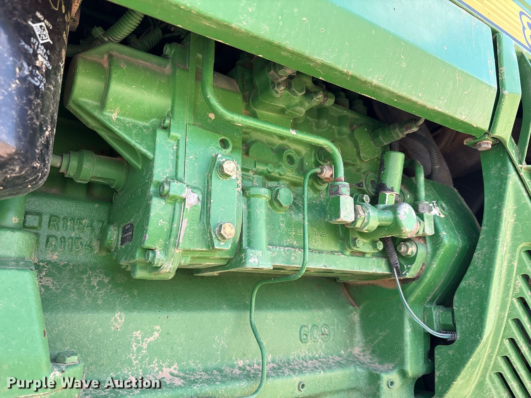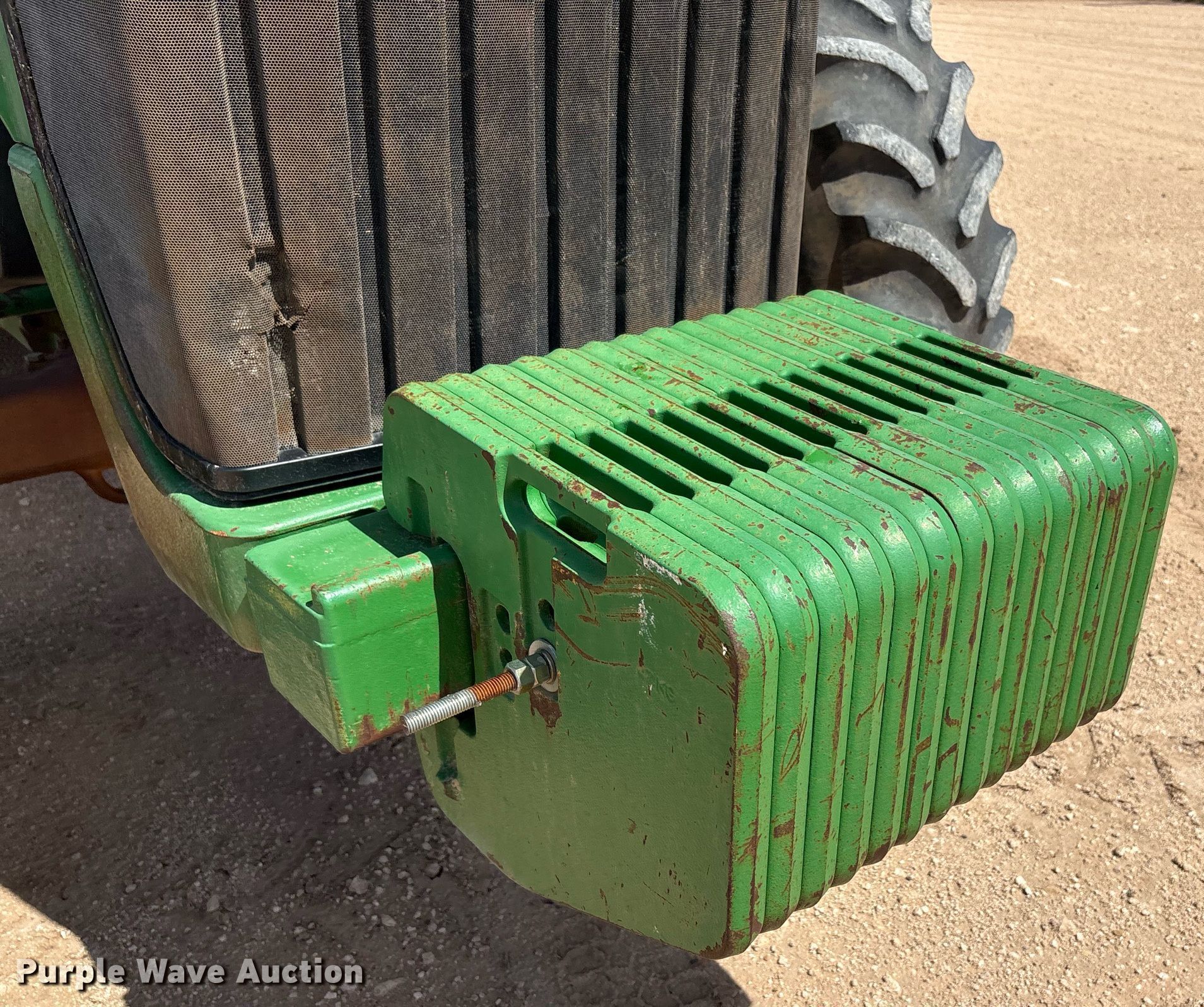 1998 John Deere 8400 MFWD tractor. Hours: 5,726 on meter, Serial: RW8400P022951. Engine John Deere 6081HRW17, Serial: RG6081H108164, Displacement: 8.1L, Cylinders: 6, Fuel type: Diesel. Transmission Powershift, 16F - 4R, Differential lock. Operators station AC, Heat. Features PTO: 1 3/4" 1000, Three point Top link, Quick attach, Seven pin outlet, Hydraulic remote sets Rear: 3, Suitcase weights: 14. Tires Front: 420/90R30, Rear: 480/80R46, Wheel weights: 2. Notes Warning indicator: Engine light. Harmon Farms. Lubbock, TX 79403