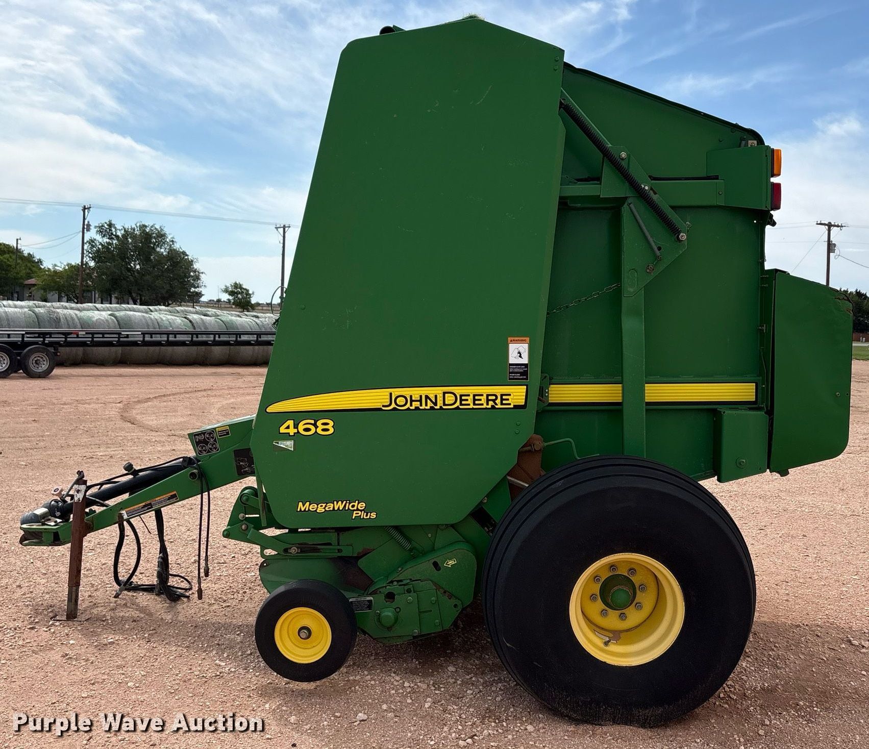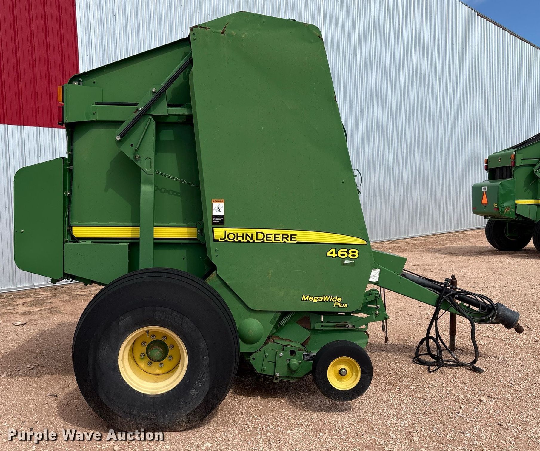 Purple Wave is selling a used Round Baler in Texas. This item is a 2007 John Deere 468 MegaWide Plus round baler with the following: Bale count: 13,685, Serial: E00468X332792