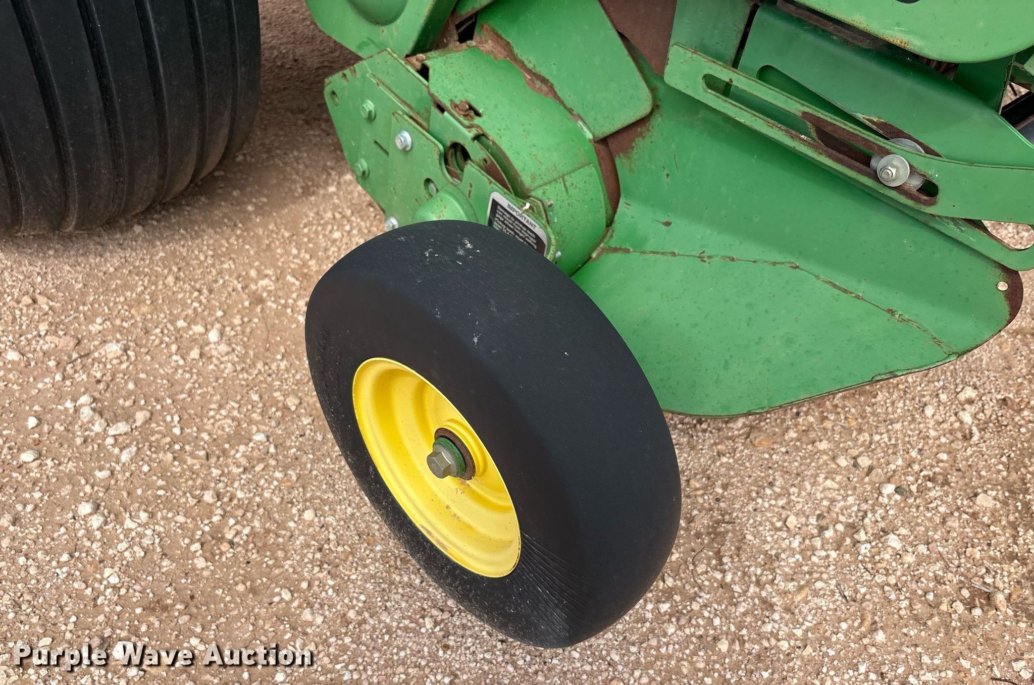 2007 John Deere 468 MegaWide Plus round baler. Bale count: 13,685, Serial: E00468X332792. Features PTO: 540, Monitor, Transport lights, Feed assist roller, Gauge wheels, Pickup width: 5', Hydraulic pickup lift, Bale size: 4' x 6', Auto-tie, Twin twine tie, Net-wrap, Bale kicker. Tires Size: 21.5L-16.1SL. Notes Unknown operating condition. Harmon Farms. Lubbock, TX 79403