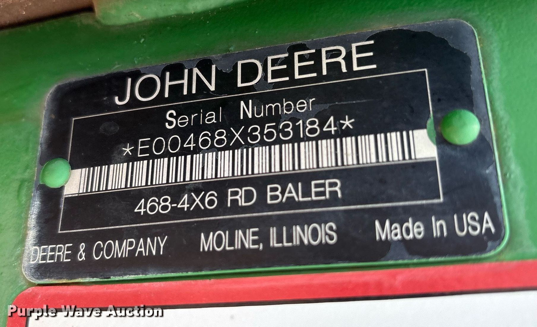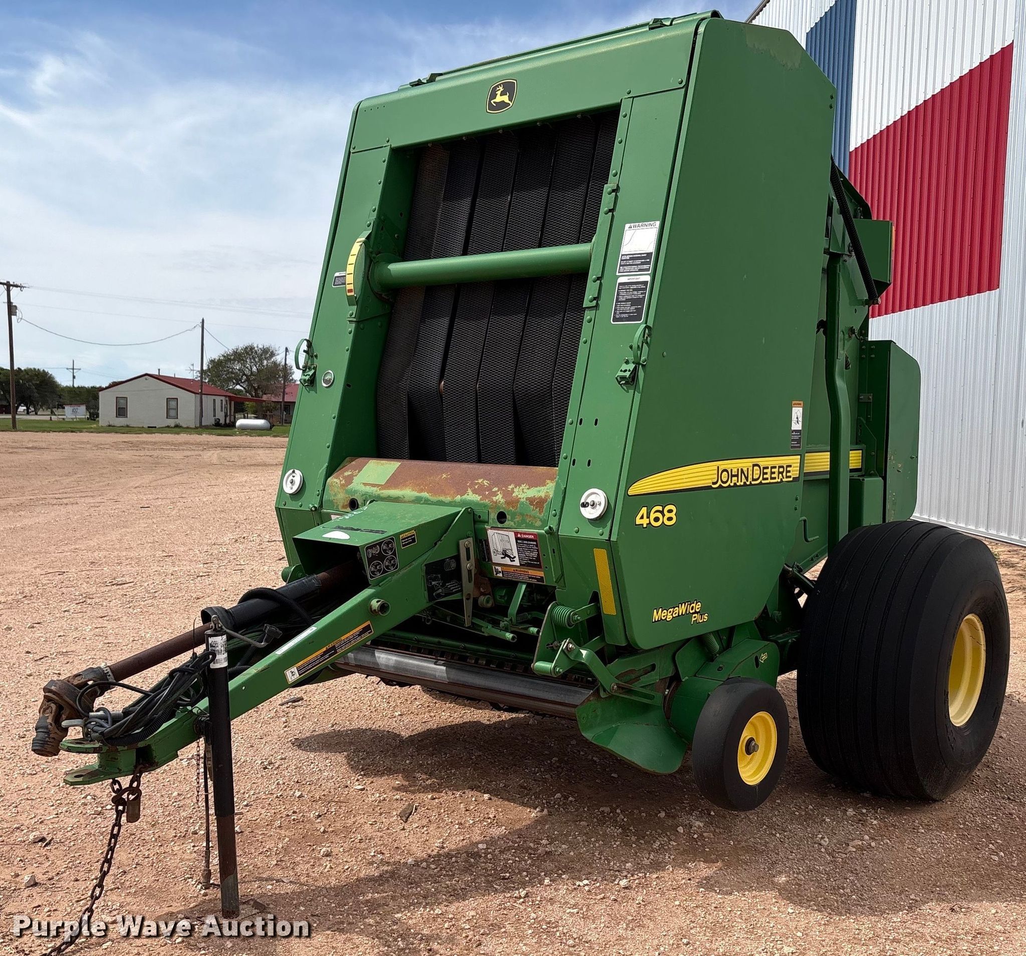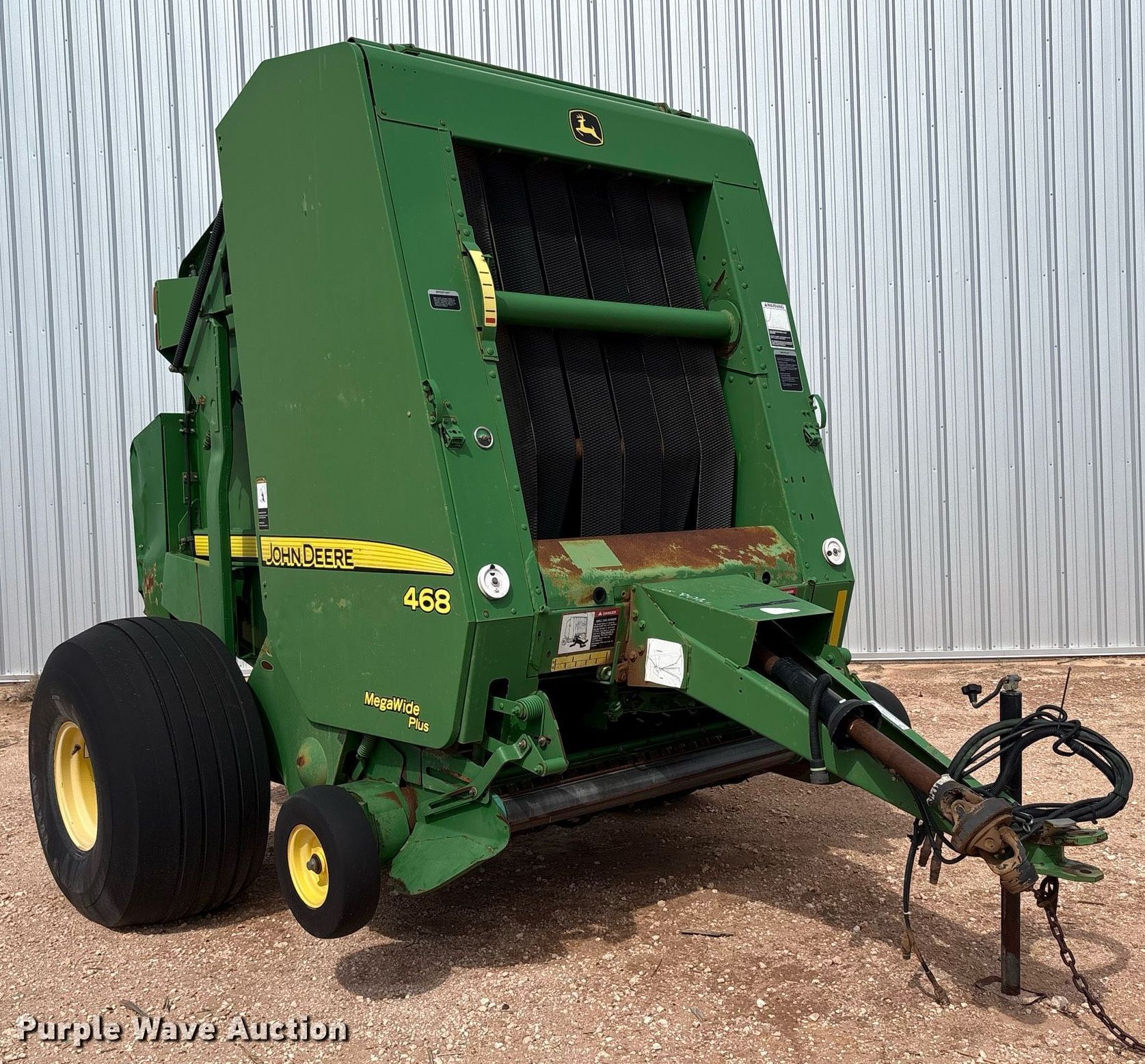 Purple Wave is selling a used Round Baler in Texas. This item is a 2009 John Deere 468 MegaWide Plus round baler with the following: Bale count: 6,162, Serial: E00468X353184