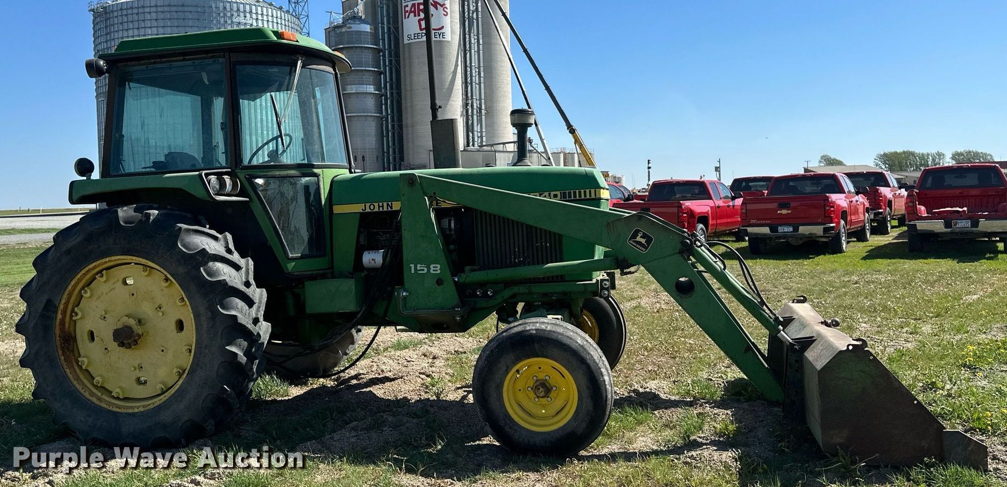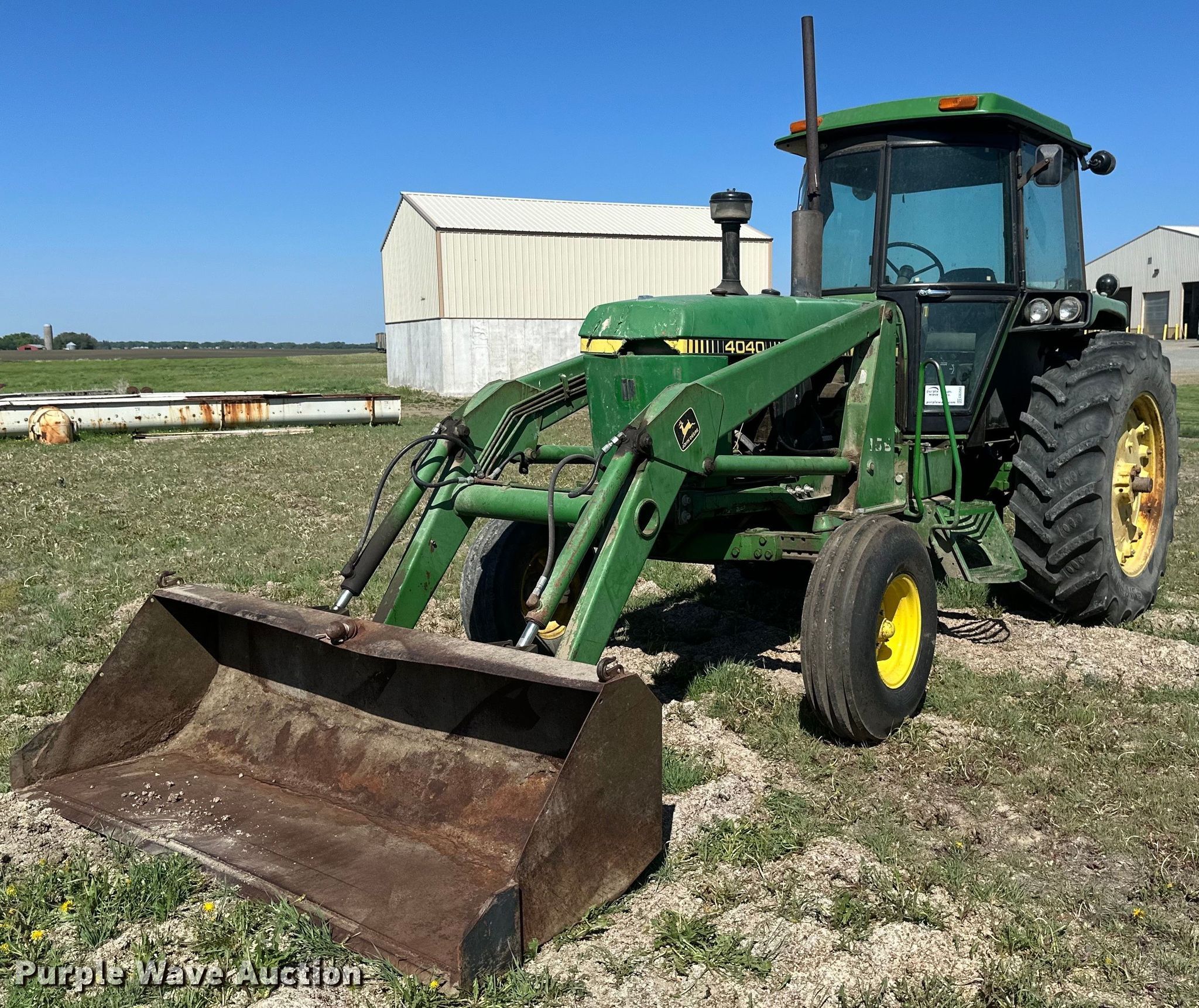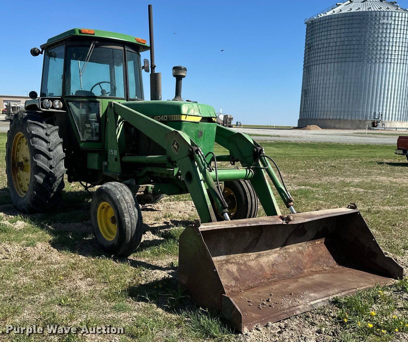 John Deere 4040 tractor. Hours: 8,806 on meter. Engine Cylinders: 6, Fuel type: Diesel. Transmission Quad-range, 16F - 6R, Differential lock. Operators station AC, Heat. Features PTO: 540, Three point Top link, Seven pin outlet, Rear: 3, Loader John Deere 158, Controls: Two-lever, Bucket Width: 84".. Tires Front: 10.00-16, Rear: 16.9R38. Christensen Family Farms. Sleepy Eye, MN 56085