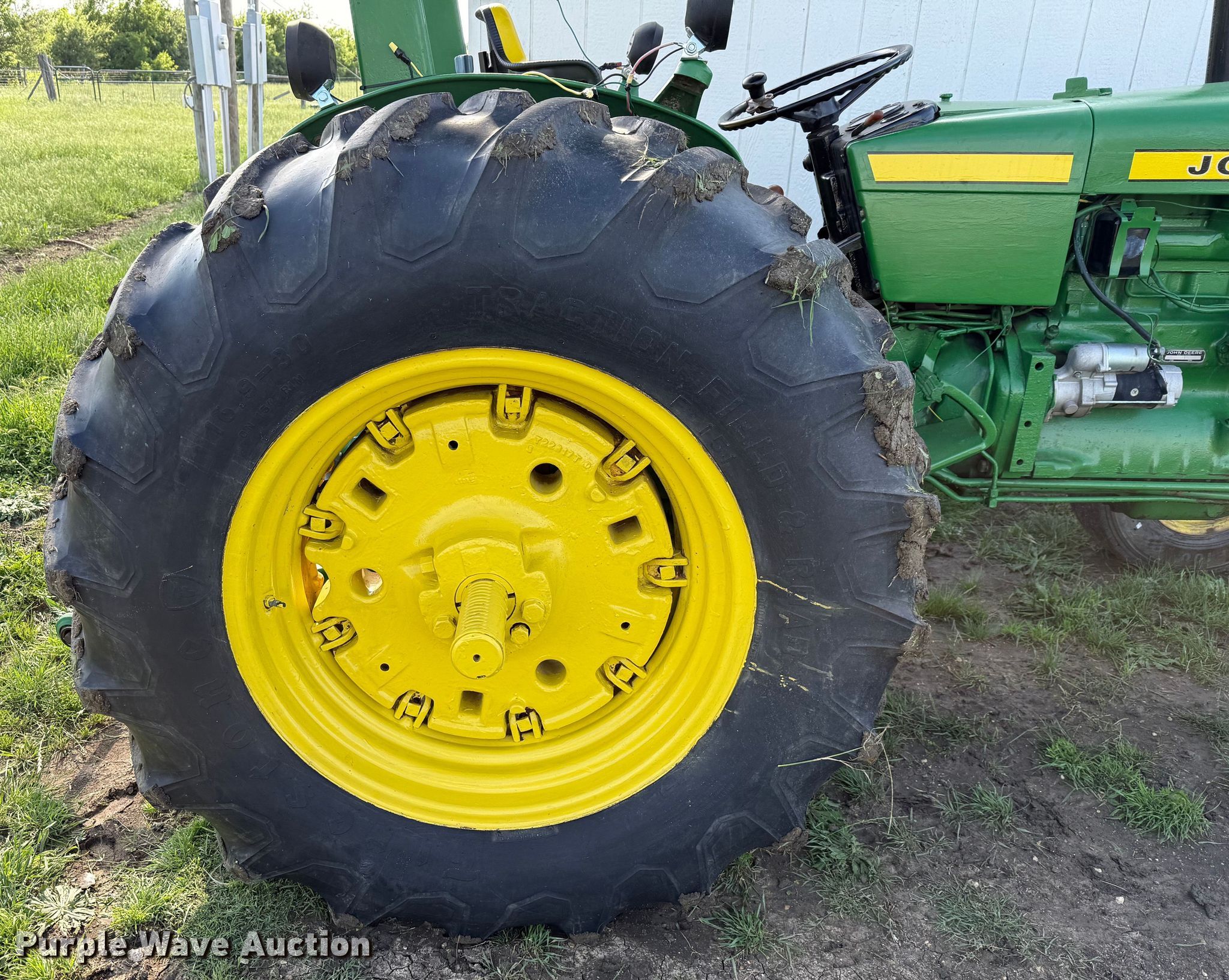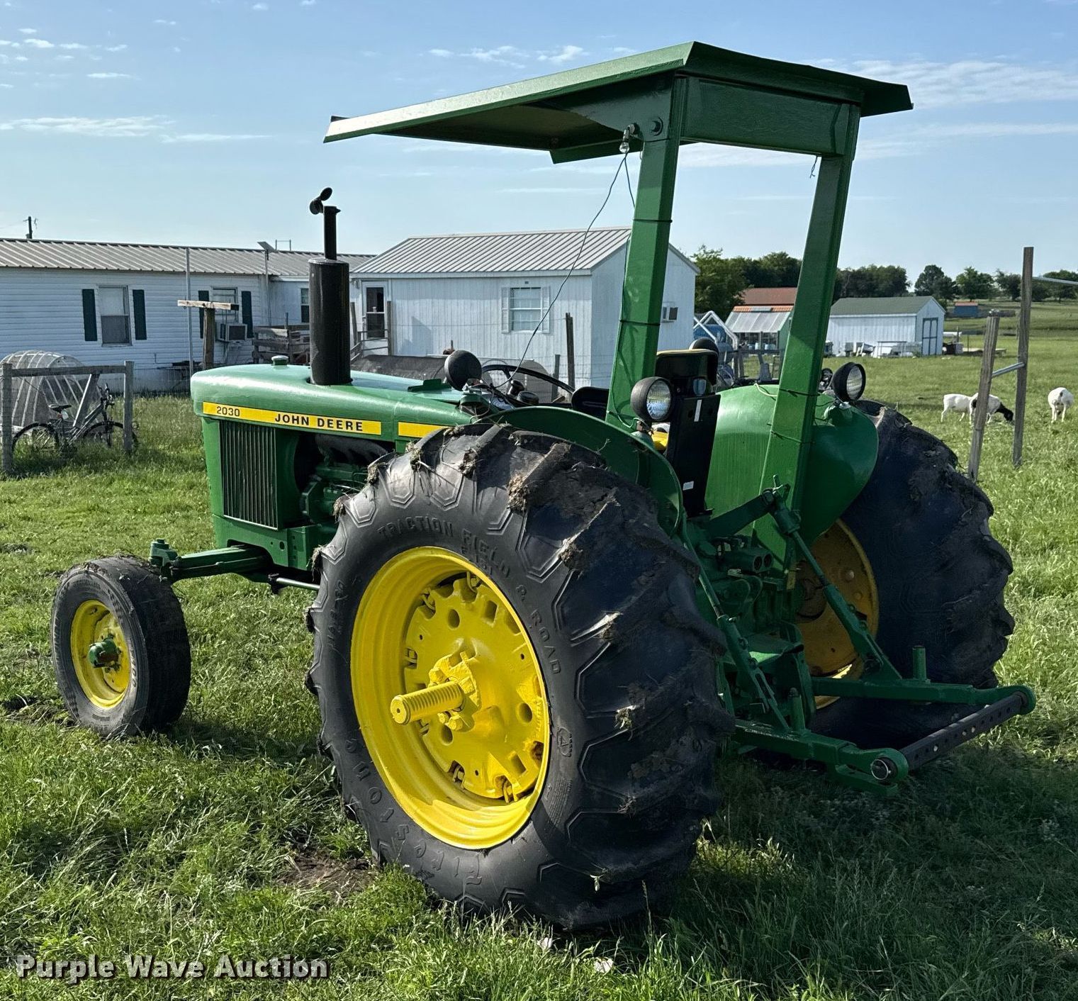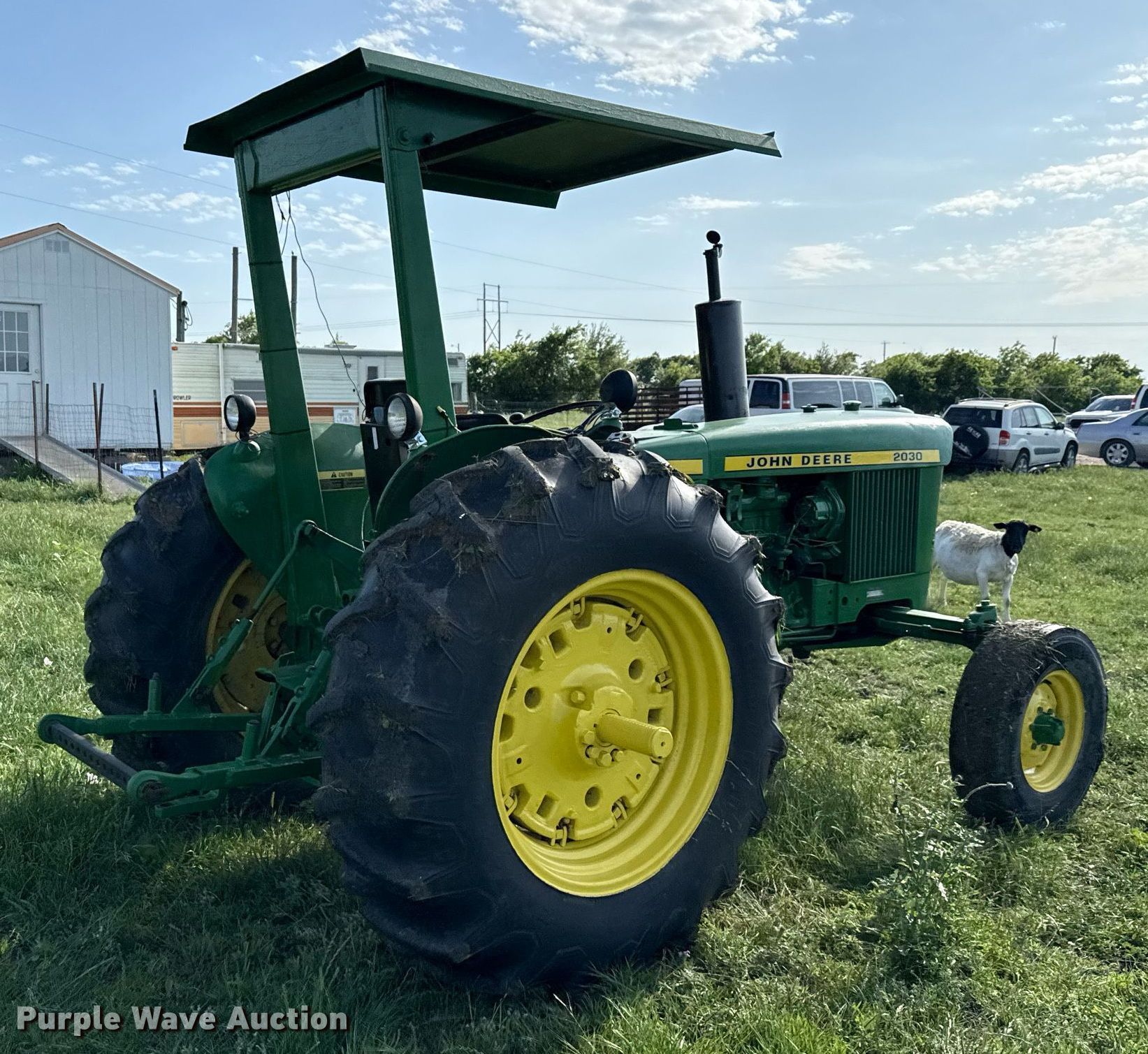 1975 John Deere 2030 tractor. Hours: 2,885 on meter, Serial: 152315L. Engine John Deere, Cylinders: 4, Fuel type: Diesel. Transmission Manual, 8F - 4R, Differential lock. Features PTO: 540, Three point, Hydraulic remote sets Front: 1, Rear: 1. Tires Front: 235/80R16, Rear: 16.9-30, Wheel weights: 2. Notes Non-operational three point Repair prior to auction, Water filled rear tires, Ignition switch issues. Troy, TX 76579