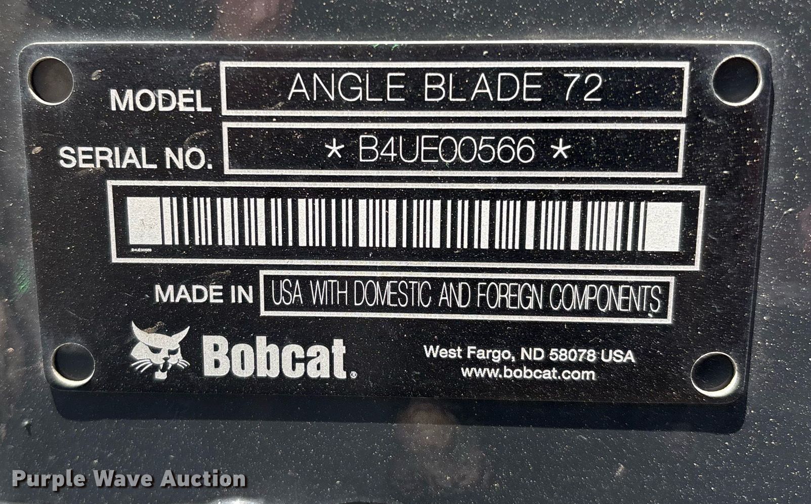 Purple Wave is selling a used Ag Equip. Other in Oklahoma. This item is a Bobcat Angle Blade 72 blade with the following: Serial: B4UE00566, Width: 72", Hitch: Three point