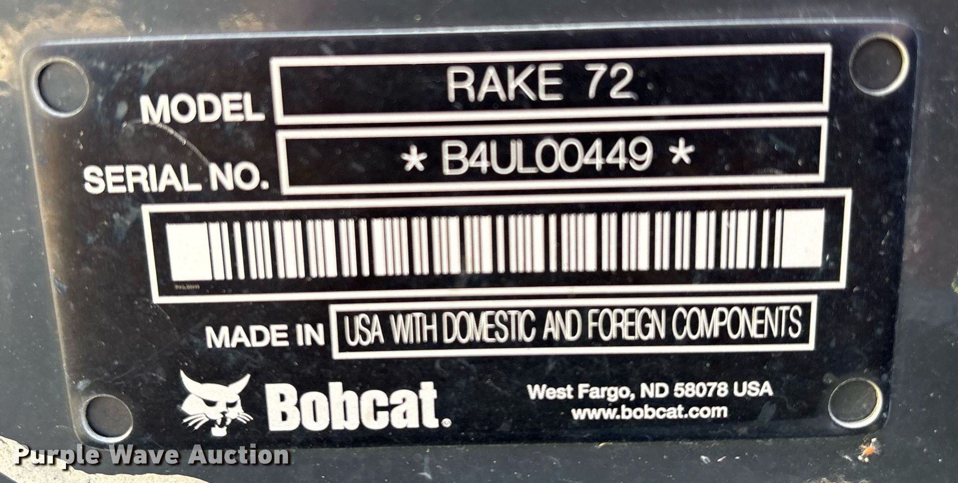 Purple Wave is selling a used Ag Equip. Other in Oklahoma. This item is a Bobcat Rake 72 landscape rake with the following: Width: 72", Hitch: Three point