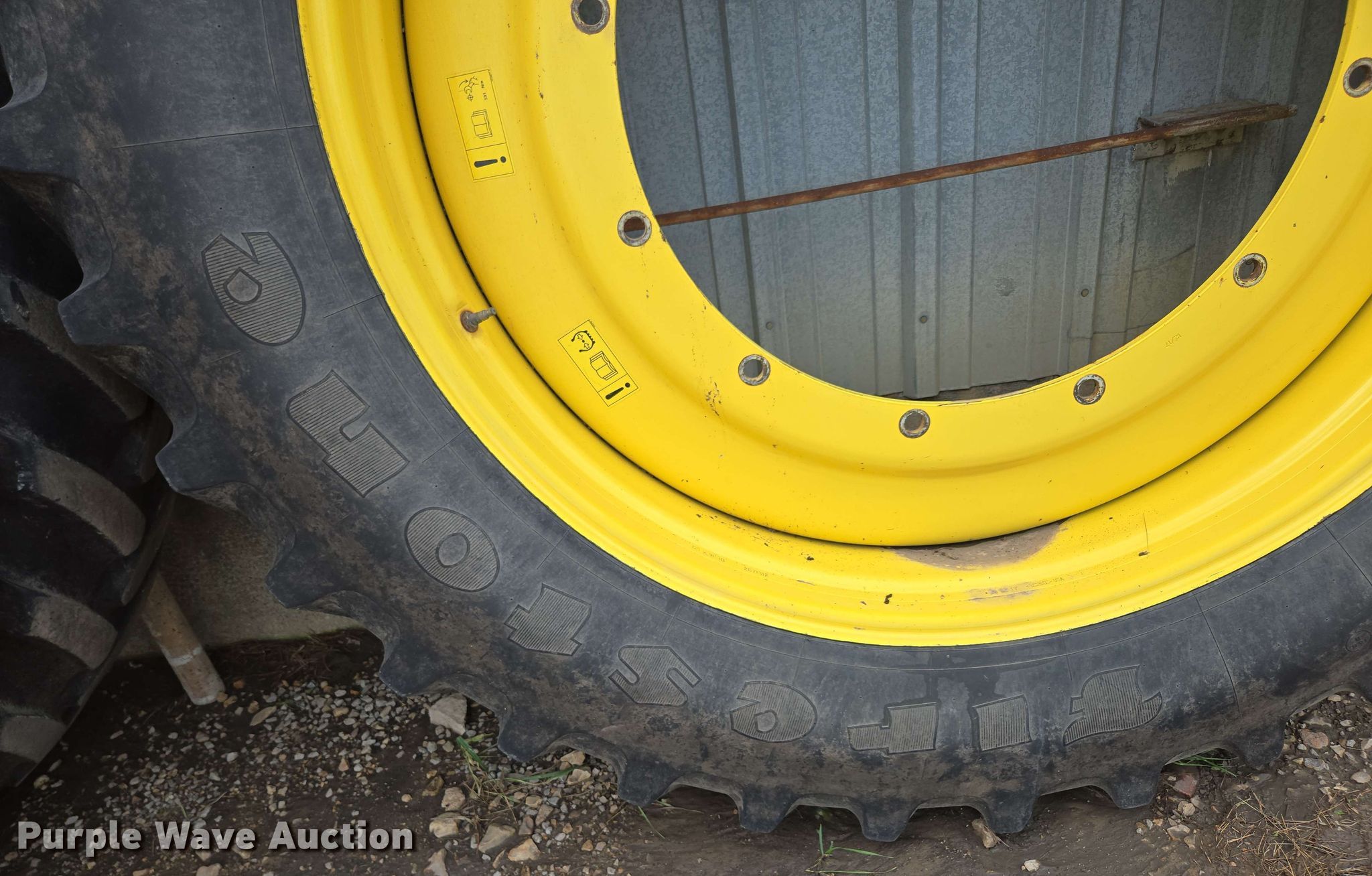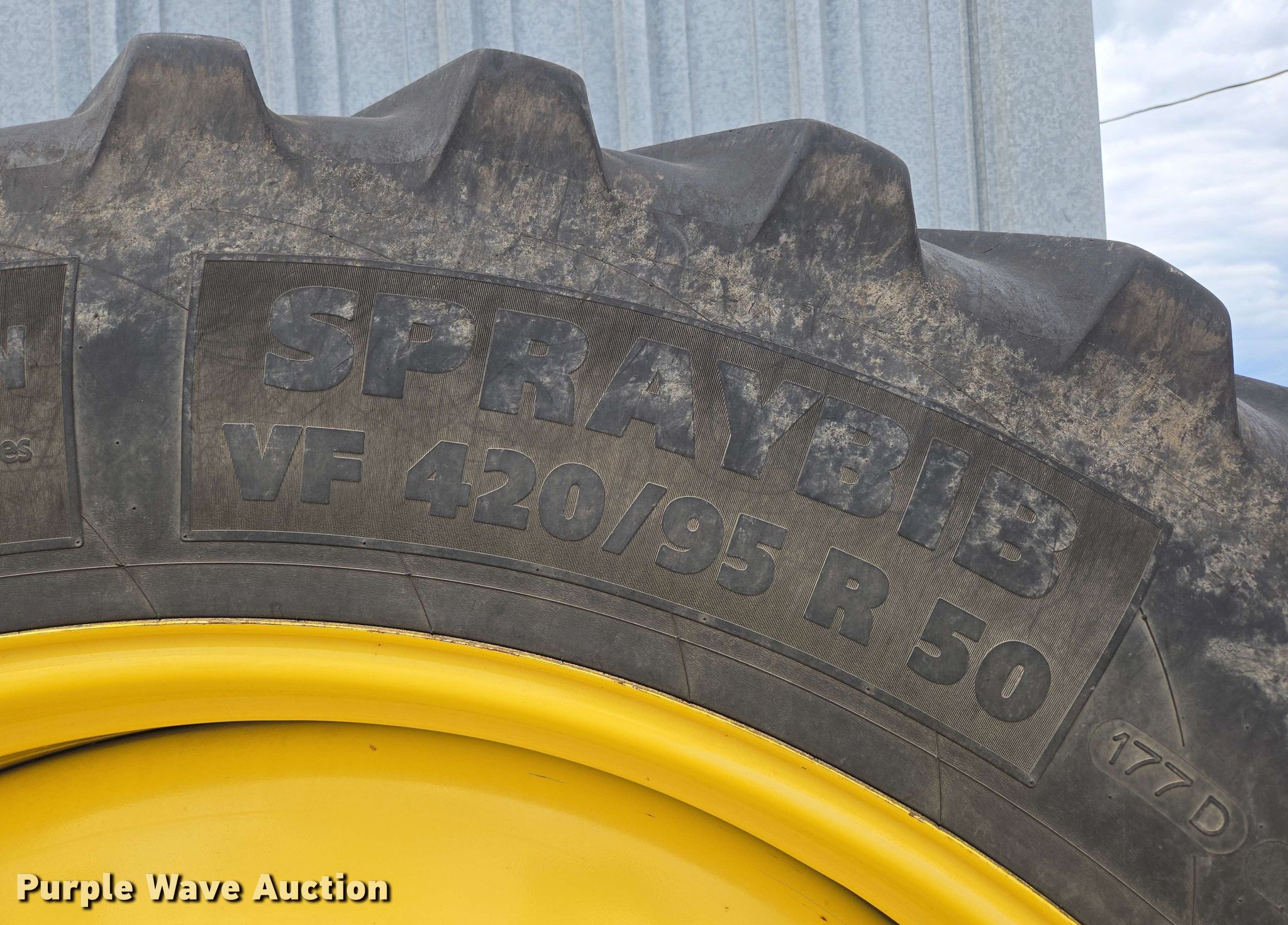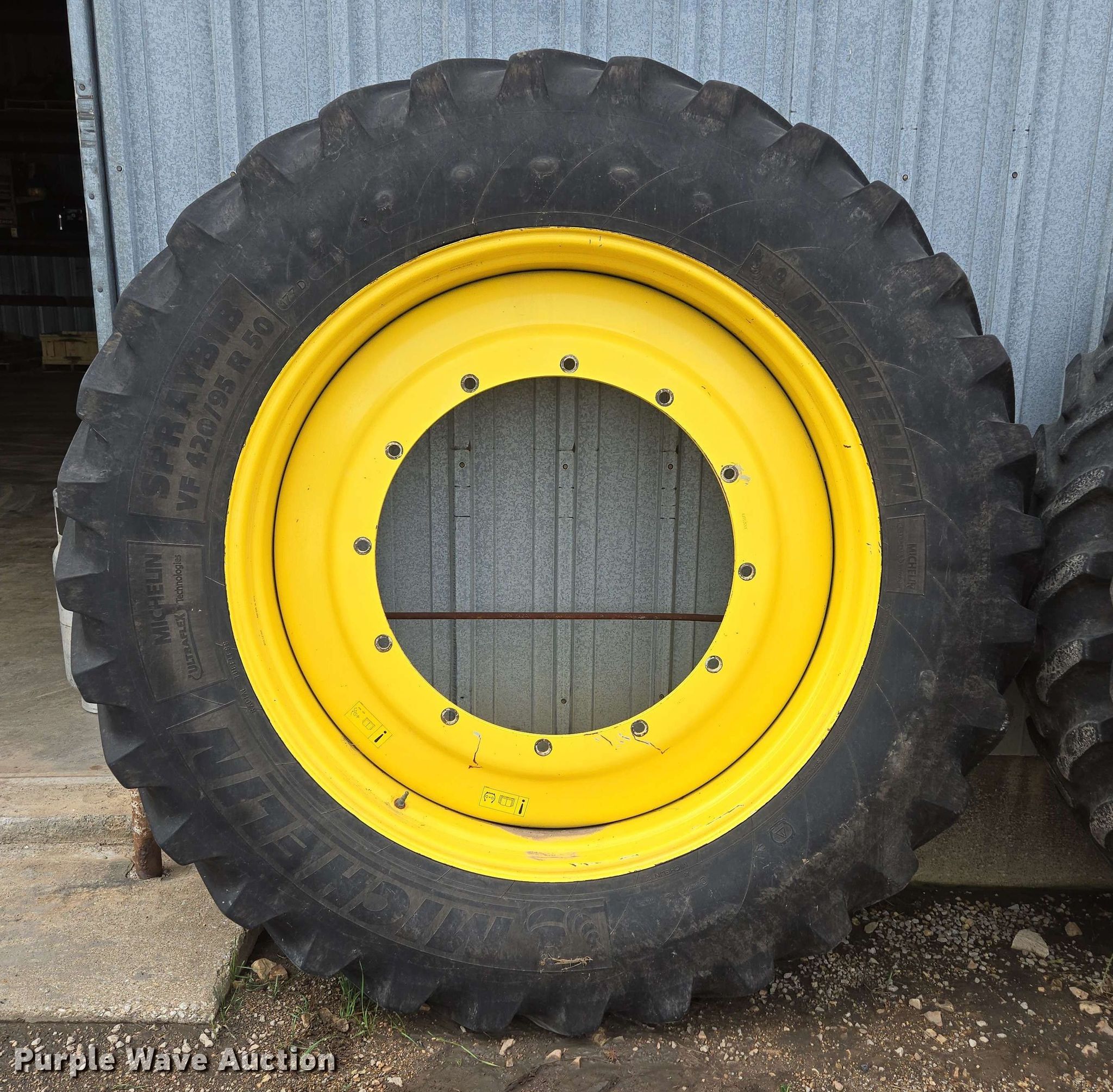 (4) tires and wheels. (3) Michelin Spraybib VF420/95R50, Firestone 380/105R50, Fits John Deere 4940 and R4045 Sprayer. Allison Farms. South Greenfield, MO 65752
