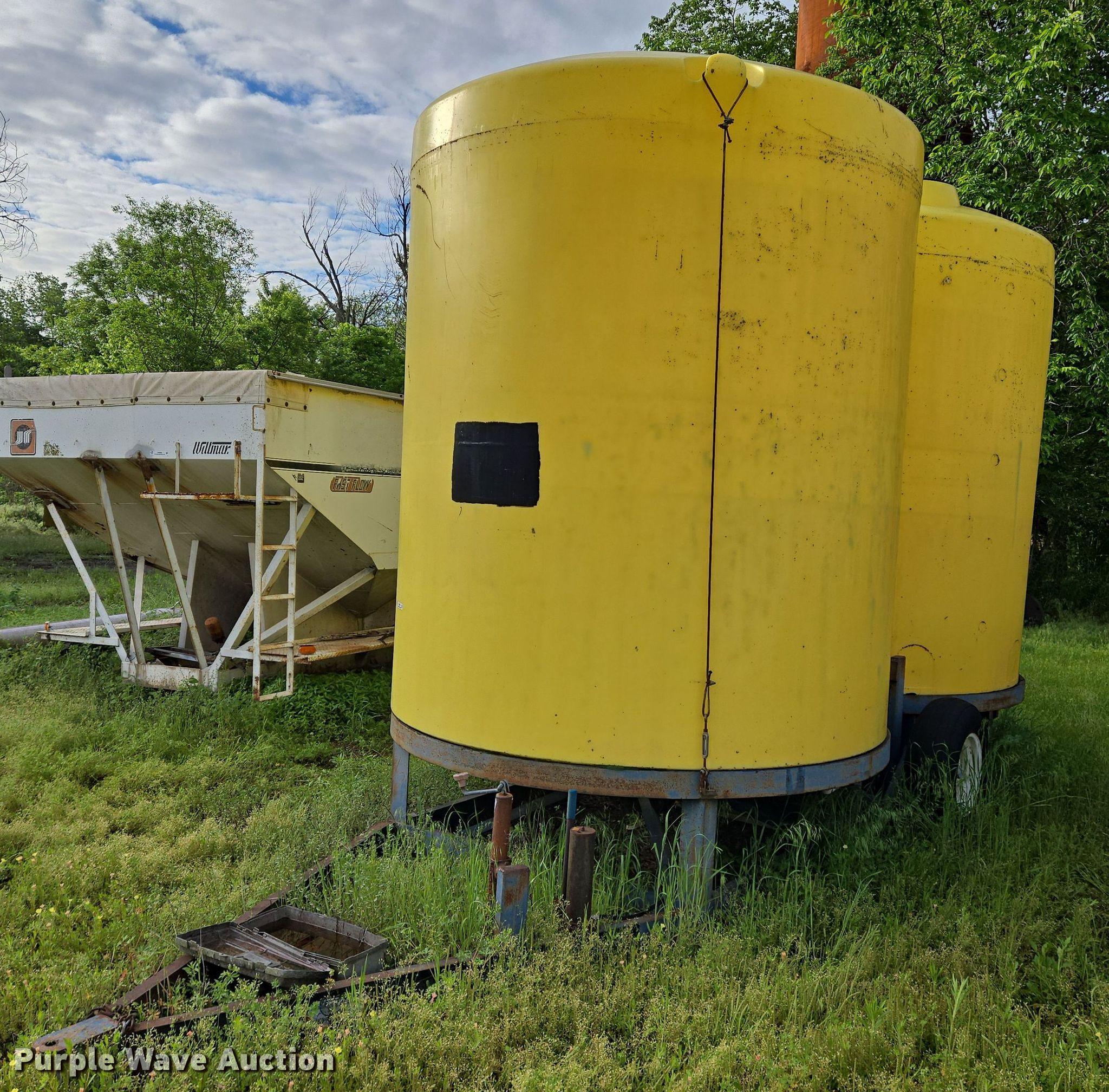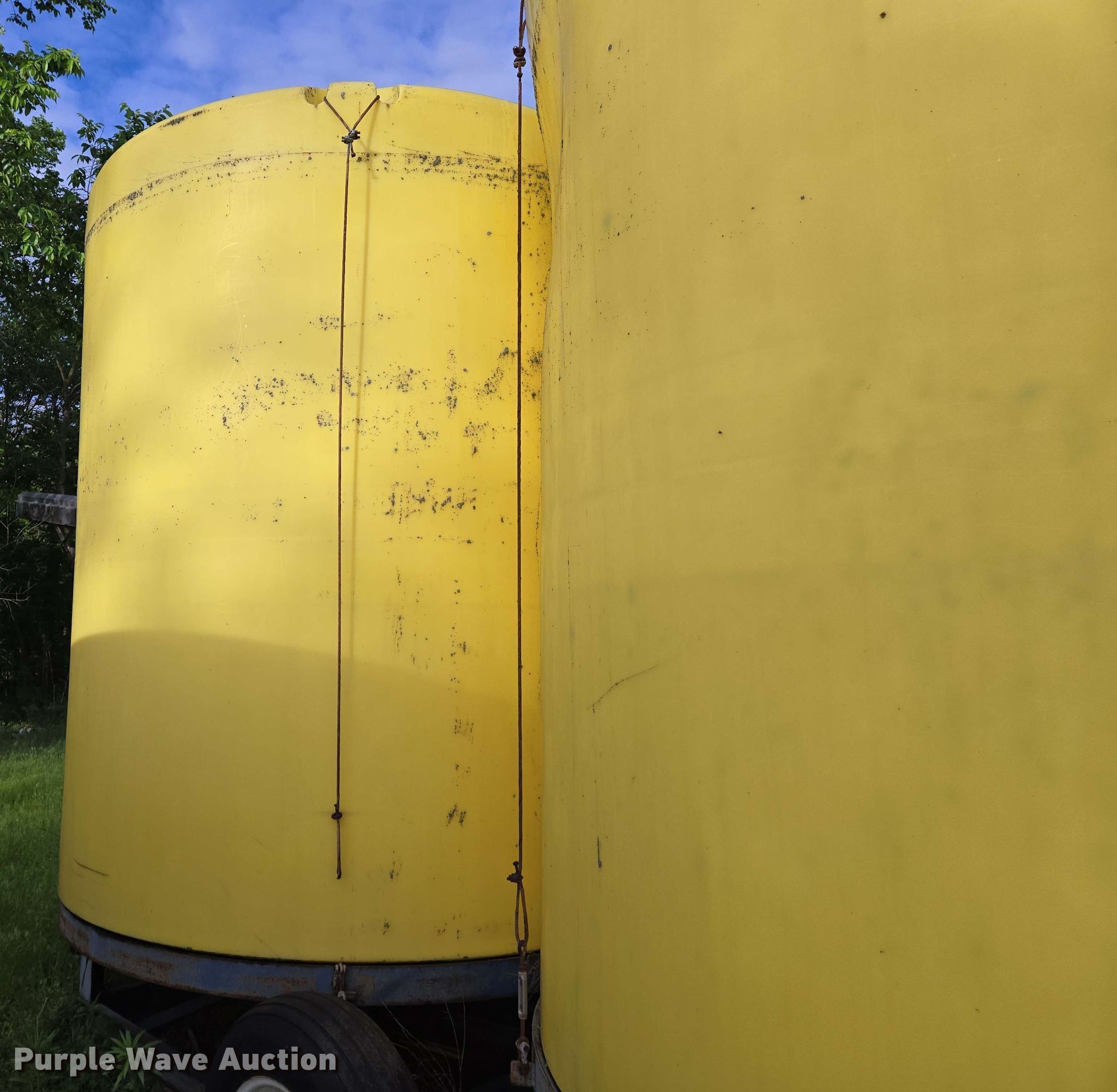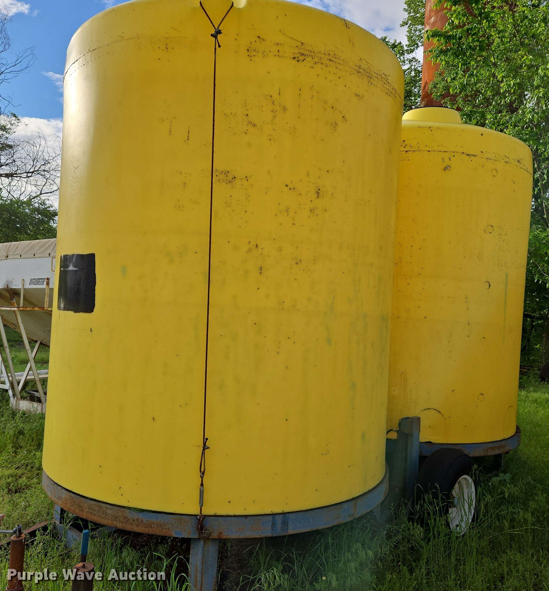 Nurse tank trailer. Dimensions. Overall: 20' L x 94" W. Features (2) poly tanks Capacity: 3,000 gallons, Outlet valves: 1 Size: 4". Chassis Hitch: Pin, Suspension: Torsion. Tires Steel wheels, Size: 9.5L-15SL. Notes Tire damage. Sedan, KS 67361