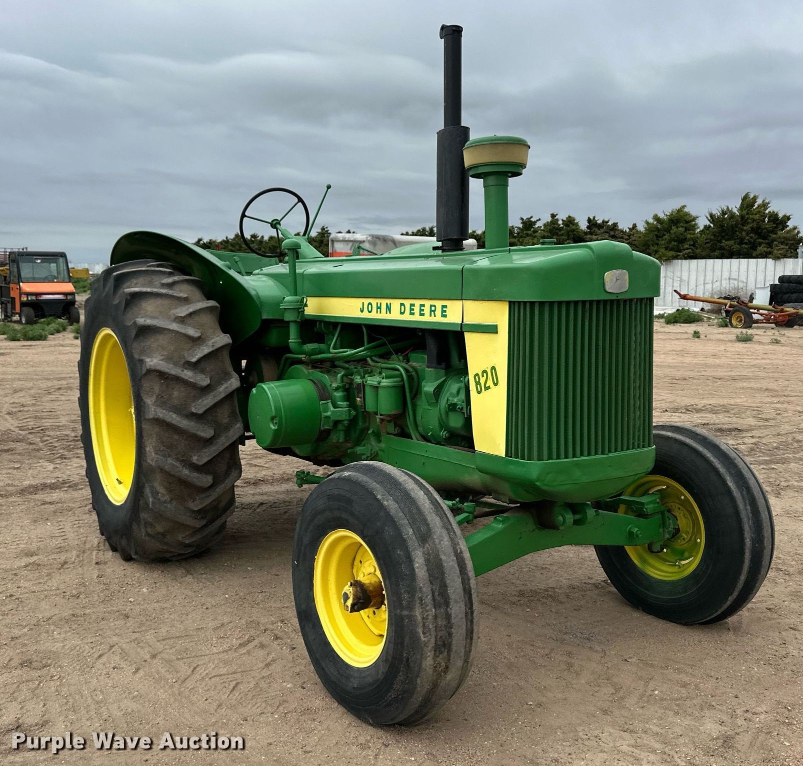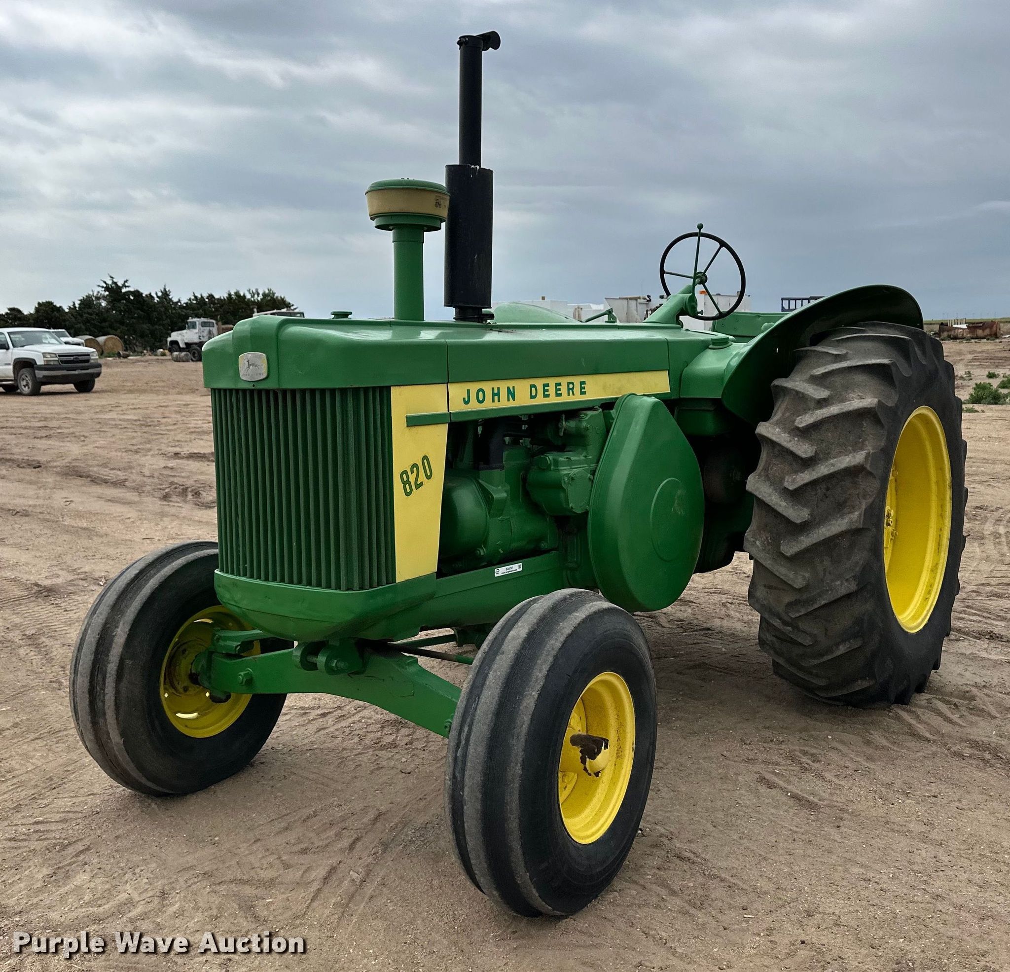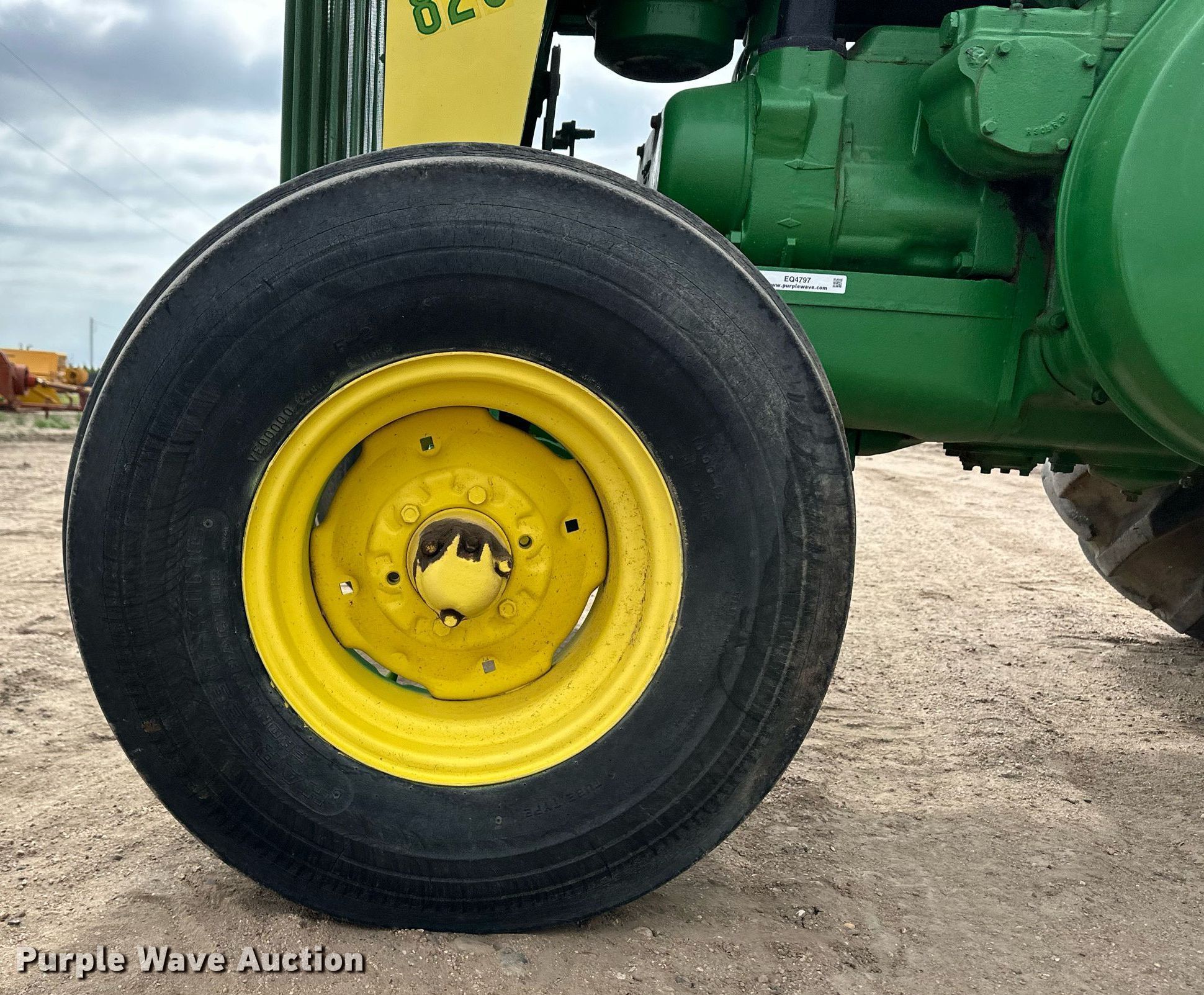 1957 John Deere 820 tractor. Serial: 8202536. Engine Cylinders: 2, Fuel type: Diesel. Transmission Manual, 6F - 1R. Features PTO: 540, Hydraulic remote sets Rear: 1. Tires Front: 10.00-16, Rear: 18.4-34. Sublette, KS 67877