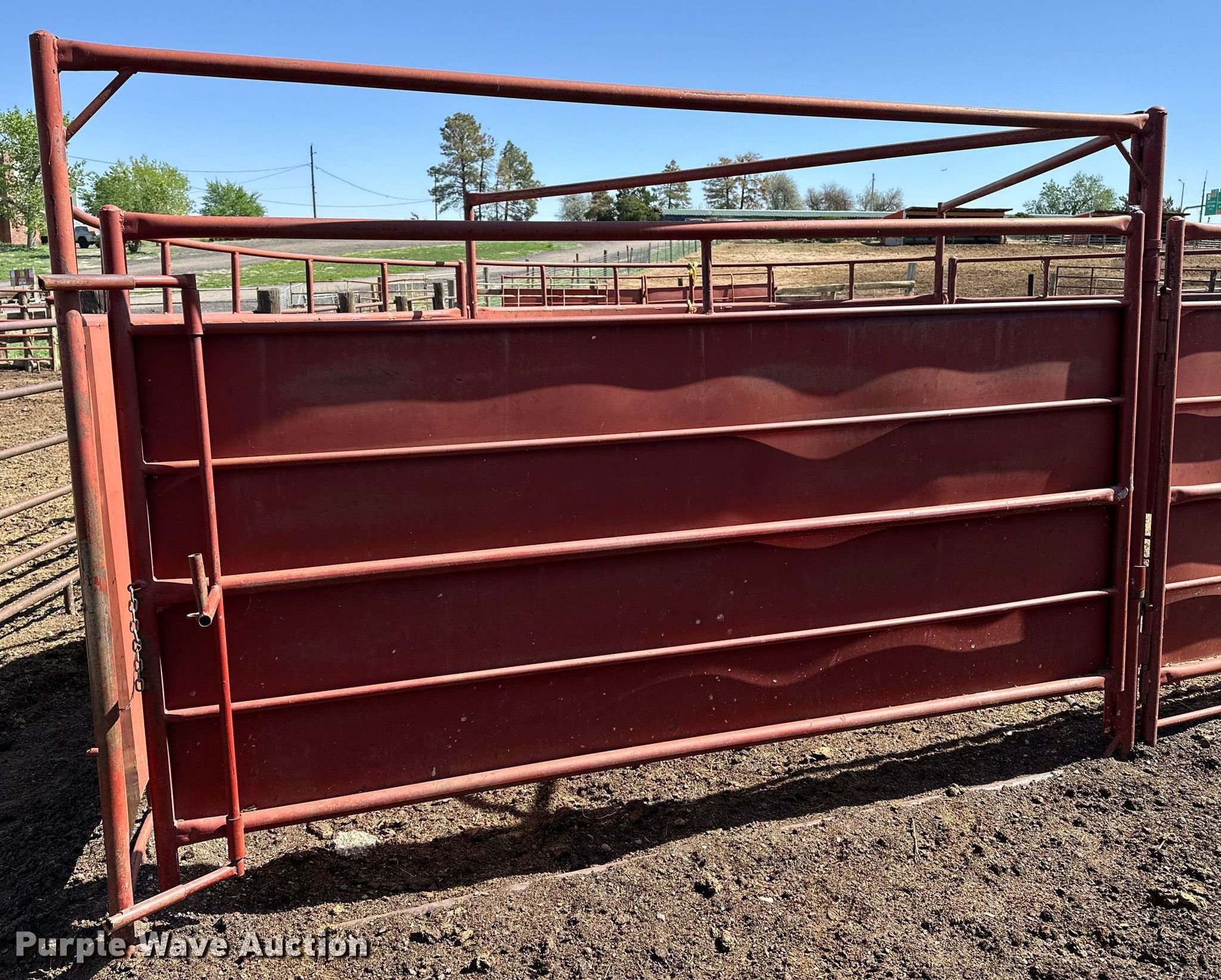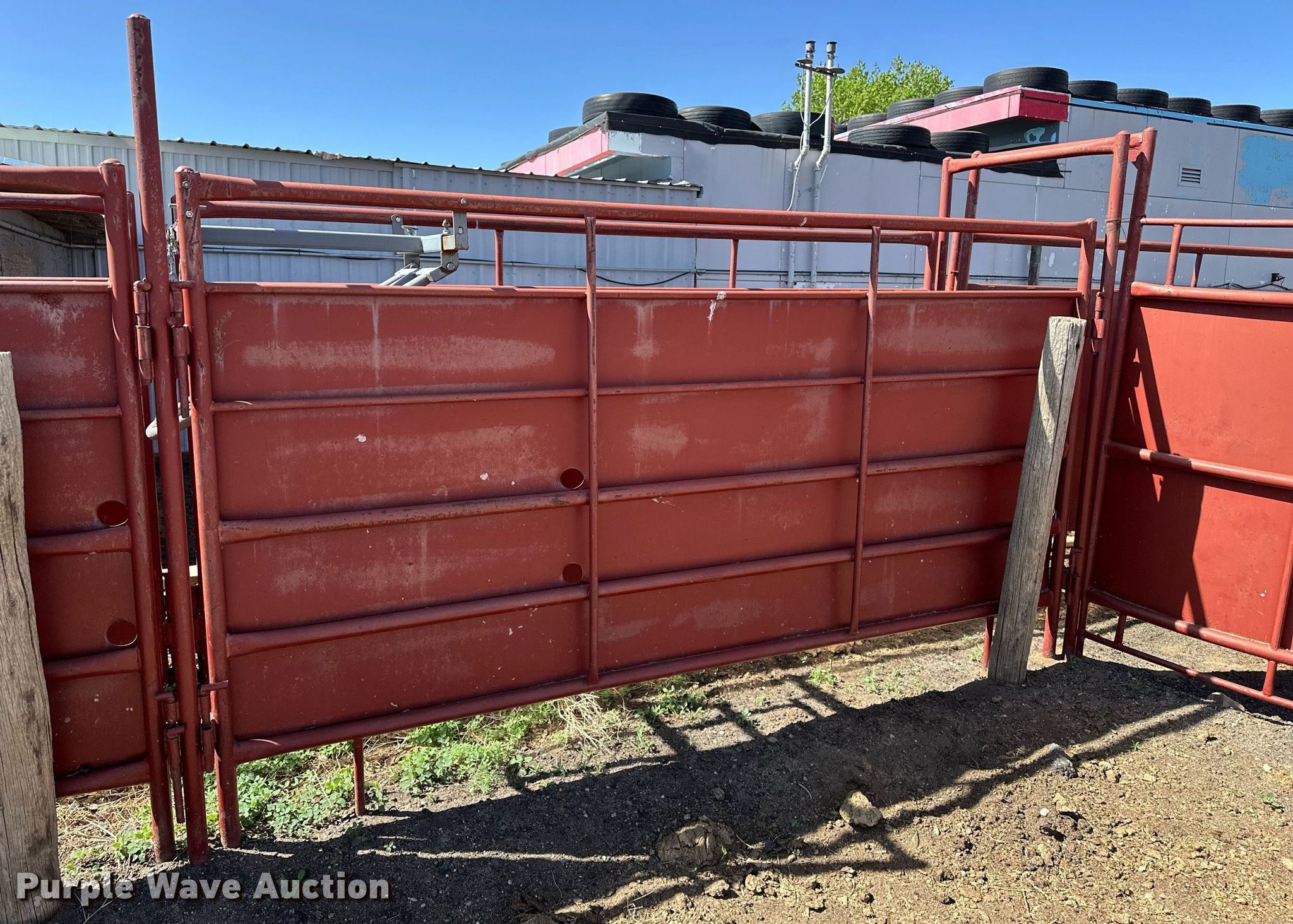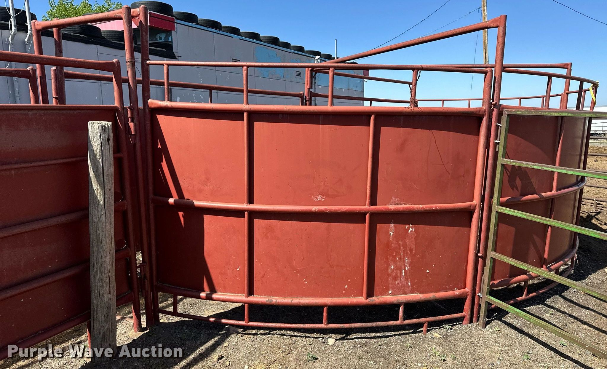 Livestock corral with palpation chute. (7) panels 10� 2� W x 71� H, Half round tub Sweep gate, (3) sections, Palpation chute 35� L x 36� W, (2) gates. Elmer Hamann Retirement Auction. Aurora, CO 80011