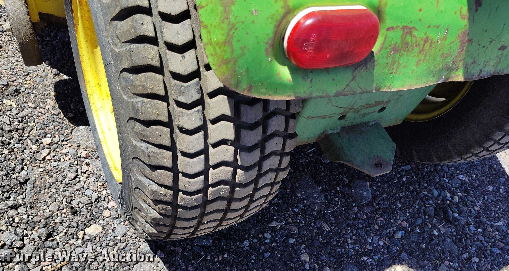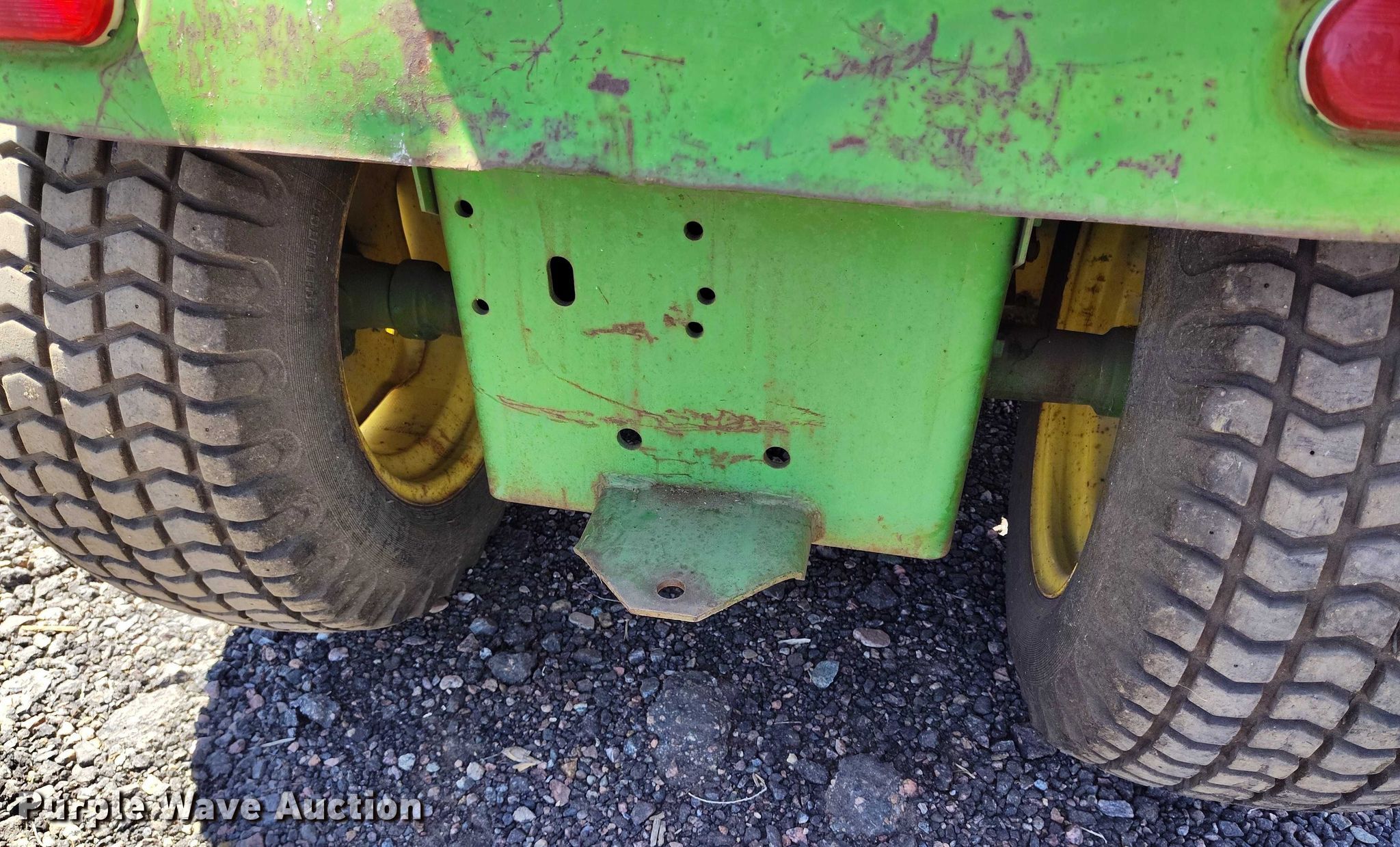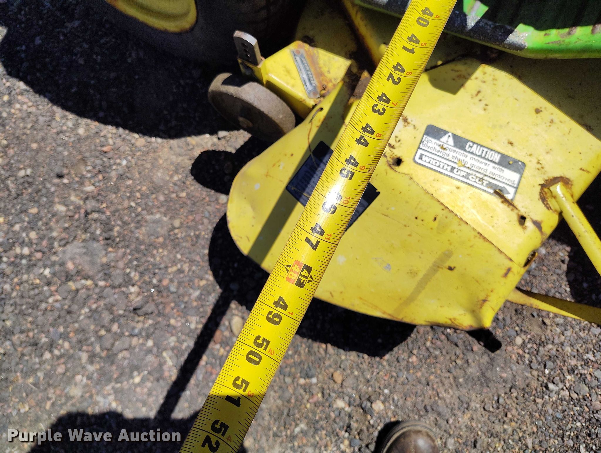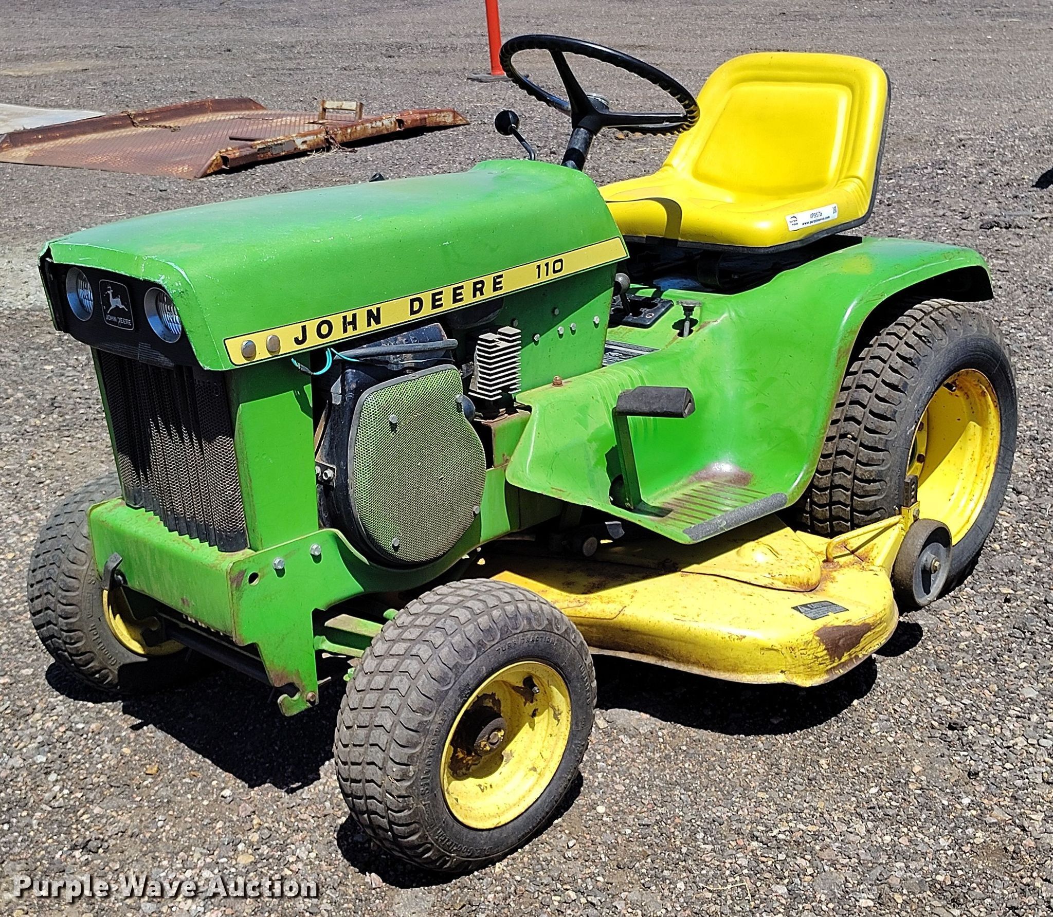 John Deere 110 lawn mower. Cutting width: 48", Serial: 320391M. Engine Kohler, Cylinders: 1, Fuel type: Gas. Transmission Manual, Speed: 4. Features Rear drawbar. Tires Front: 16x6.50-8, Rear: 23x10.50-12. Elmer Hamann Retirement Auction. Aurora, CO 80011