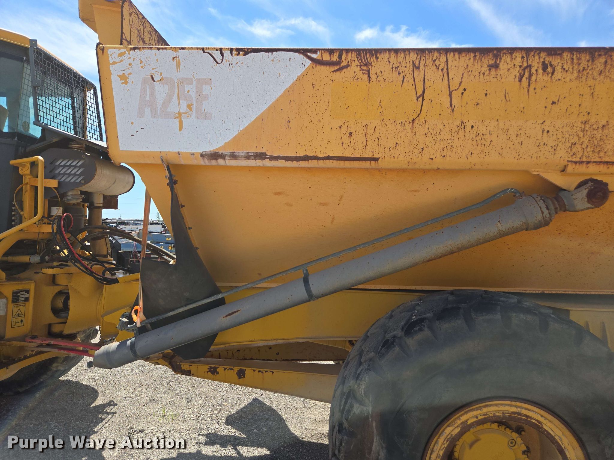 2004 Volvo A25D articulated haul truck. Miles: Unknown, Serial: A25DV13330. Engine Volvo D9ABEE2, Displacement: 9.4L, Cylinders: 6, Fuel type: Diesel. Transmission Automatic. Chassis Six wheel drive. Interior Heat, Retarder. Features Dump bed Volvo A25E, Capacity: 25 tons. Tires Size: 23.5R25. Notes Dash disassembled, Parts may be missing, Non-operational unit. Valfair Construction - Open Inspection June 9, 10 and 11. 501 East US Highway 80. Forney, TX 75126
