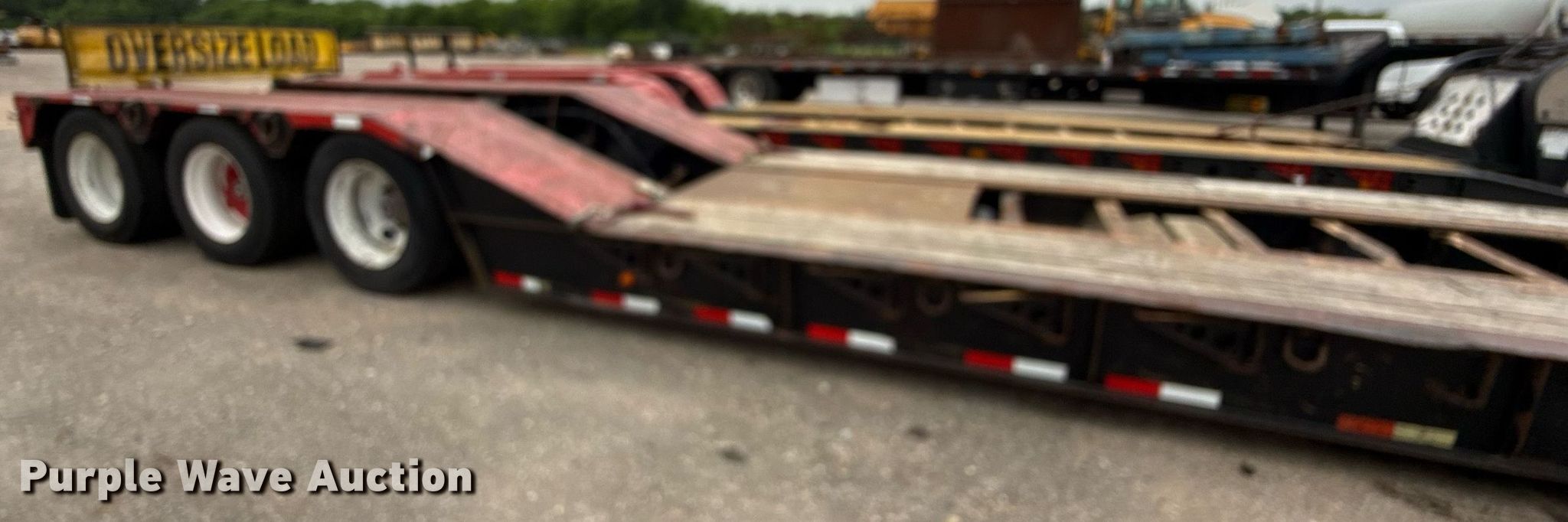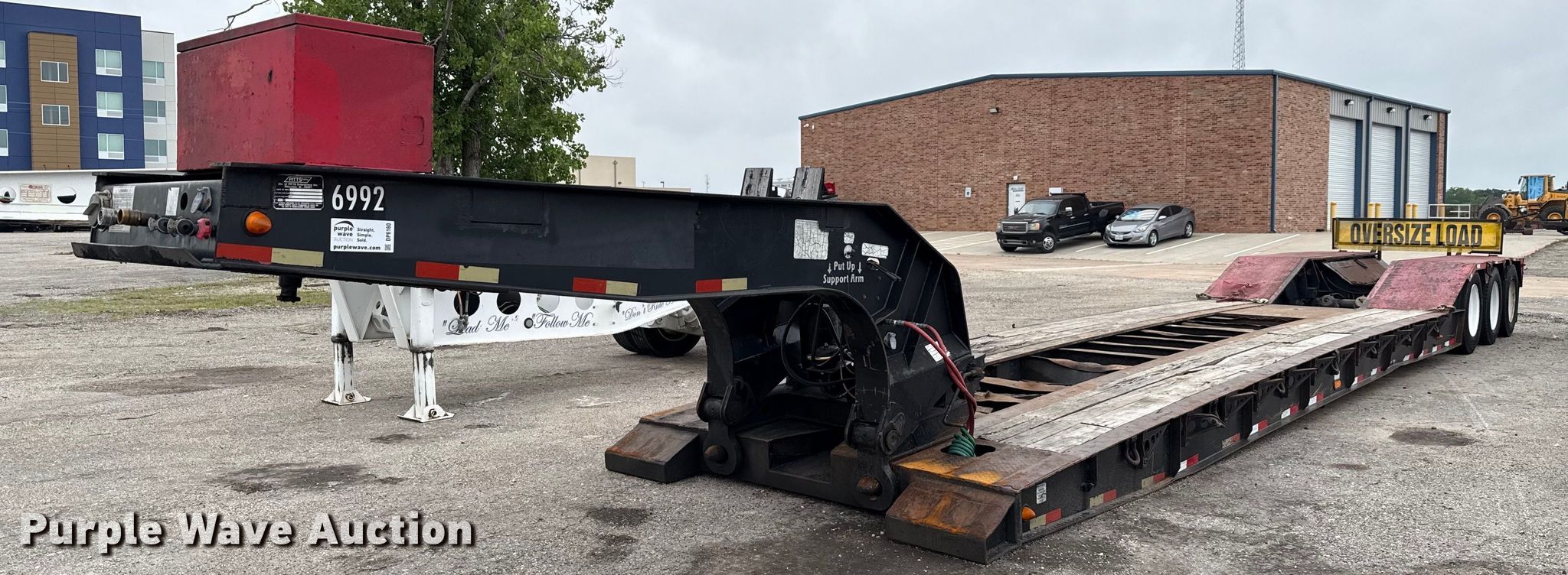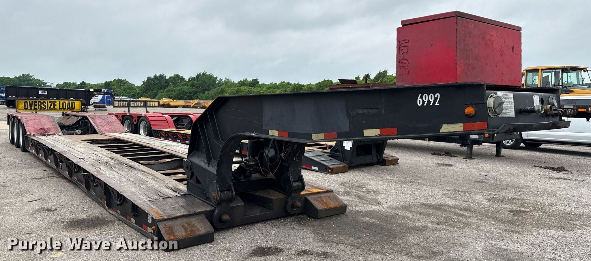 2008 Pitts lowboy equipment trailer. VIN: 5JYLB55378P080599, Unit #: 6992. Dimensions Overall: 54' 5" L x 102" W, Deck: 26' L x 102" W, Rear deck length: 11'. Features Deck type: Steel, Wood, Outriggers: Swing-out Board size: 12", Neck type: Detachable, Hydraulic controls: Manual. Chassis Suspension: Air, Brakes: Air, Axles: Triple, GAWR: 20,280 lbs. Tires Steel wheels, Size: 275/80R22.5. Texas title. Title distribution may be delayed up to 30 days from verification of funds. Valfair Construction - Open Inspection June 9, 10 and 11. 501 East US Highway 80. Forney, TX 75126