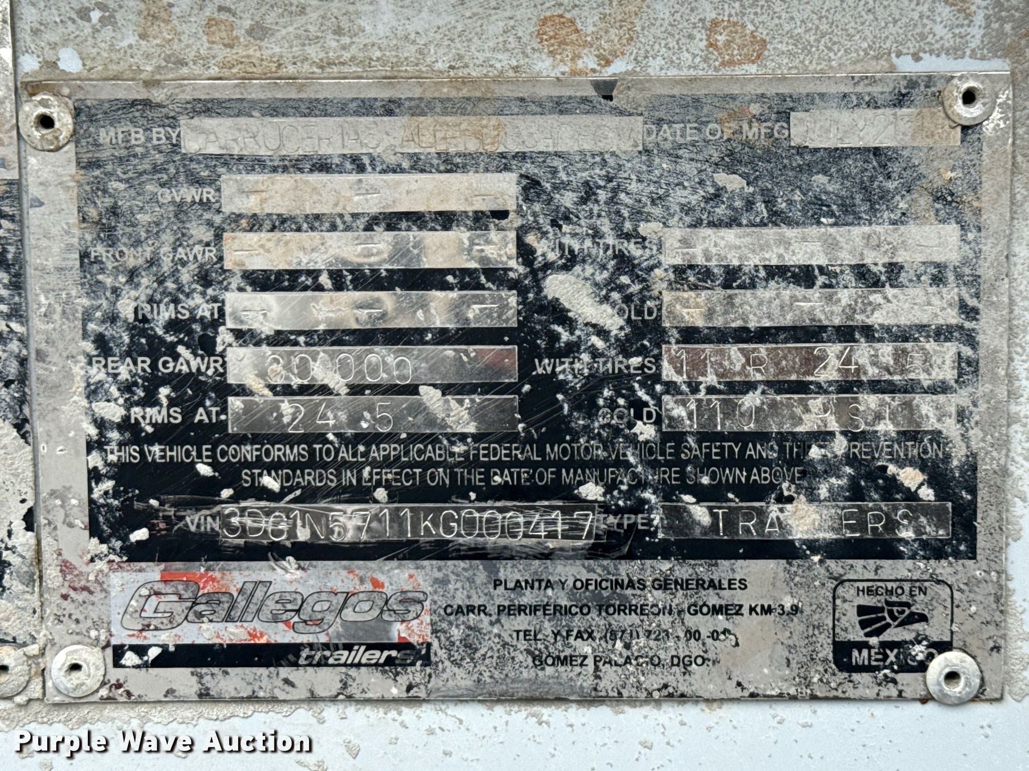 Purple Wave is selling a used Tank Trailer in Texas. This item is a 2019 Carrocerias Gallegos horizontal silo with the following: VIN: 3DG1N5711KG000417, Unit #: 7506
