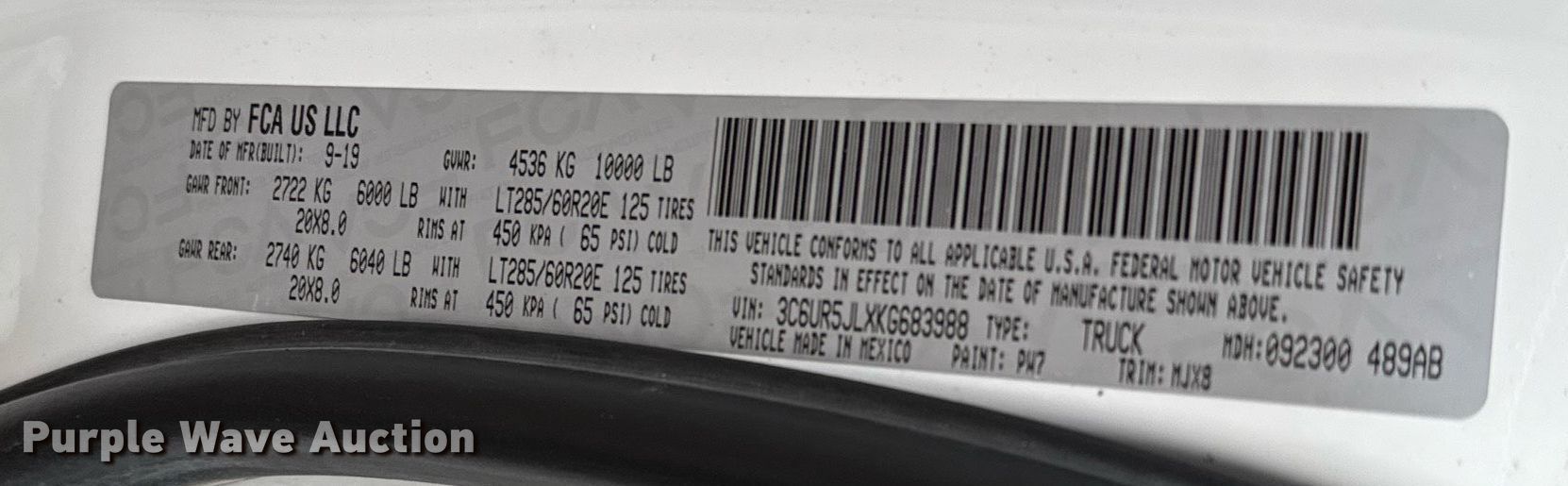 Purple Wave is selling a used 3/4 or 1 Ton Pickup or Van in Texas. This item is a 2019 Dodge Ram 2500 Crew Cab pickup truck with the following: Miles: 155,380 on odometer, Engine hours: 9,723 on meter, VIN: 3C6UR5JLXKG683988, Unit #: 7893