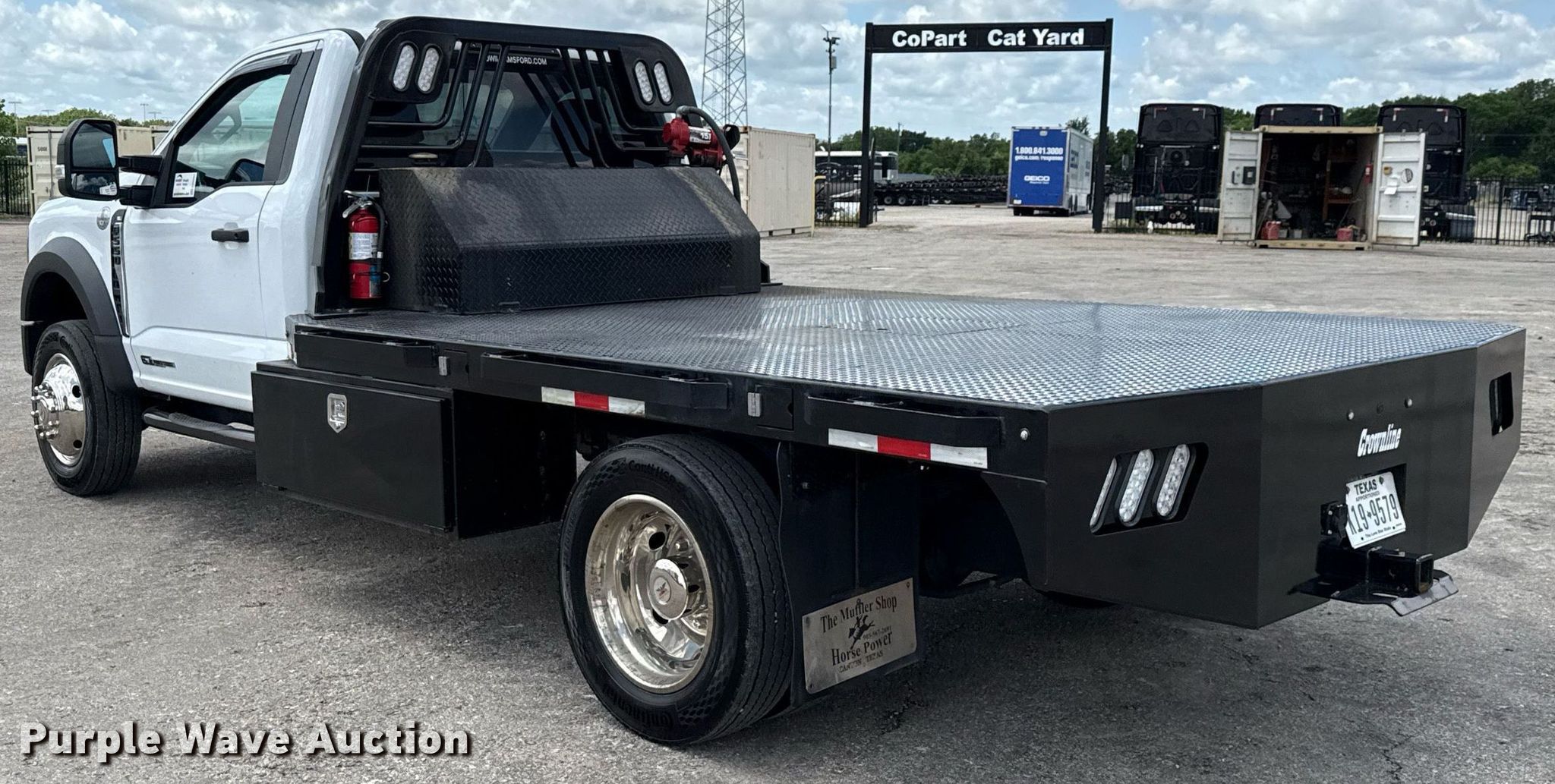 2024 Ford F550 Super Duty XL flatbed truck. Miles: 76,616 on odometer, Engine hours: 1,937 on meter, VIN: 1FDUF5GT8RDA04800, Unit #: 10660. Engine Displacement: 6.7L, Cylinders: 8, Fuel type: Diesel. Transmission Automatic. Chassis Axles: Single, Suspension: Spring, Brakes: Hydraulic, GVWR: 19,500 lbs. Interior AC, Heat, Heated mirrors, Power windows, Power locks, Cruise control, Auxiliary controls, Brake controller. Features Flatbed Crownline RRCW136, Serial: 0629-2.5�, 11' 4" L x 98" W, Gooseneck, Auxiliary fuel tank, Fill-Rite pump GPM: 15. Tires Size: 225/70R19.5. Notes Windshield chipped or cracked. Texas title. Title distribution may be delayed up to 30 days from verification of funds. Valfair Construction - Open Inspection June 9, 10 and 11. 501 East US Highway 80. Forney, TX 75126