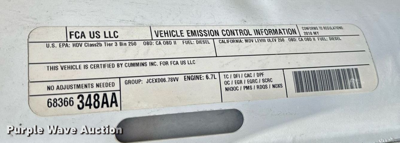 2018 Dodge Ram 2500 Crew Cab pickup truck. Miles: 189,385 on odometer, Hours: 5,113 on meter, VIN: 3C6UR5JLXJG214141, Unit #: 7269. Engine Displacement: 6.7L, Cylinders: 6, Fuel type: Diesel. Transmission Automatic, Four wheel drive. Interior AC, Heat, Seat: Power driver, Heated mirrors, Power windows, Power locks, Cruise control, Backup camera. Features Auxiliary fuel tank. Tires Size: LT275/70R18. Notes Backup camera issue, Dash warning indicator: Check engine, Windshield chipped or cracked. Texas title. Title distribution may be delayed up to 30 days from verification of funds. Valfair Construction - Open Inspection June 9, 10 and 11. 501 East US Highway 80. Forney, TX 75126