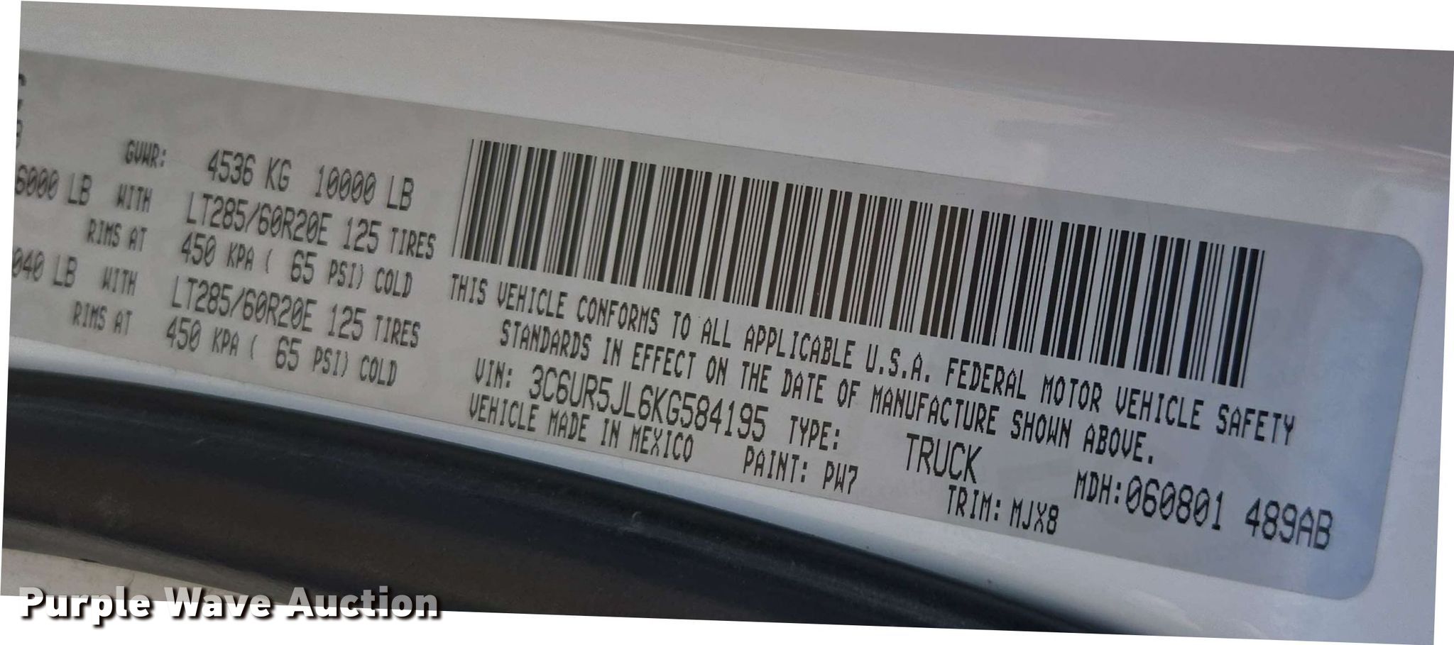Purple Wave is selling a used 3/4 or 1 Ton Pickup or Van in Texas. This item is a 2019 Dodge Ram 2500 Crew Cab pickup truck with the following: Miles: 174,332 on odometer, VIN: 3C6UR5JL6KG584195