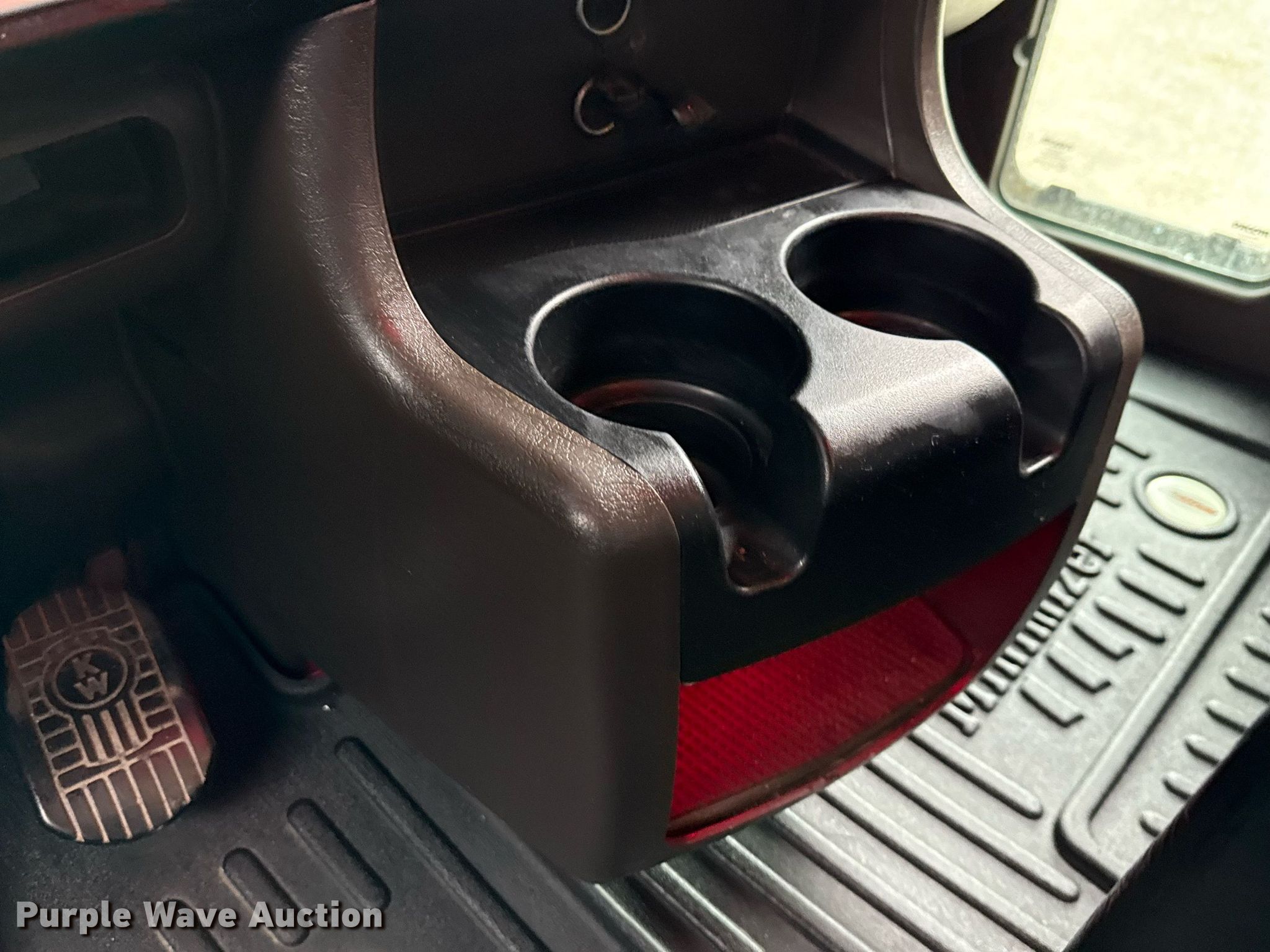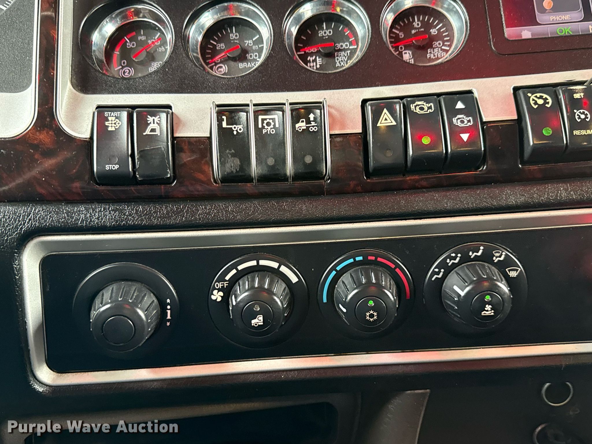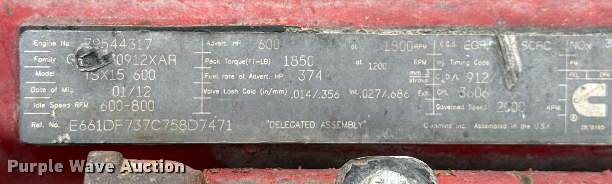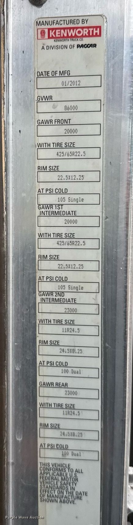 2013 Kenworth T800 semi truck. Miles: 631,801 on odometer, Hours: 23,375 on meter, VIN: 1XKDP4TX7DJ339291, Unit #: 6979. Engine Cummins ISX15, Serial: 79544317, Displacement: 15.0L, Cylinders: 6, Fuel type: Diesel, HP: 600, Engine brake. Transmission Eaton Fuller, Manual, Speed: 18. Chassis Axles: Triple, Pusher axle, Differential lock: Full, Suspension: Air Dump valves, Brakes: Air, PTO, Wet kit, GVWR: 86,000 lbs FAWR: 20,000 lbs, IAWR: 23,000 lbs, RAWR: 23,000 lbs, Lift axle GAWR: 20,000 lbs. Interior AC, Heat, Heated mirrors, Power windows, Power locks, Cruise control, Air ride cab, Sleeper Sleeper length: 48", Beds: Single, Refrigerator, Rear climate control. Features Deck plate: Aluminum, Fifth wheel type: Air operated, Sliding, Fuel tank: Dual, Powerdrive power inverter. Tires Front: 425/65R22.5, Rear: 11R24.5, Lift axle: 425/65R22.5. Notes Windshield chipped or cracked, Emissions modified. Texas title. Title distribution may be delayed up to 30 days from verification of funds. Valfair Construction - Open Inspection June 9, 10 and 11. 501 East US Highway 80. Forney, TX 75126