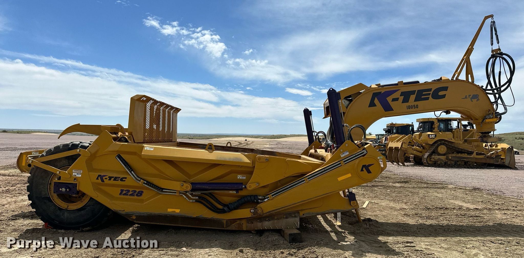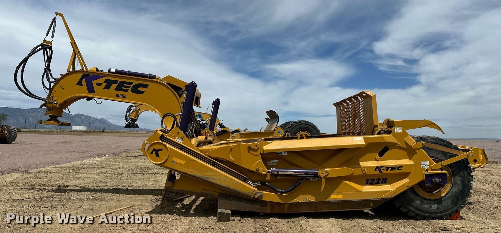 2022 K-Tec 1228 scraper. Serial: KS03587, Unit #: 10050. Features Bowl capacity: 28 cu.yd., Hydraulic lift, Rear push block, Hitch: Scraper. Tires Front: 23.5R25. Valfair Construction - Open Inspection June 9, 10 and 11. 700 Charter Oak Ranch Road. Fountain, CO 80817