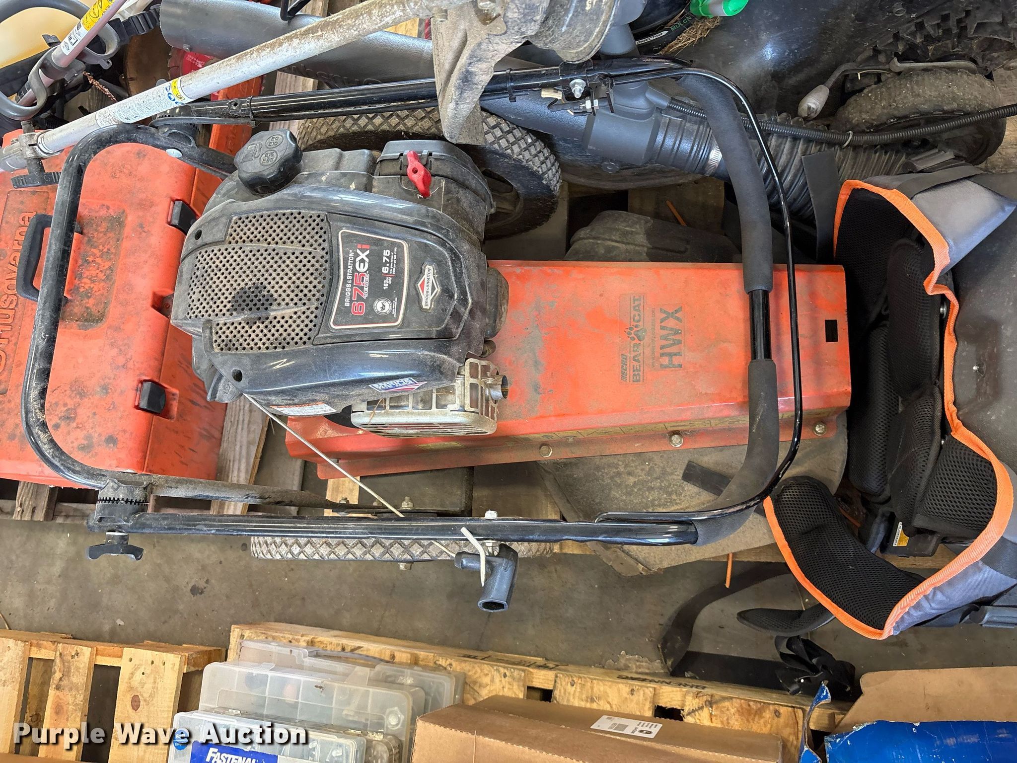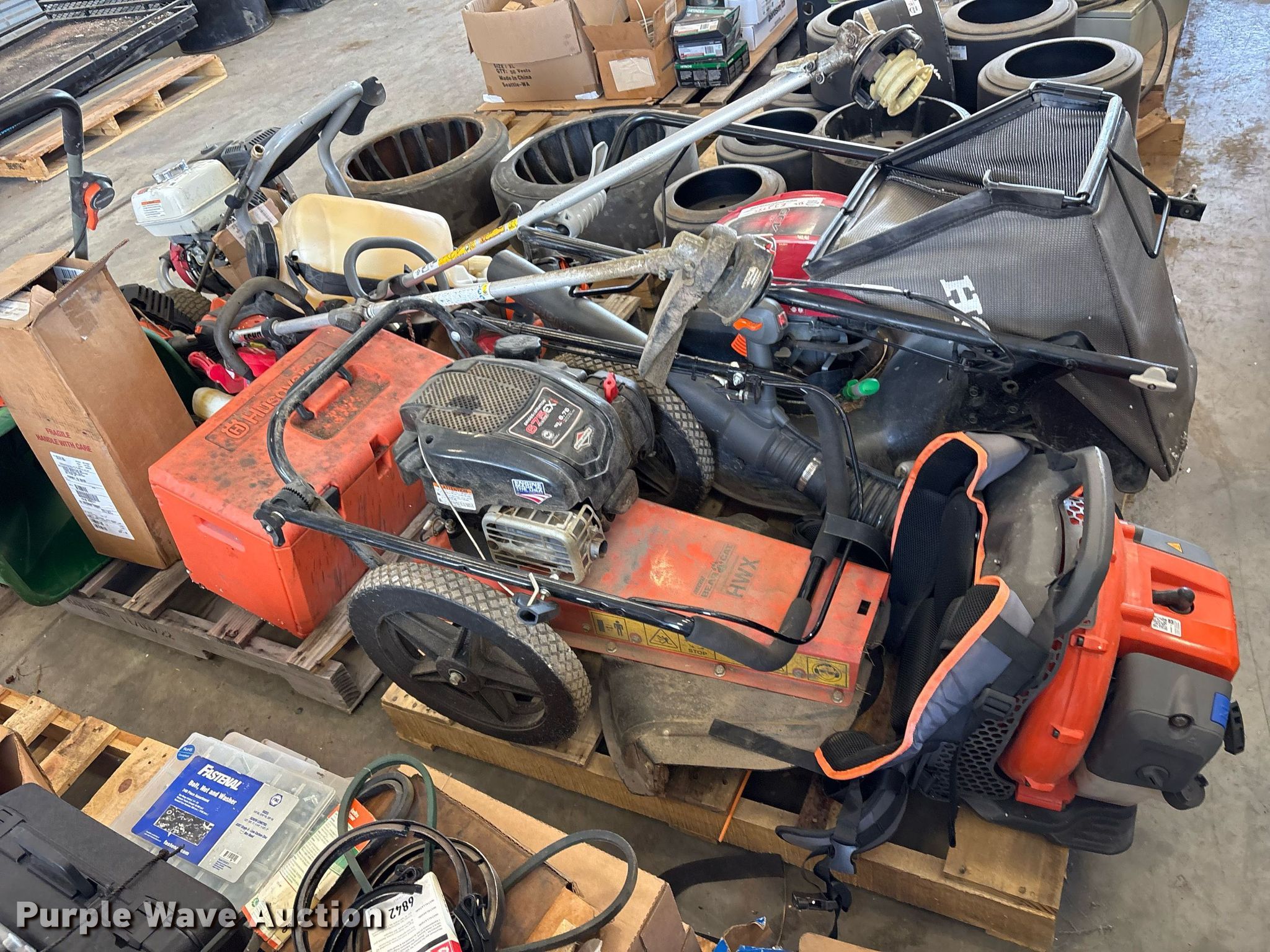 Purple Wave is selling a used Lawn and Garden in Texas. This item is a Lawn and garden equipment with the following: Honda pressure washer, String trimmers, Chain saw, Fertilizer spreader, Blower, (2) lawn mowers