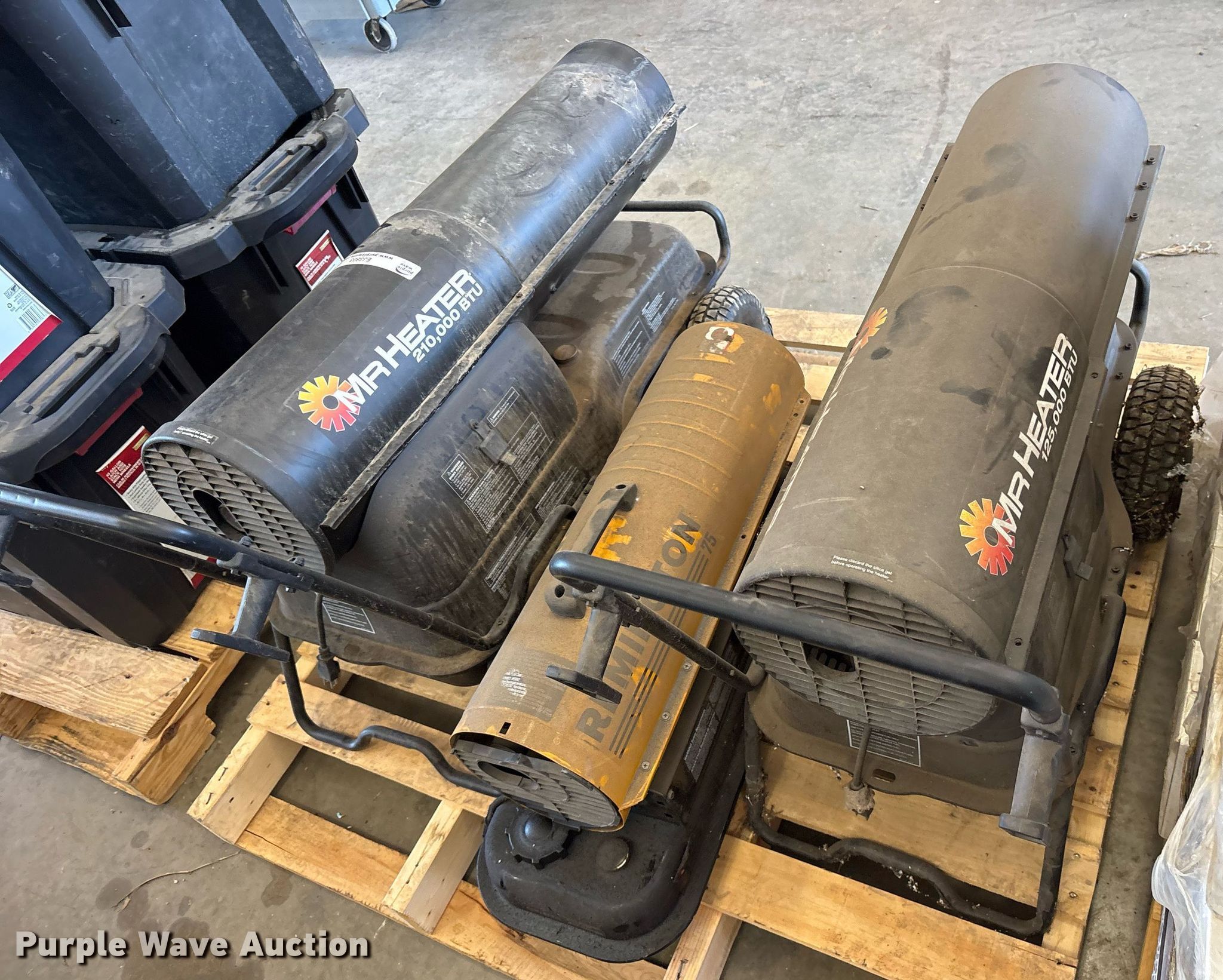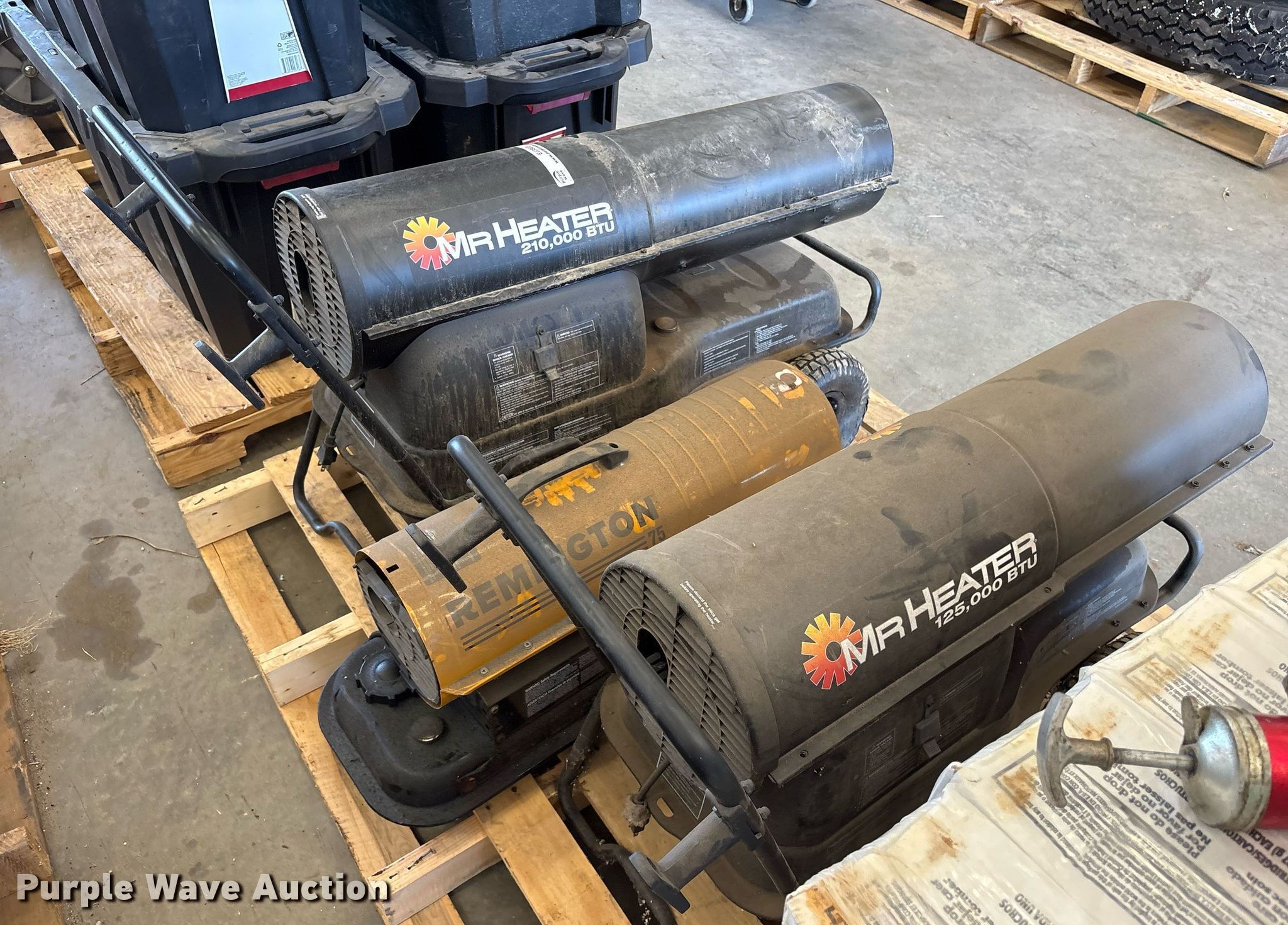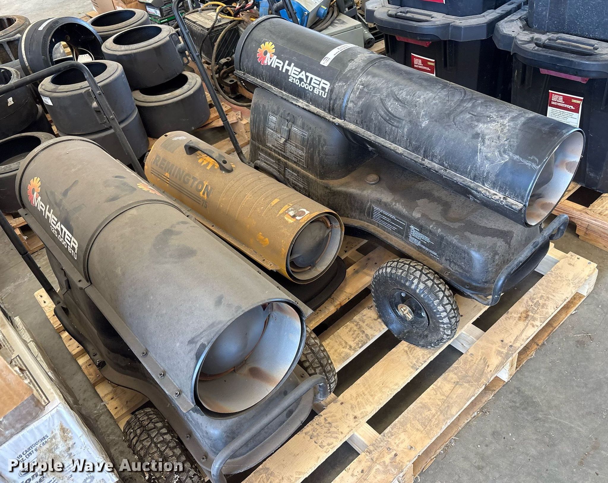 Purple Wave is selling a used Portable Heater or Fan in Texas. This item is a Heaters with the following: Mr. Heater, BTU: 210,000, Fuel type: Diesel, Kerosene, Non-operational, Mr. Heater, BTU: 125,000, Fuel type: Diesel, Kerosene, Non-operational, Remington, BTU: 75,000, Fuel type: Diesel, Kerosene