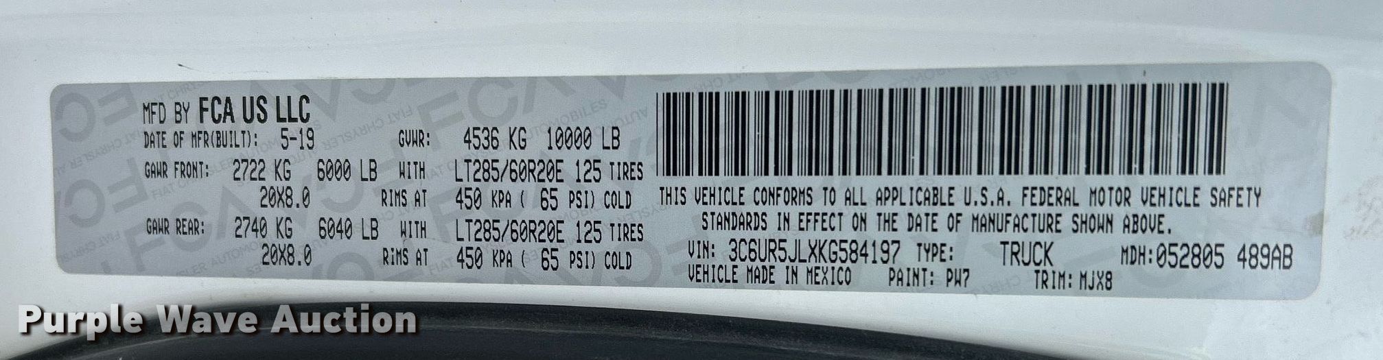 - VIN: 3C6UR5JLXKG584197