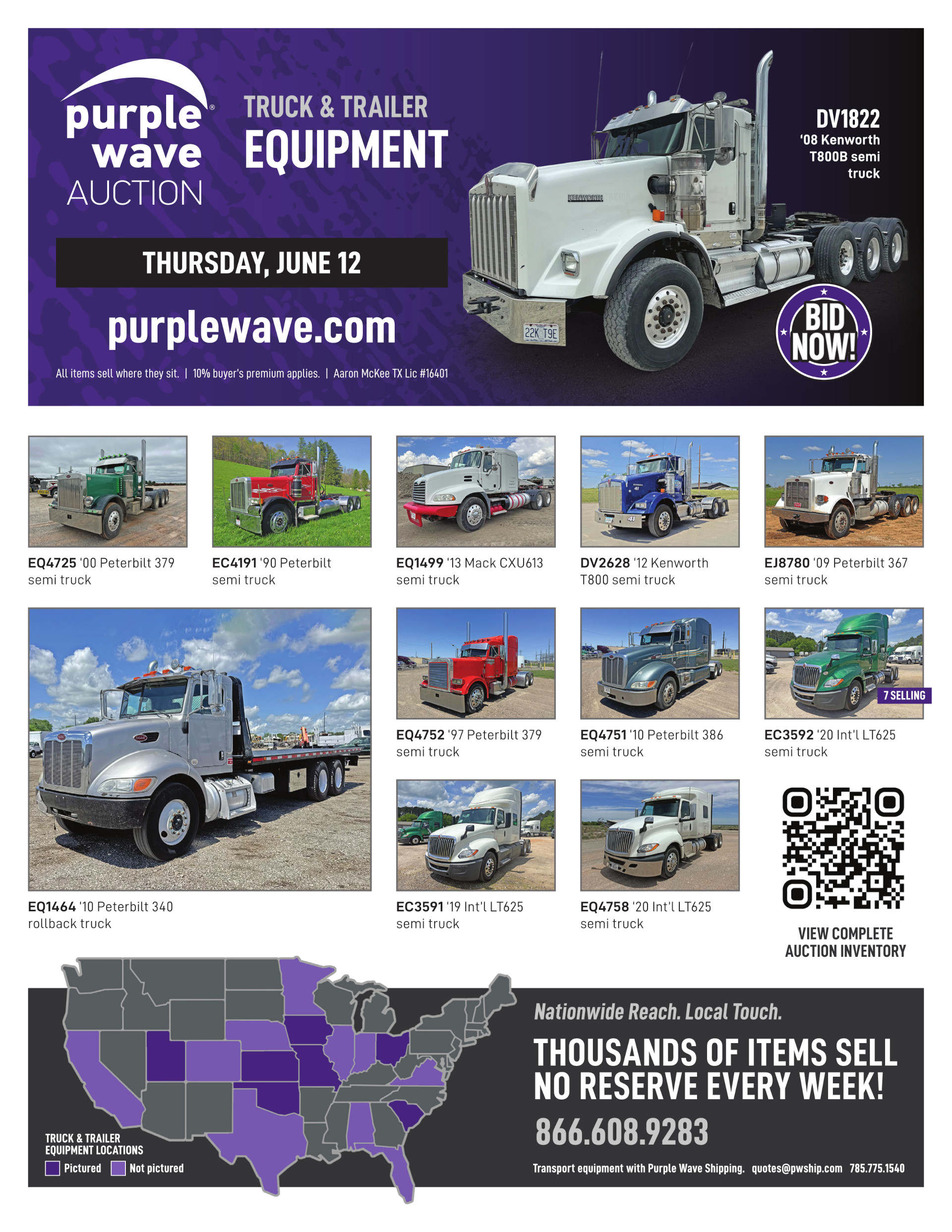 Purple Wave Shipping, LLC provides shipping and transportation services to winning bidders on ag, construction and fleet type assets. Purple Wave Shipping, LLC does not provide shipping on items weighing less than 1,000 pounds.