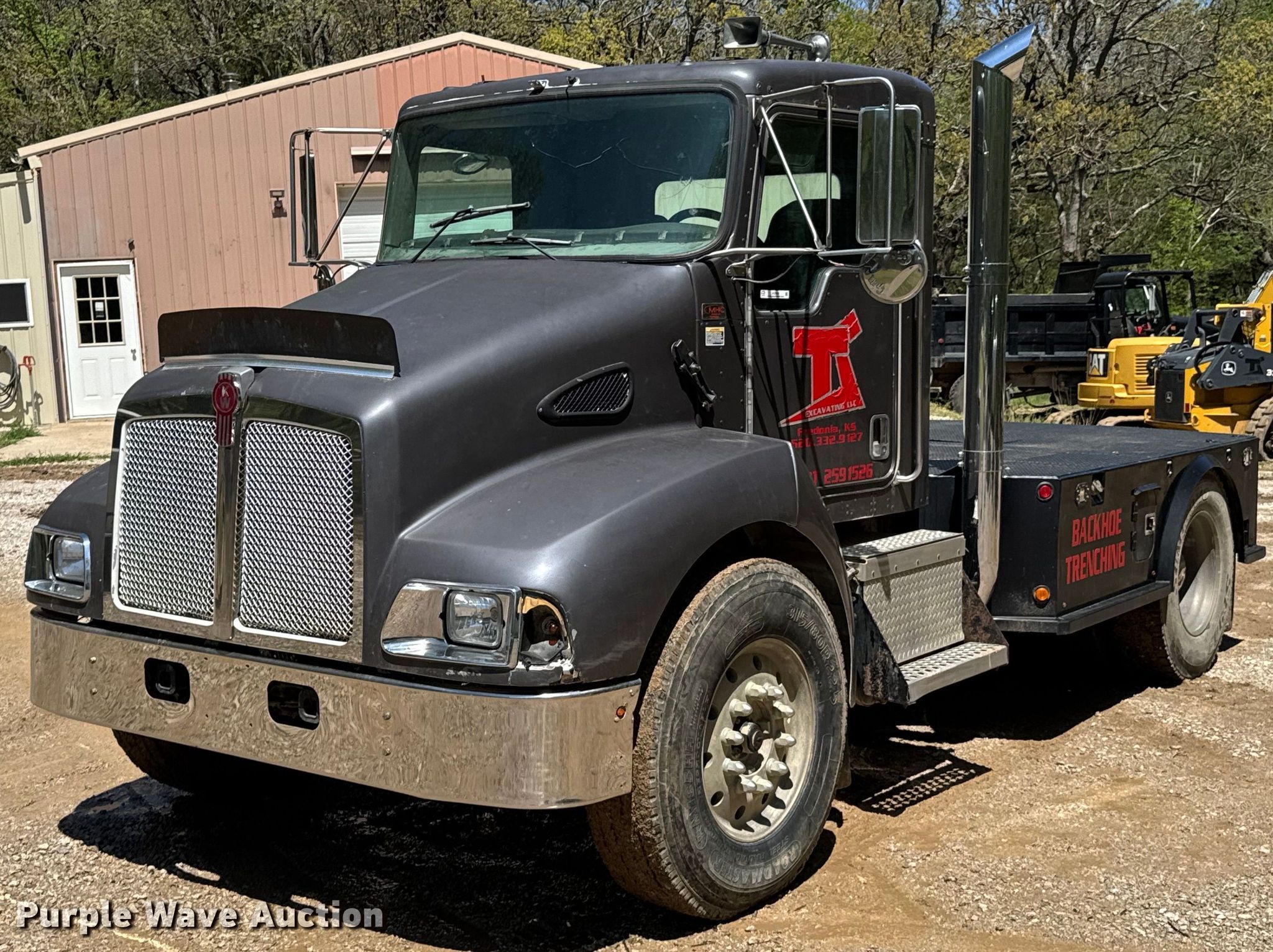 2005 Kenworth T300 flatbed truck. Miles: 378,389 on odometer, Hours: 5,798 on meter, VIN: 2XKMAZ7X15M095365. Engine Cummins ISC, Displacement: 8.3L, Cylinders: 6, Fuel type: Diesel. Transmission Eaton Fuller, Manual, Speed: 10. Chassis Axles: Single, Suspension: Air, Brakes: Air. Interior AC, Heat, Heated mirrors, Cruise control. Features Fuel tank: Single, Flatbed 10'2" L x 96" W, Hitch: Gooseneck. Tires Front: 315/80R22.5, Rear: 11R22.5. Notes Windshield chipped or cracked. Kansas title. Title distribution may be delayed up to 14 days from verification of funds. TS Excavating. Fredonia, KS 66736