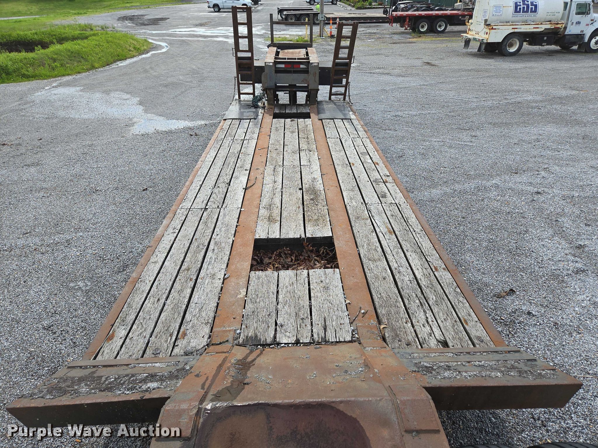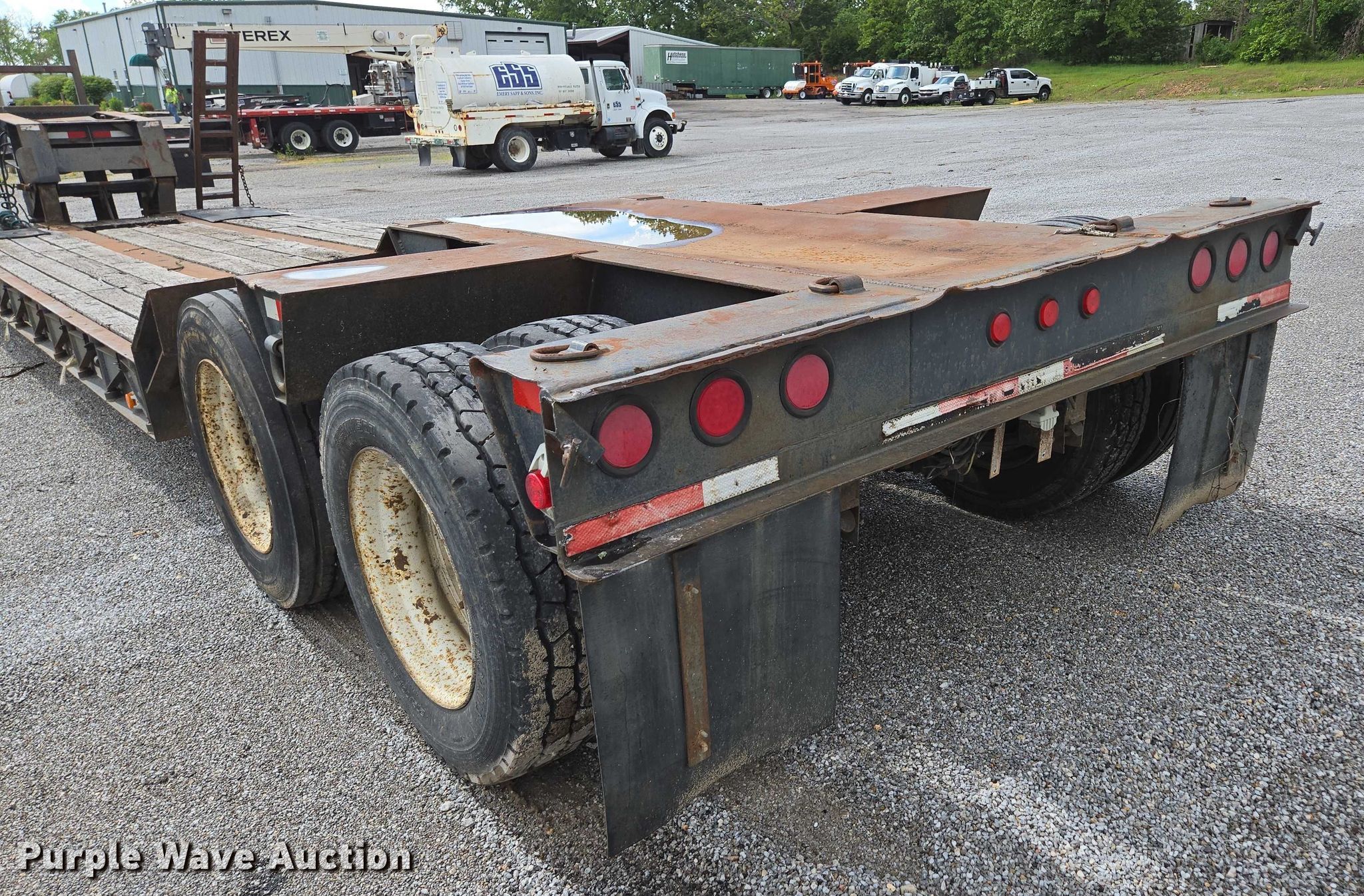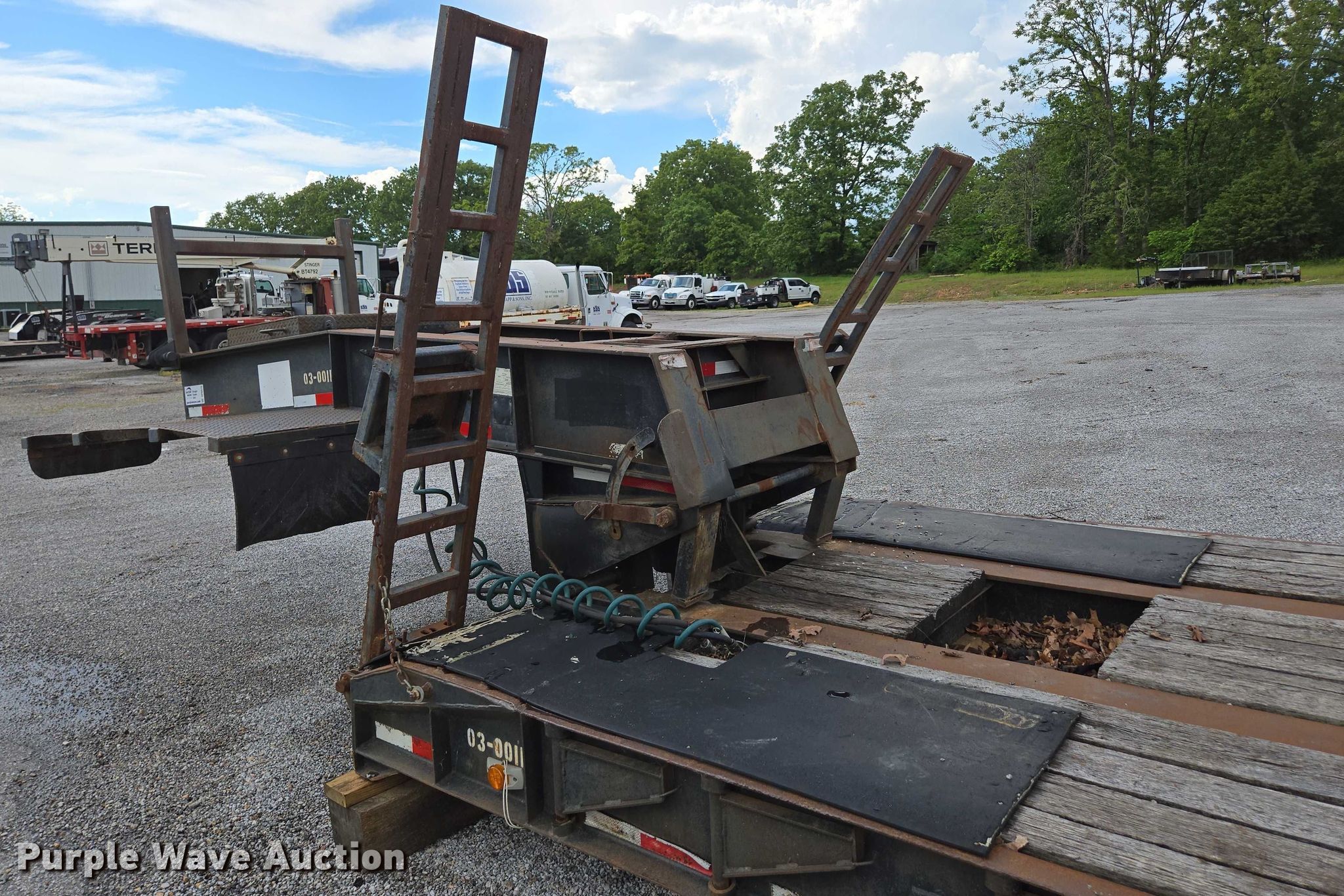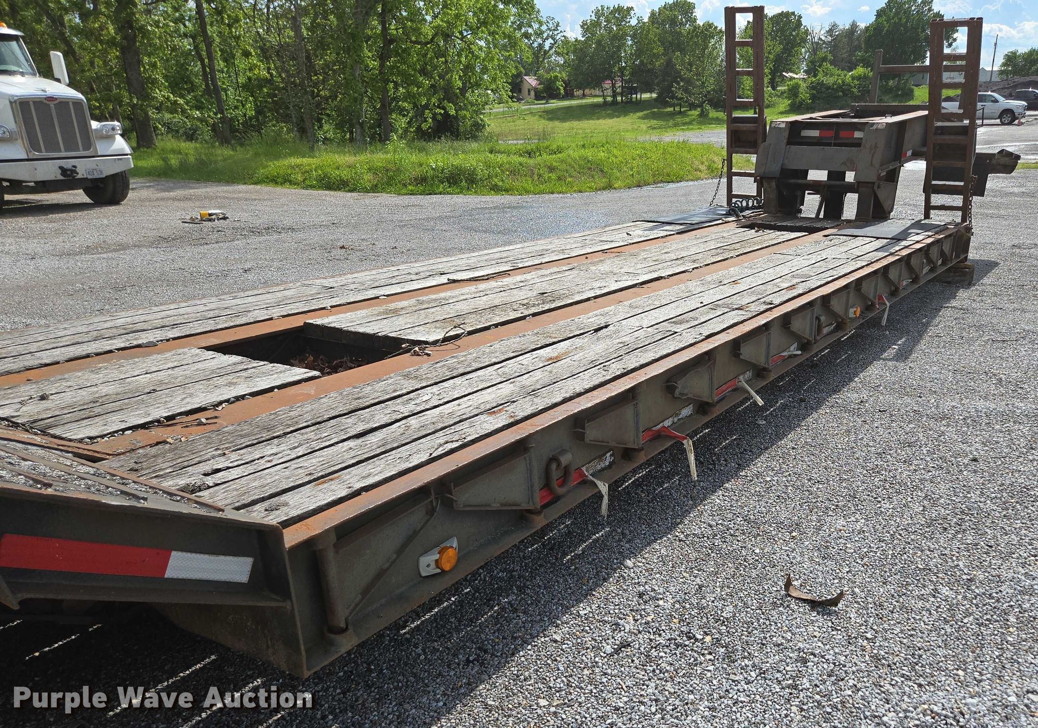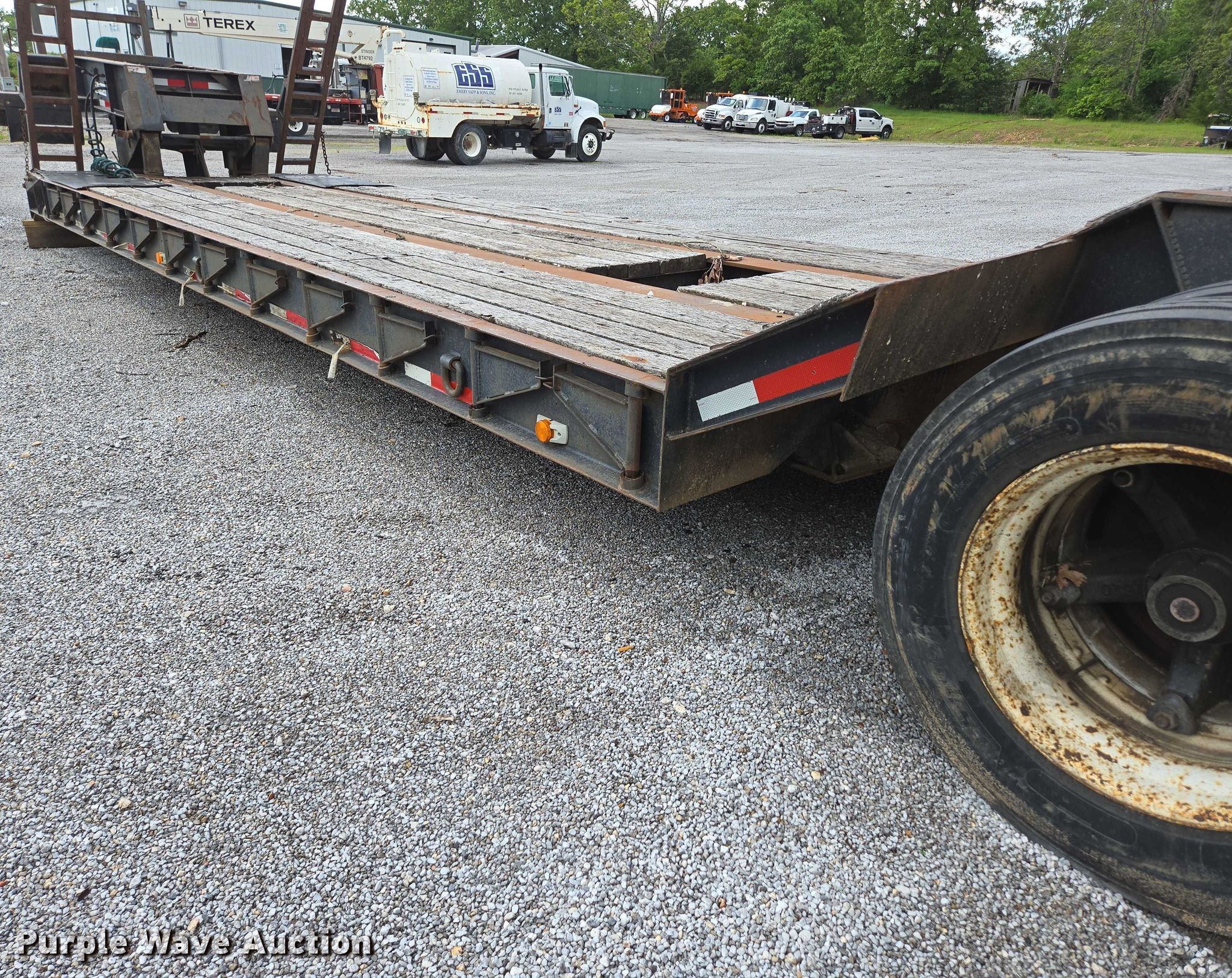 1993 Witzco Trailers Inc. RG-35 lowboy equipment trailer. VIN: 1W9A11D25PS061056, Unit #: 03-0011/85-401. Dimensions Overall: 43' 8" L x 8' 6" W, Deck: 22' 7" L x 8' 6" W, Rear deck length: 7' 11", Deck height: 23", Ramps: Manual Length: 6' 6". Features Deck type: Wood, Outriggers: Swing-out Board size: 12", Neck type: Detachable, Self-contained hydraulics. Chassis Landing gear: Single, Suspension: Spring, Brakes: Air, Axles: Tandem, GVWR: 85,850 lbs. Tires Steel wheels, Size: 275/70R22.5. Notes Contents not included, Self-Contained hydraulics not connected. Missouri title. Title distribution may be delayed up to 30 days from verification of funds. Emery Sapp & Sons, Inc. Cassville, MO 65625