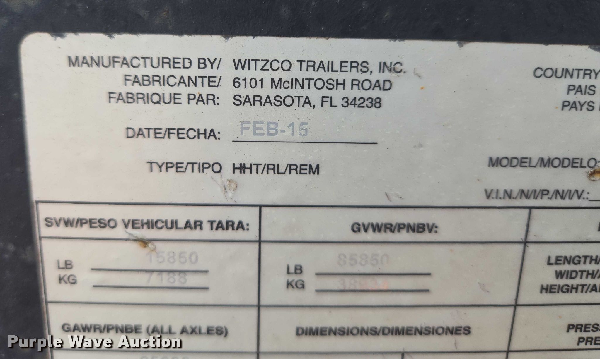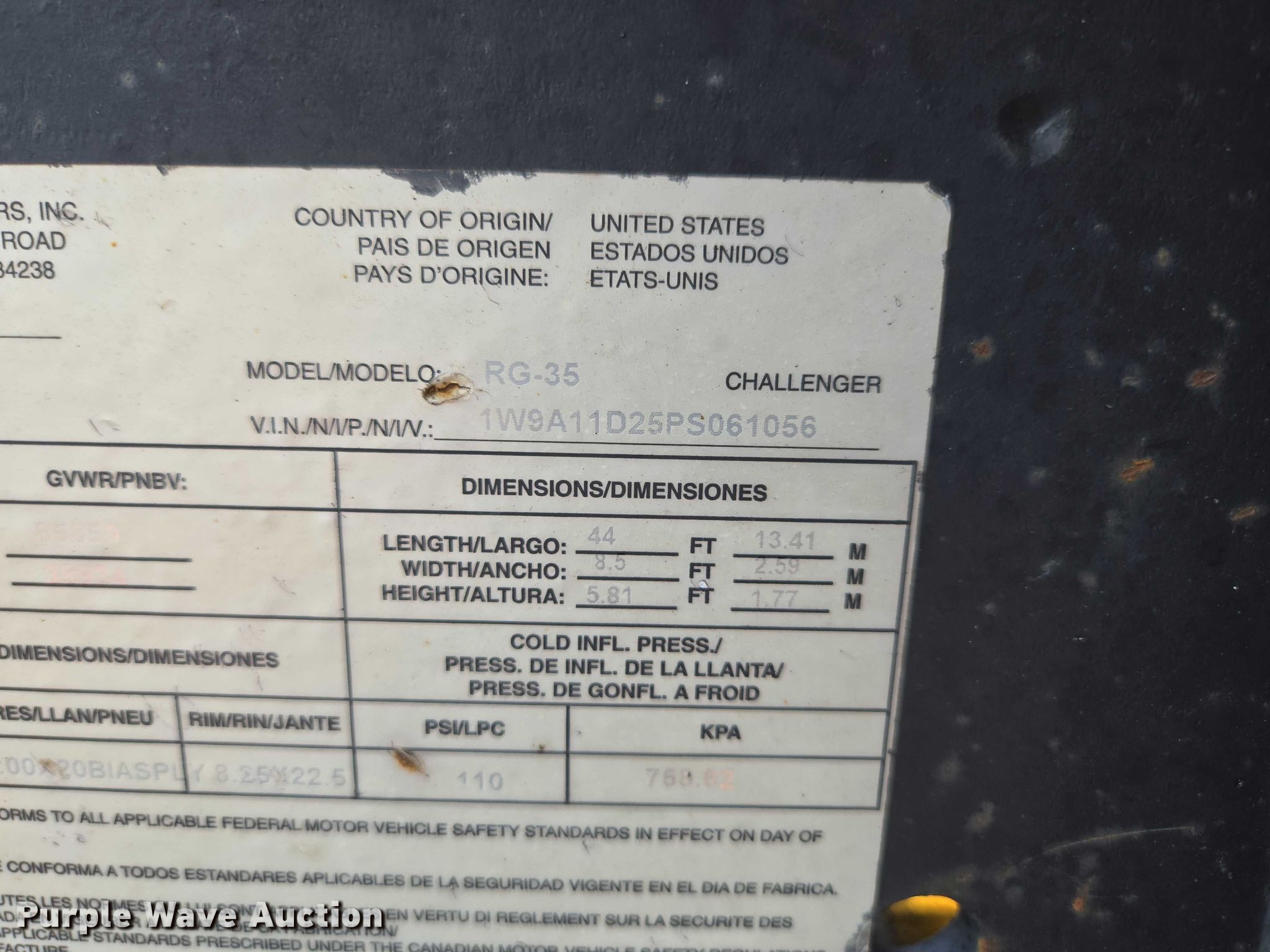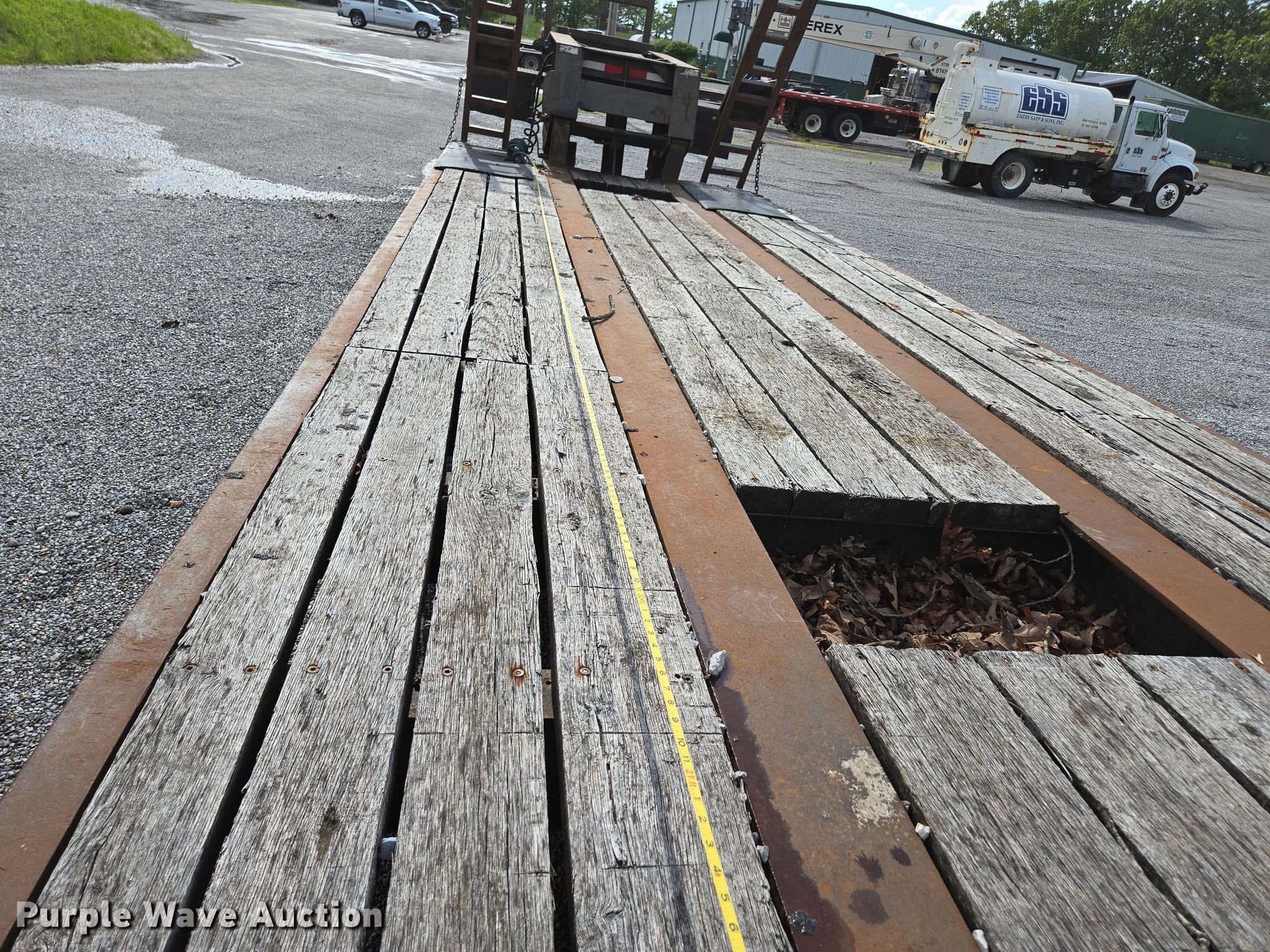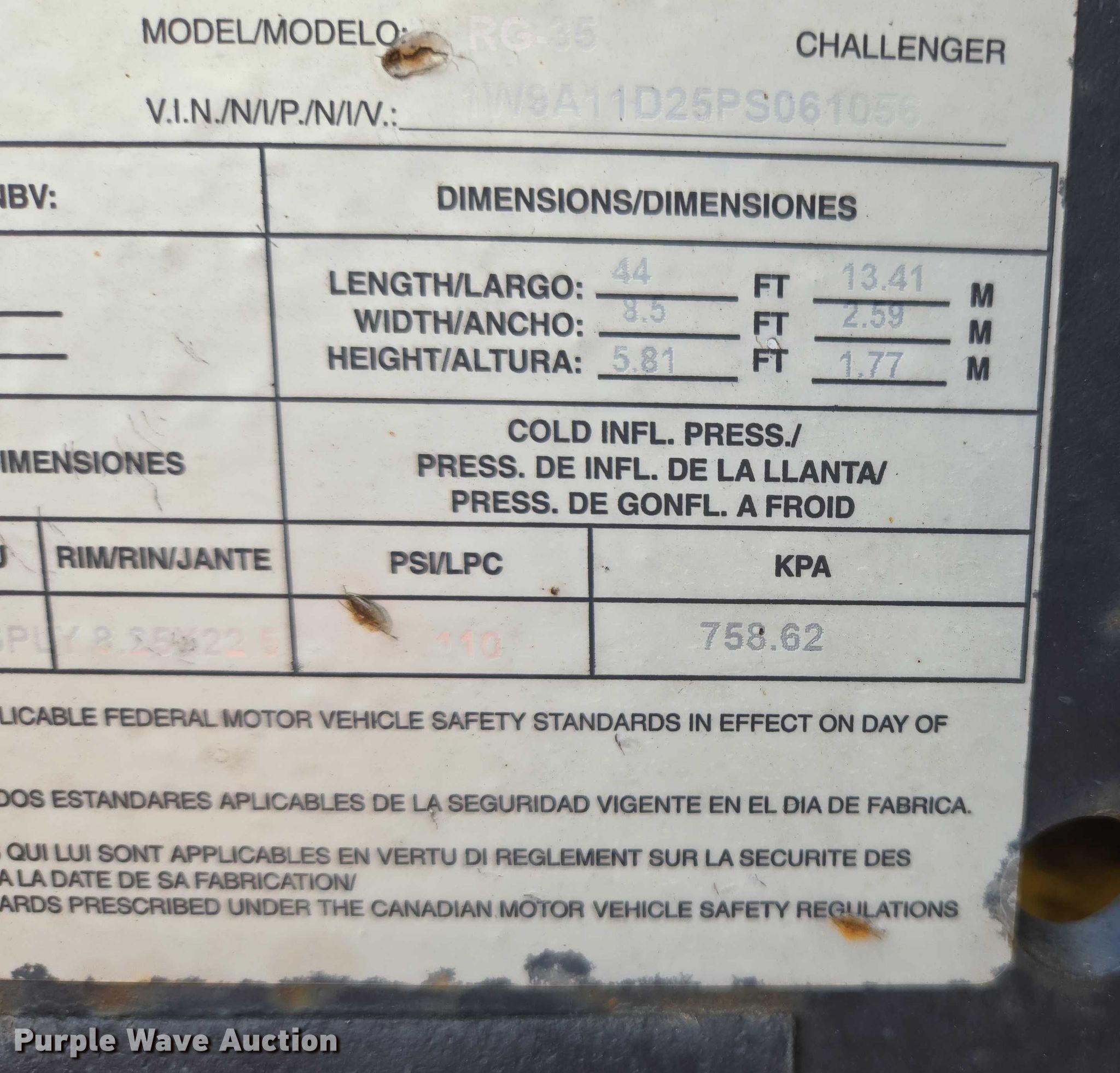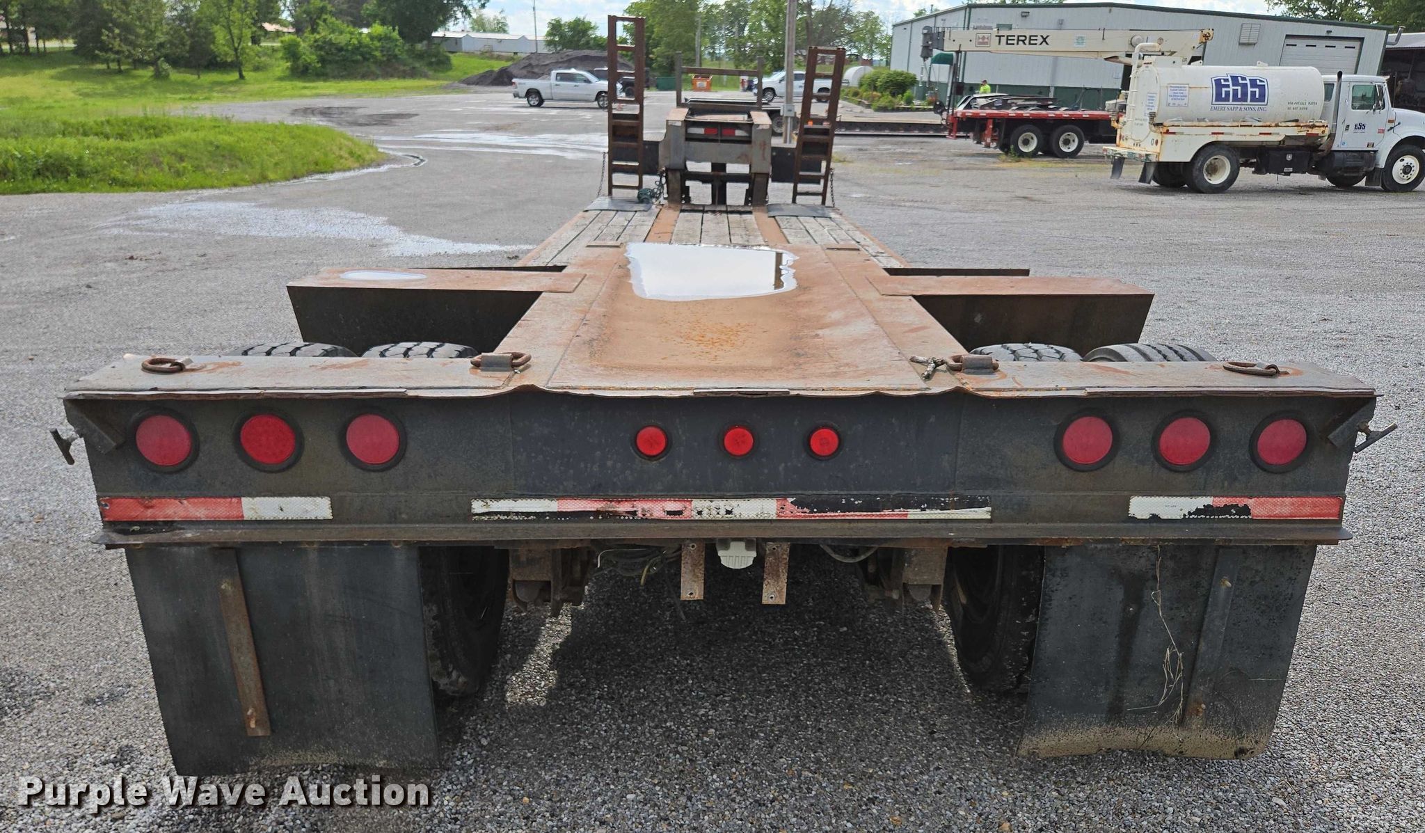 1993 Witzco Trailers Inc. RG-35 lowboy equipment trailer. VIN: 1W9A11D25PS061056, Unit #: 03-0011/85-401. Dimensions Overall: 43' 8" L x 8' 6" W, Deck: 22' 7" L x 8' 6" W, Rear deck length: 7' 11", Deck height: 23", Ramps: Manual Length: 6' 6". Features Deck type: Wood, Outriggers: Swing-out Board size: 12", Neck type: Detachable, Self-contained hydraulics. Chassis Landing gear: Single, Suspension: Spring, Brakes: Air, Axles: Tandem, GVWR: 85,850 lbs. Tires Steel wheels, Size: 275/70R22.5. Notes Contents not included, Self-Contained hydraulics not connected. Missouri title. Title distribution may be delayed up to 30 days from verification of funds. Emery Sapp & Sons, Inc. Cassville, MO 65625