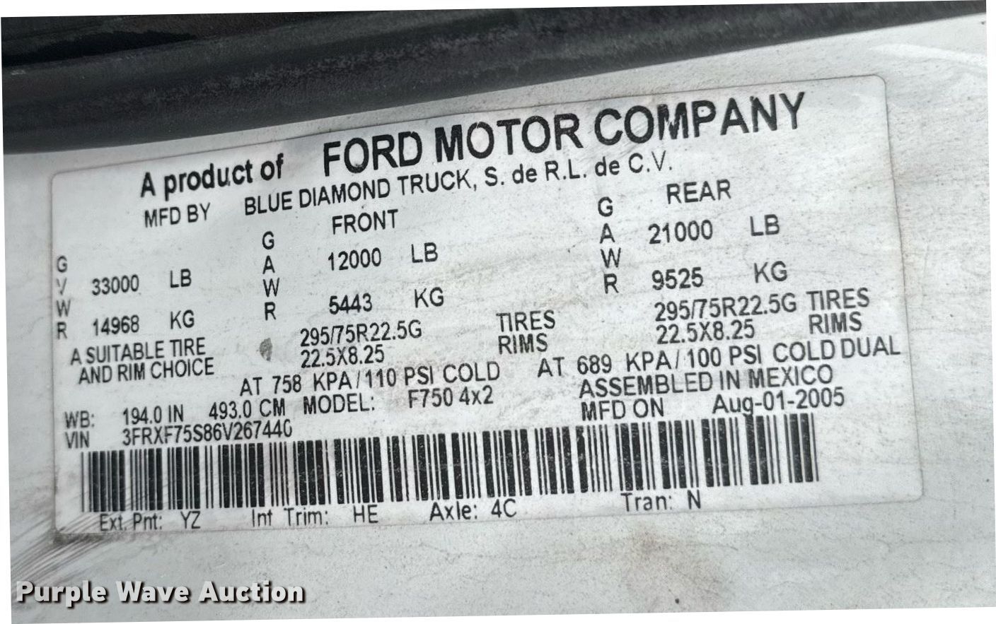 Purple Wave is selling a used Truck Chassis in Virginia. This item is a 2006 Ford F750 Super Duty truck cab and chassis with the following: Miles: 209,010 on odometer, VIN: 3FRXF75S86V267440