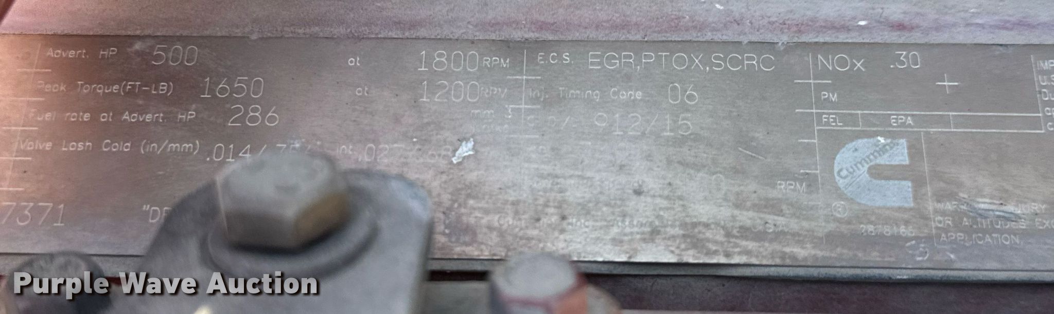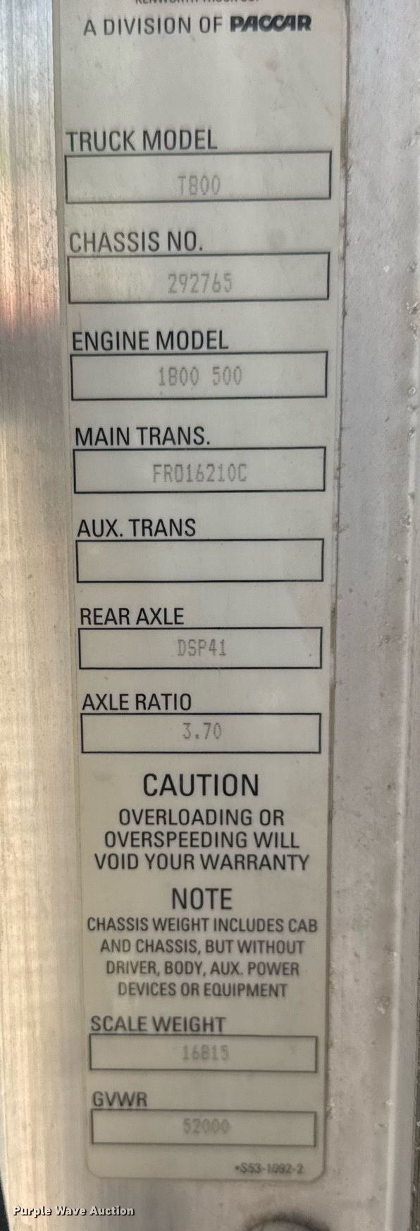 2011 Kenworth T800 semi truck. Miles: 668,555 on odometer, Hours: 29,042 on meter, VIN: 1XKDD49X2BJ292765. Engine Cummins ISX15 500, Serial: 79442336, Displacement: 15.0L, Cylinders: 6, Fuel type: Diesel, HP: 500, Engine brake. Transmission Eaton Fuller, Manual, Speed: 10. Chassis Axles: Tandem, Gear ratio: 3.70, Differential lock: Full, Suspension: Air Dump valves, Brakes: Air, GVWR: 52,000 lbs FAWR: 12,000 lbs, IAWR: 20,000 lbs, RAWR: 20,000 lbs. Interior AC, Heat, Heated mirrors, Power passenger window, Power locks, Cruise control, Air ride cab. Features Deck plate: Aluminum, Fifth wheel type: Air operated, Sliding, Fuel tank: Single. Tires Front: 285/75R24.5, Rear: 11R22.5. Notes Dash warning indicator: Service Engine, Service Exhaust, DEF system issues, Unit must be towed or hauled, Battery issues, weak. Kansas title. Title distribution may be delayed up to 14 days from verification of funds. Midland Marketing. Plainville, KS 67663