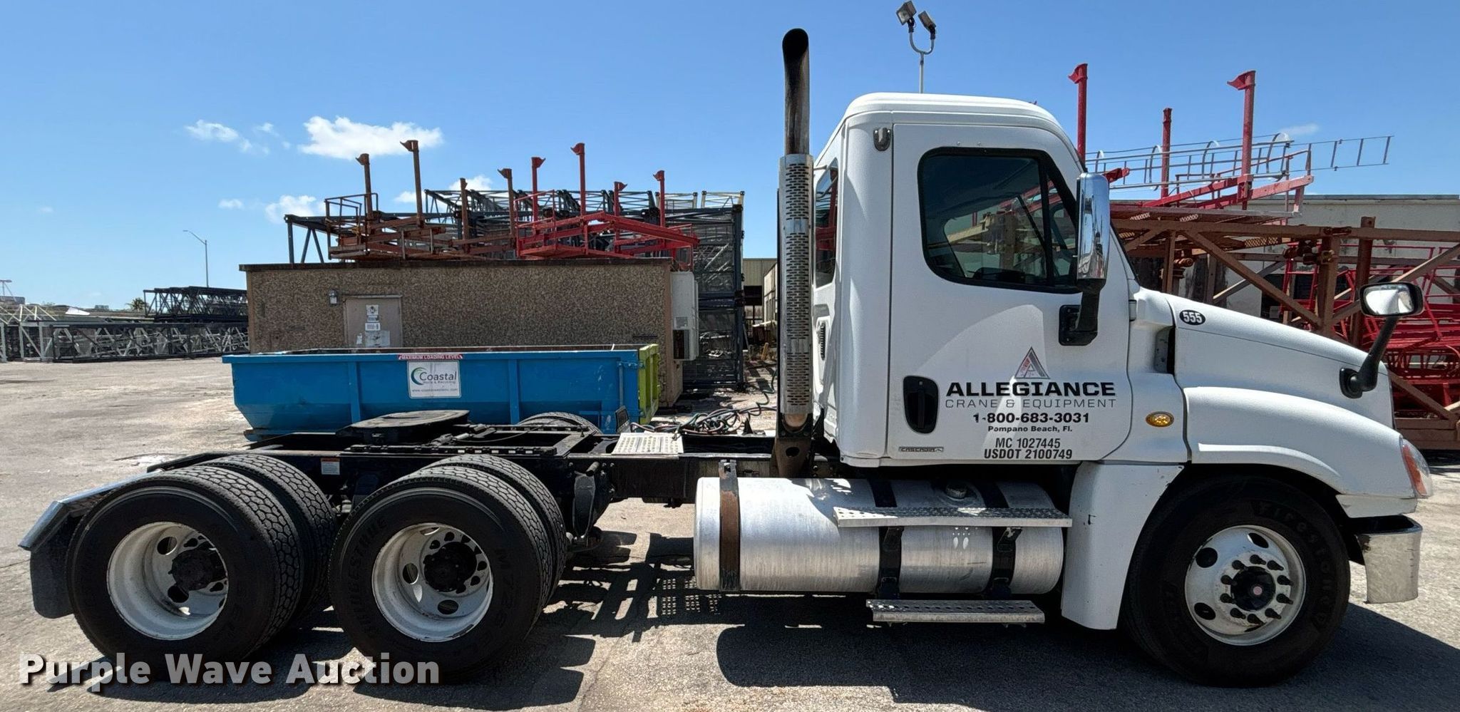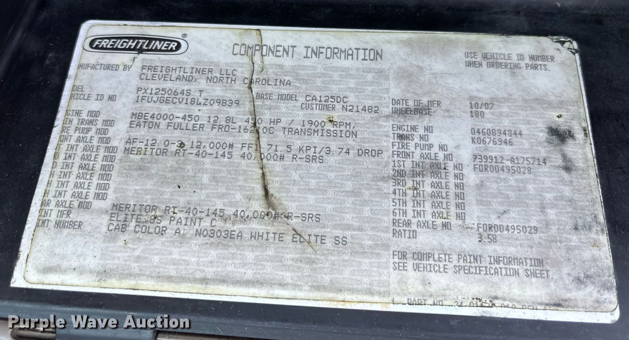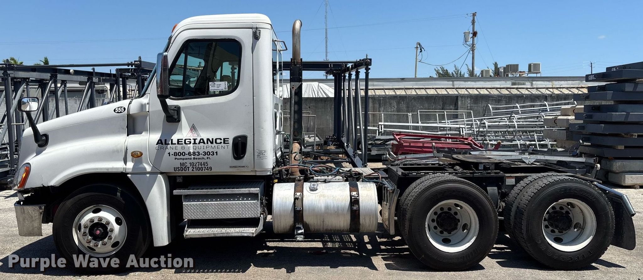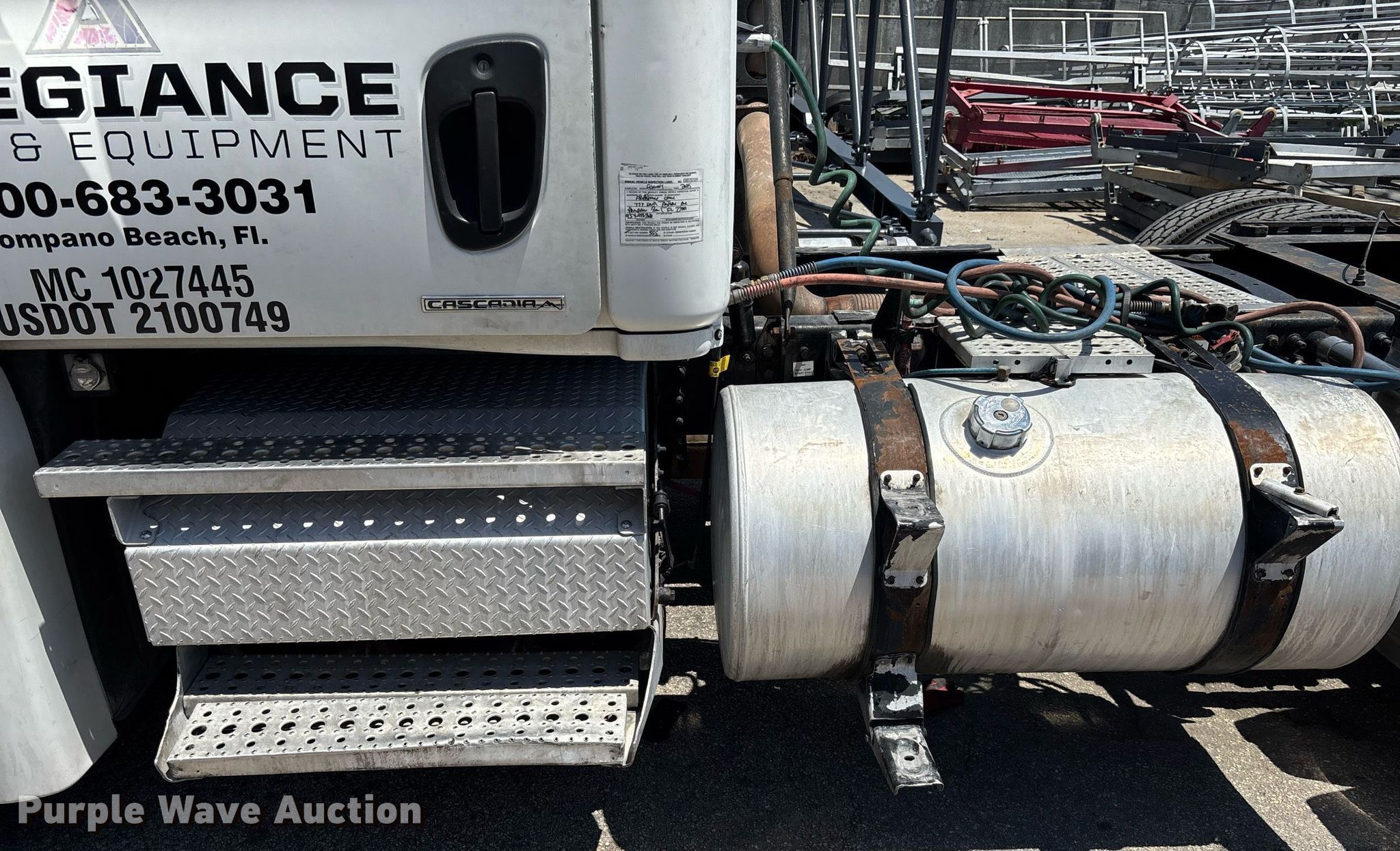 2008 Freightliner Cascadia semi truck. Kilometers: 900,816 on odometer, VIN: 1FUJGECV18LZ09839, Unit #: 555. Engine Mercedes-Benz, Displacement: 12.8L, Cylinders: 6, Fuel type: Diesel, Engine brake. Transmission Eaton Fuller FRO-16210C, Manual, Speed: 10. Chassis Axles: Tandem, Differential lock: Inter-axle, Suspension: Air, Brakes: Air, GVWR: 52,000 lbs. Interior AC, Heat, Heated mirrors, Power windows, Power locks, Cruise control, Air ride cab. Features Deck plate: Aluminum, Fifth wheel type: Air operated, Sliding, Fuel tank: Dual. Tires Front: 12R22.5, Rear: 11R22.5. Notes Dash warning indicator: Check engine. Florida title. Title distribution may be delayed up to 30 days from verification of funds. Allegiance Crane & Equipment. Fort Lauderdale, FL 33311