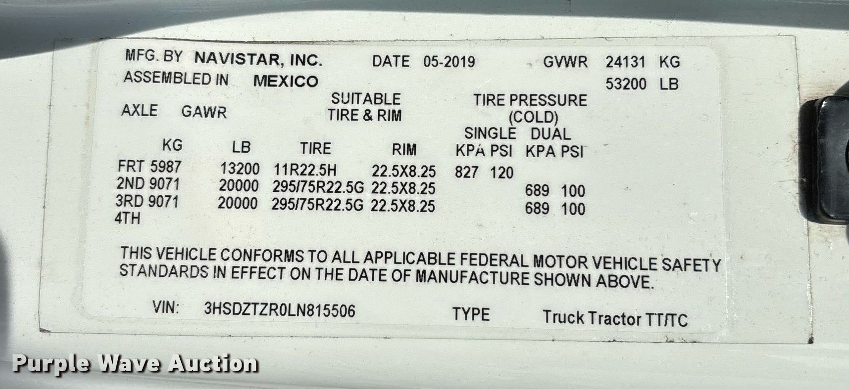 2020 International LT625 semi truck. Miles: 410,609 on odometer, Hours: 13,141 on meter, VIN: 3HSDZTZR0LN815506. Engine International A26, Displacement: 12.4L, Cylinders: 6, Fuel type: Diesel, Engine brake. Transmission Automated manual. Chassis Axles: Tandem, Differential lock: Inter-axle, Suspension: Air Dump valves, Brakes: Air, GVWR: 53,200 lbs FAWR: 13,200 lbs, RAWR: 40,000 lbs. Interior AC, Heat, Heated mirrors, Power windows, Power locks, Cruise control, Air ride cab, Sleeper Sleeper length: 68", Beds: Single, Rear climate control. Features Deck plate: Aluminum, Fifth wheel type: Air operated, Sliding, Fuel tank: Dual. Tires Front: 295/75R22.5, Rear: 275/80R22.5. Pennsylvania title. Title distribution may be delayed up to 30 days from verification of funds. Oasis Logistics. York, SC 29745
