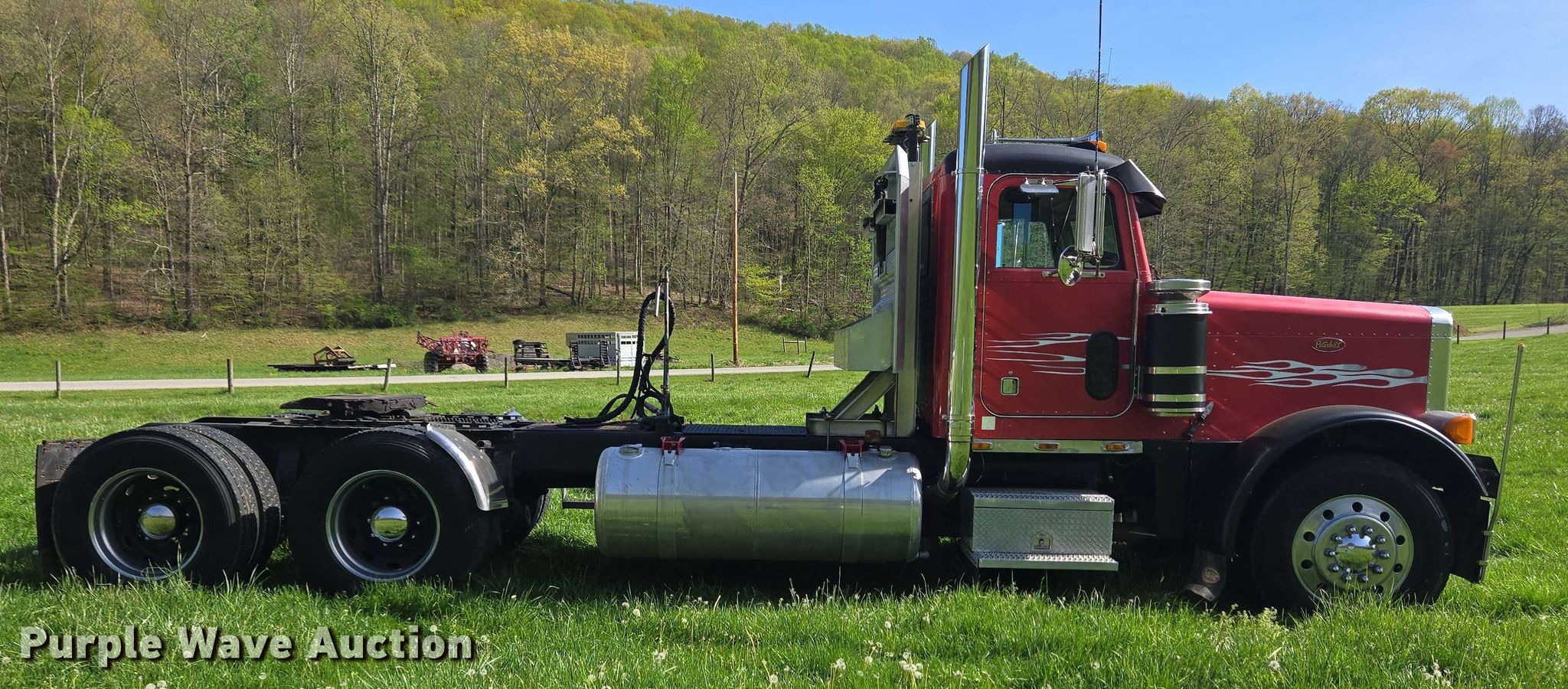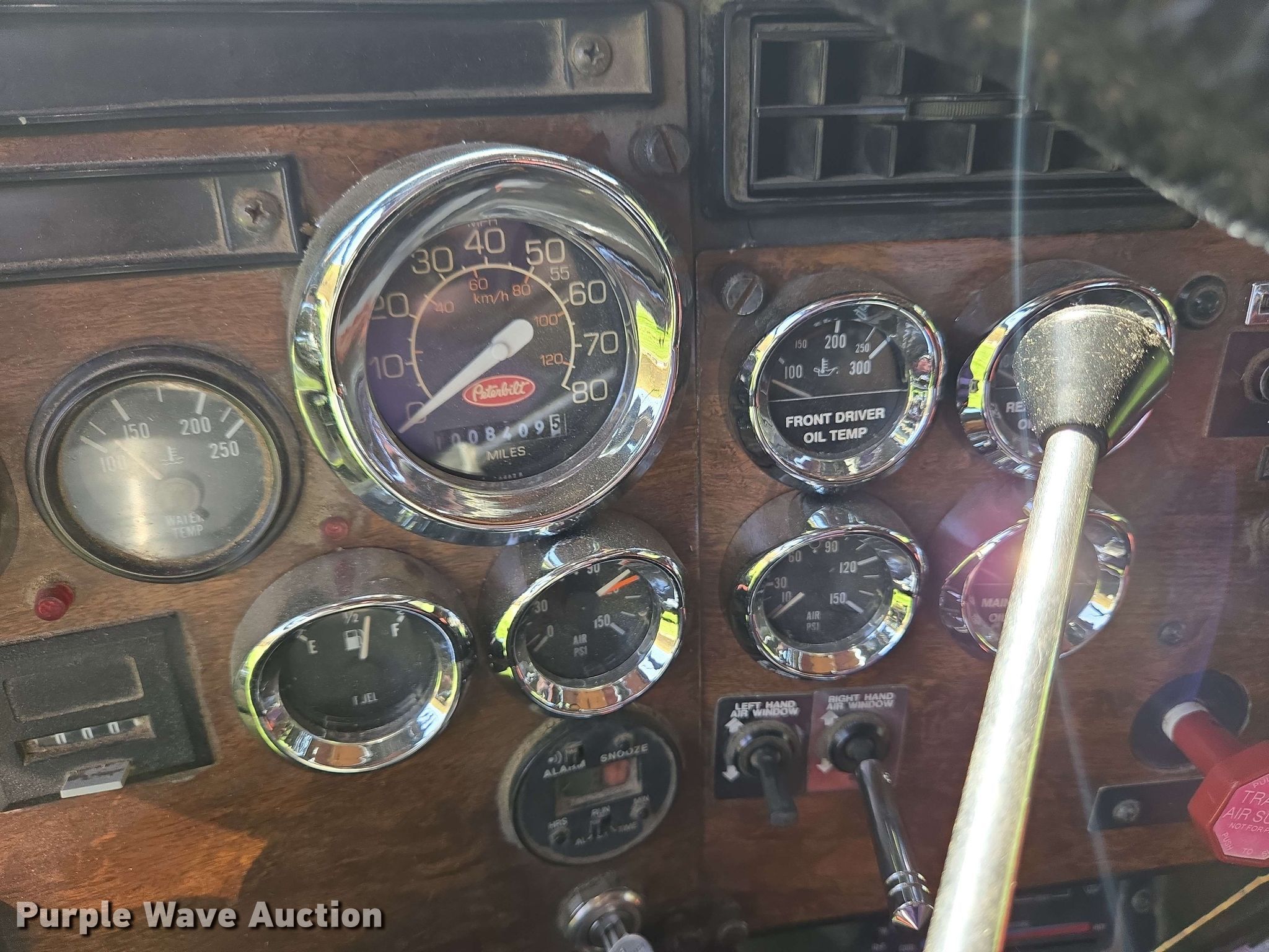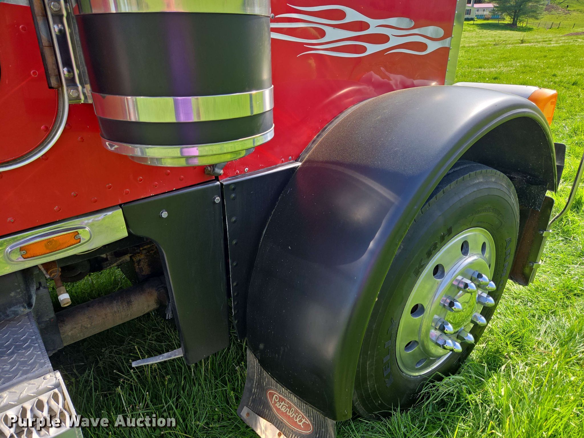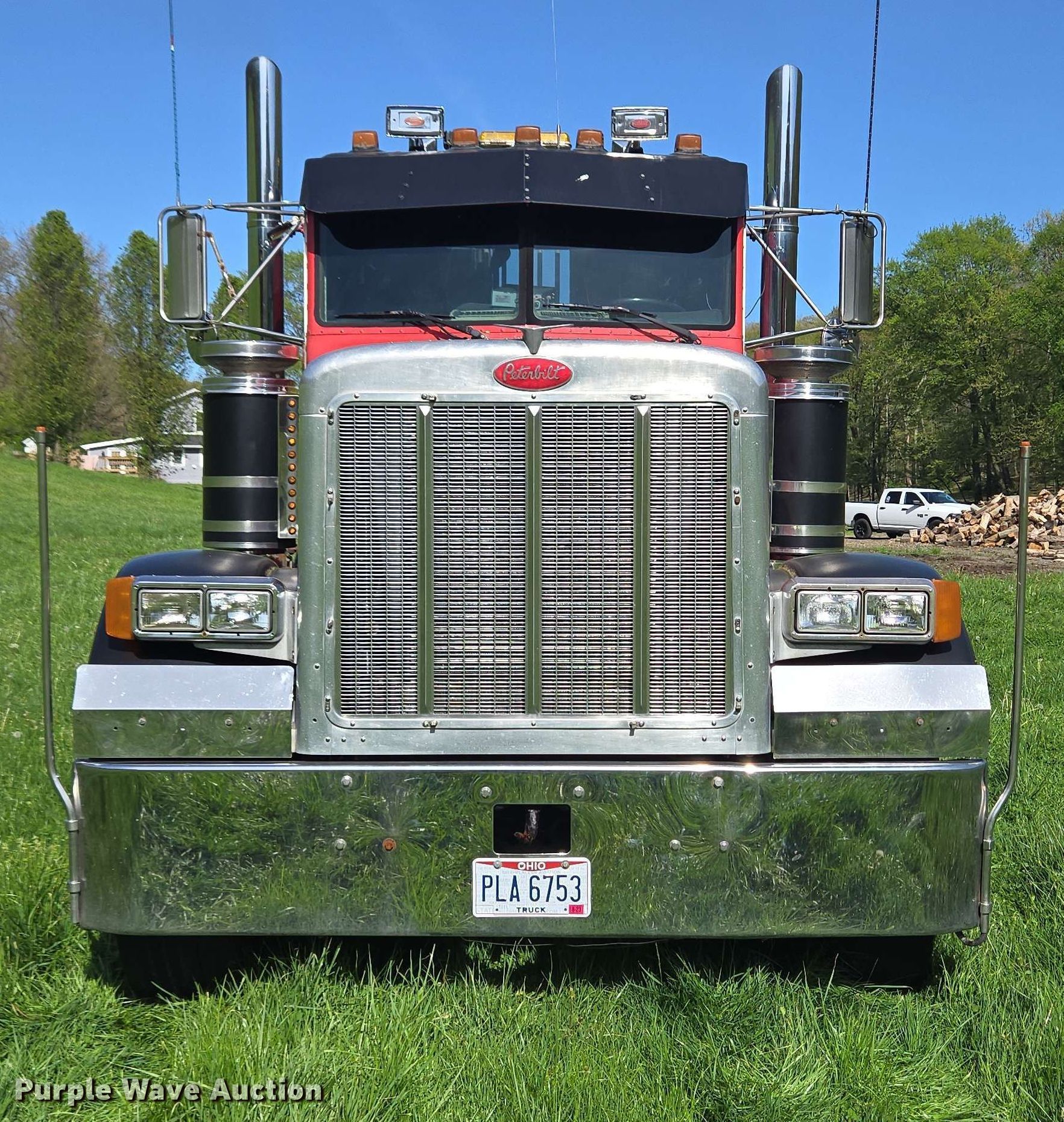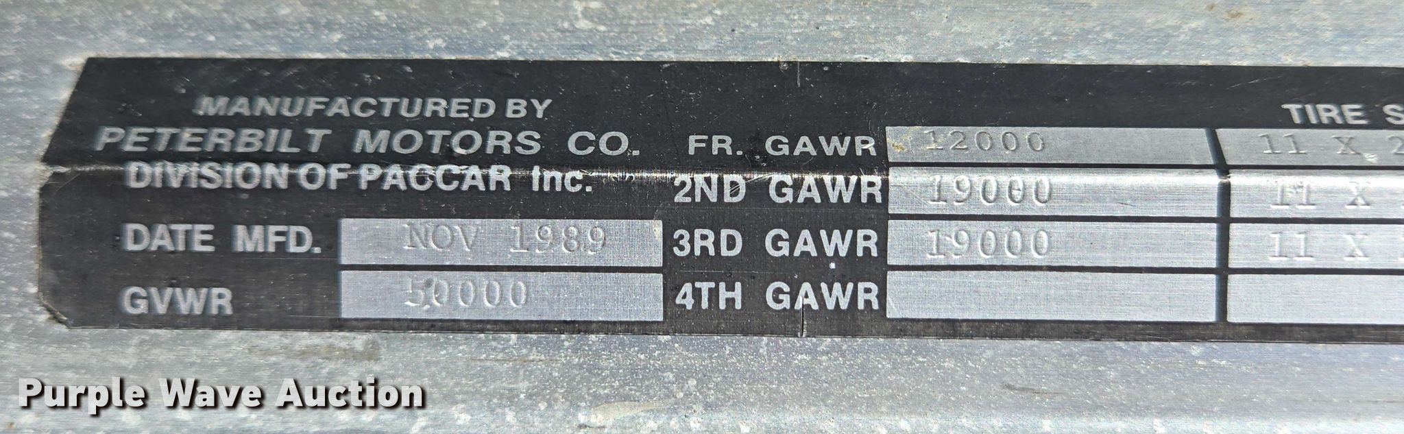 1990 Peterbilt semi truck. VIN: 1XP5DB9X8LN293982. Engine Caterpillar, Displacement: 14.6L, Cylinders: 6, Fuel type: Diesel. Transmission Eaton Fuller, Manual, Speed: 15. Chassis Axles: Tandem, Suspension: Air, Brakes: Air, GVWR: 50,000 lbs FAWR: 12,000 lbs, IAWR: 19,000 lbs, RAWR: 19,000 lbs. Interior AC, Heat, Power windows. Features Deck plate: Aluminum, Fifth wheel type: Sliding, Fuel tank: Dual. Tires Size: 11R24.5. Ohio title. Title has a lien that will be released following the close of the auction. Title distribution may be delayed up to 30 days from verification of funds. Shull Farms. Sugar Grove, OH 43155