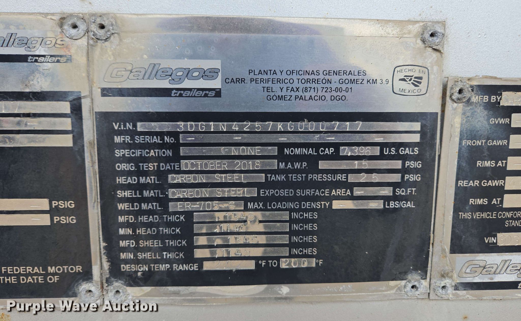 Purple Wave is selling a used Tank Trailer in Ohio. This item is a 2019 Gallegos pneumatic dry bulk trailer with the following: VIN: 3DG1N4257KG000717