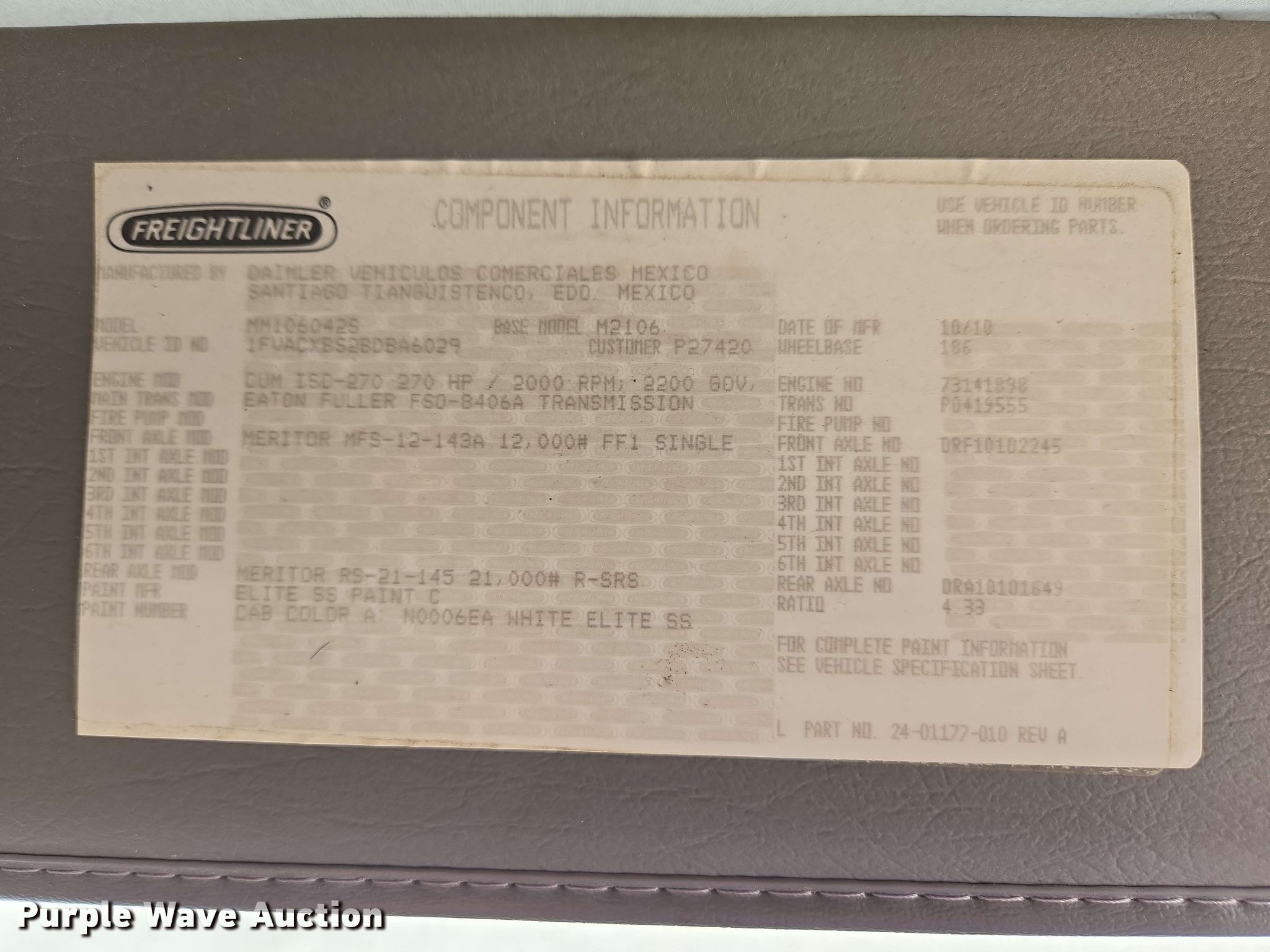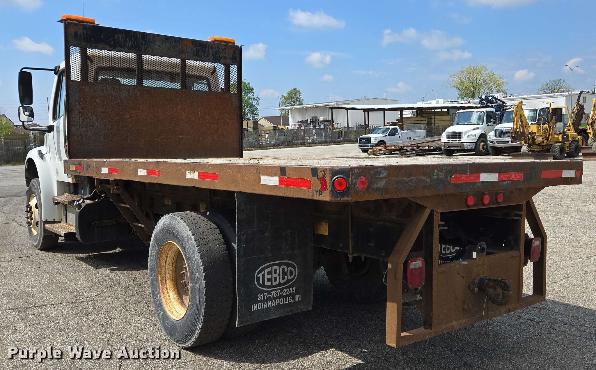 2011 Freightliner M2 flatbed truck. Miles: 279,450 on odometer, Hours: 15,266 on meter, VIN: 1FVACXBS2BDBA6029. Engine Cummins ISC, Displacement: 8.3L, Cylinders: 6, Fuel type: Diesel. Transmission Eaton Fuller FSO-8406A, Manual, Speed: 6. Chassis Axles: Single, Suspension: Spring, Brakes: Air, GVWR: 33,000 lbs, Wheelbase: 186". Interior AC, Heat, Cruise control. Features Flatbed 15' 9" L x 8' W. Tires Size: 11R22.5. Notes Dash warning indicator: Check engine. Indiana title. Title distribution may be delayed up to 14 days from verification of funds. James H. Drew Corp.. Indianapolis, IN 46268
