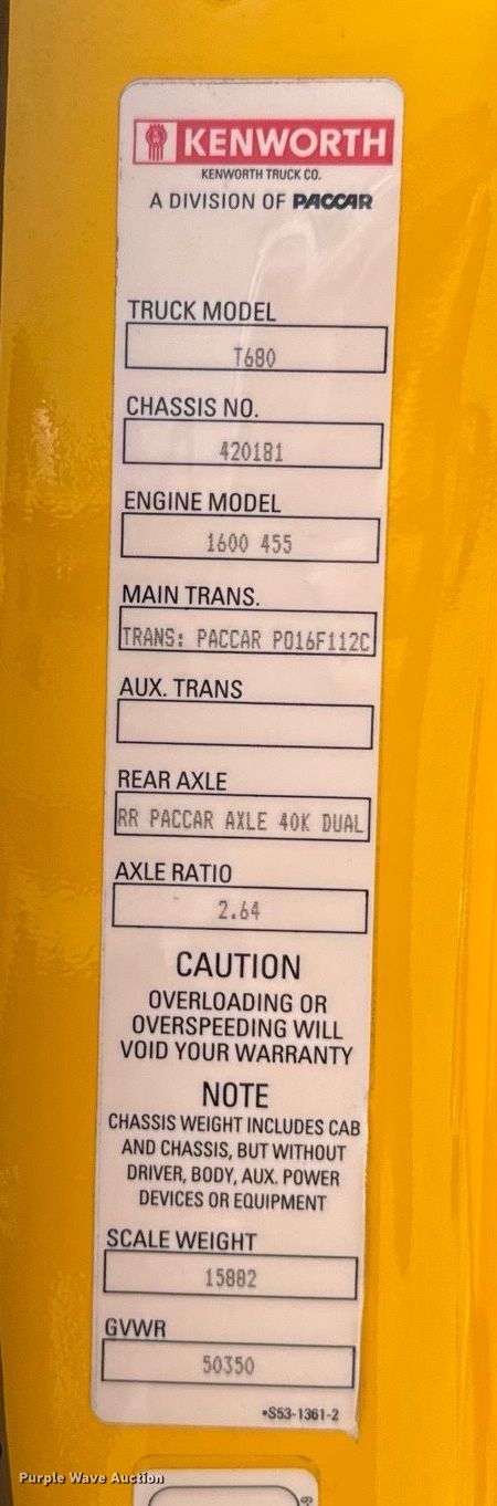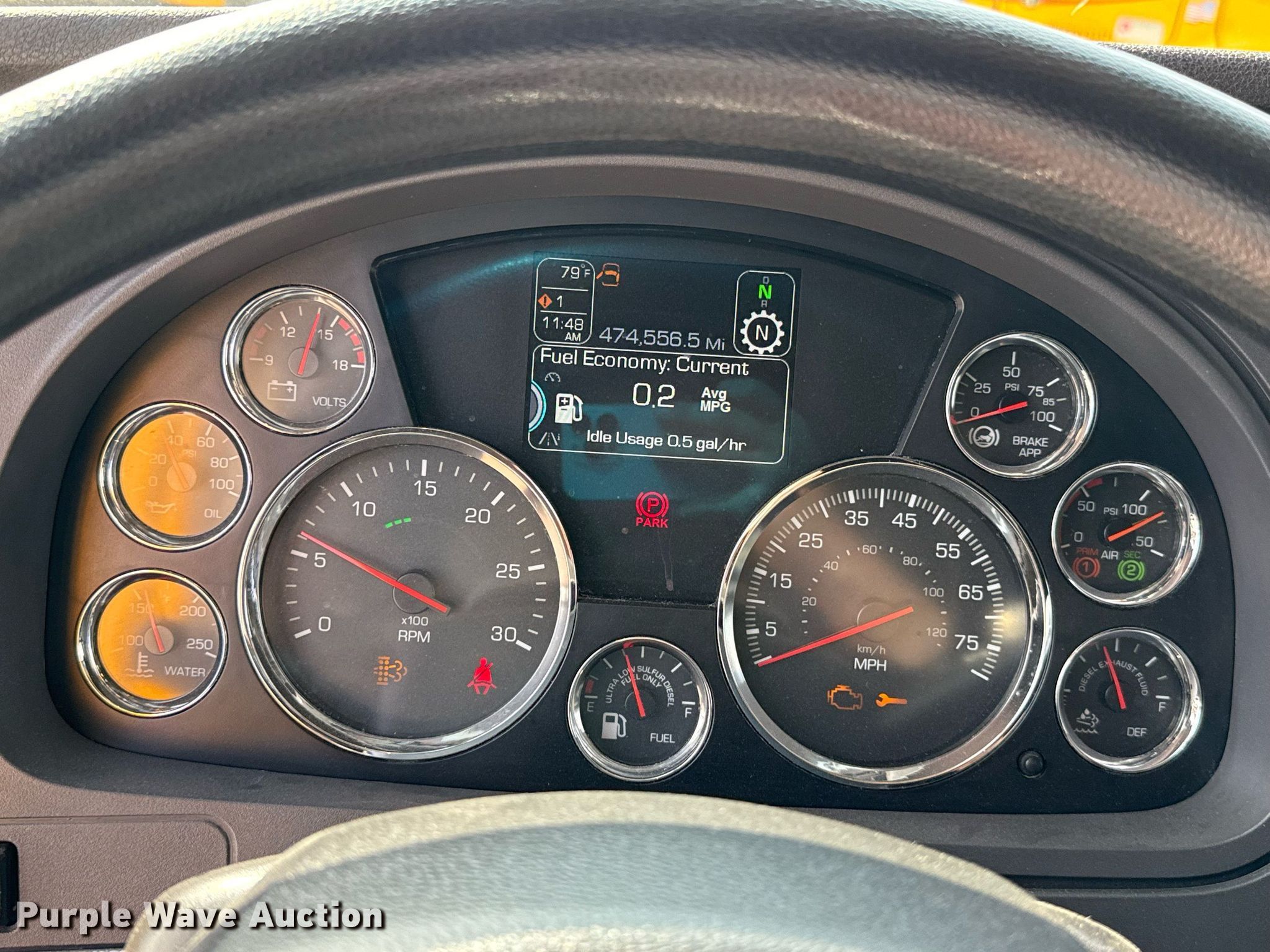 2020 Kenworth T680 semi truck. Miles: 474,557 on odometer, Engine hours: 12,846 on meter, VIN: 1XKYDP9X9LJ420181, Unit #: 2743. Engine Paccar MX-13, Displacement: 12.9L, Cylinders: 6, Fuel type: Diesel, Engine brake. Transmission Automated manual. Chassis Axles: Tandem, Differential lock: Inter-axle, Suspension: Air Dump valves, Brakes: Air, PTO, Wet kit, GVWR: 50,350 lbs FAWR: 12,350 lbs, IAWR: 19,000 lbs, RAWR: 19,000 lbs. Interior AC, Heat, Heated mirrors, Power windows, Power locks, Cruise control, Air ride cab, Sleeper Sleeper length: 63", Beds: Single, Refrigerator, Microwave, Rear climate control. Features Deck plate: Aluminum, Fifth wheel type: Fixed, Fuel tank: Dual. Tires Front: 295/75R22.5, Rear: 445/50R22.5. Notes Dash warning indicator: Check engine, Dash warning indicator: DPF Full Engine Derated, Windshield chipped or cracked. Oklahoma title. Title distribution may be delayed up to 30 days from verification of funds. Gemini Motor Transport. Oklahoma City, OK 73127