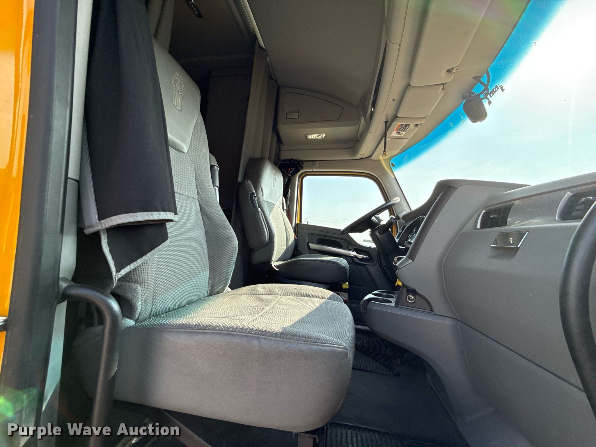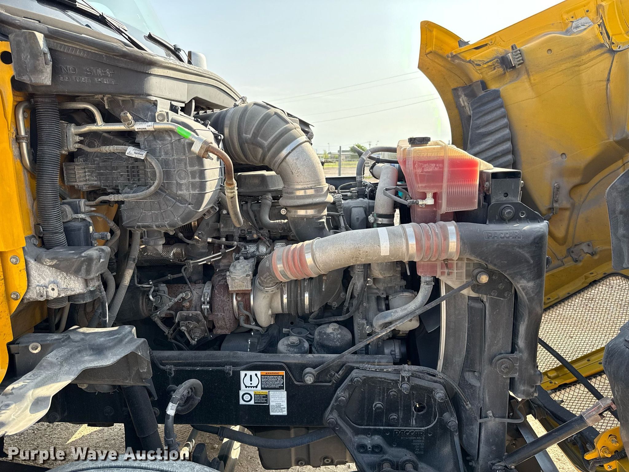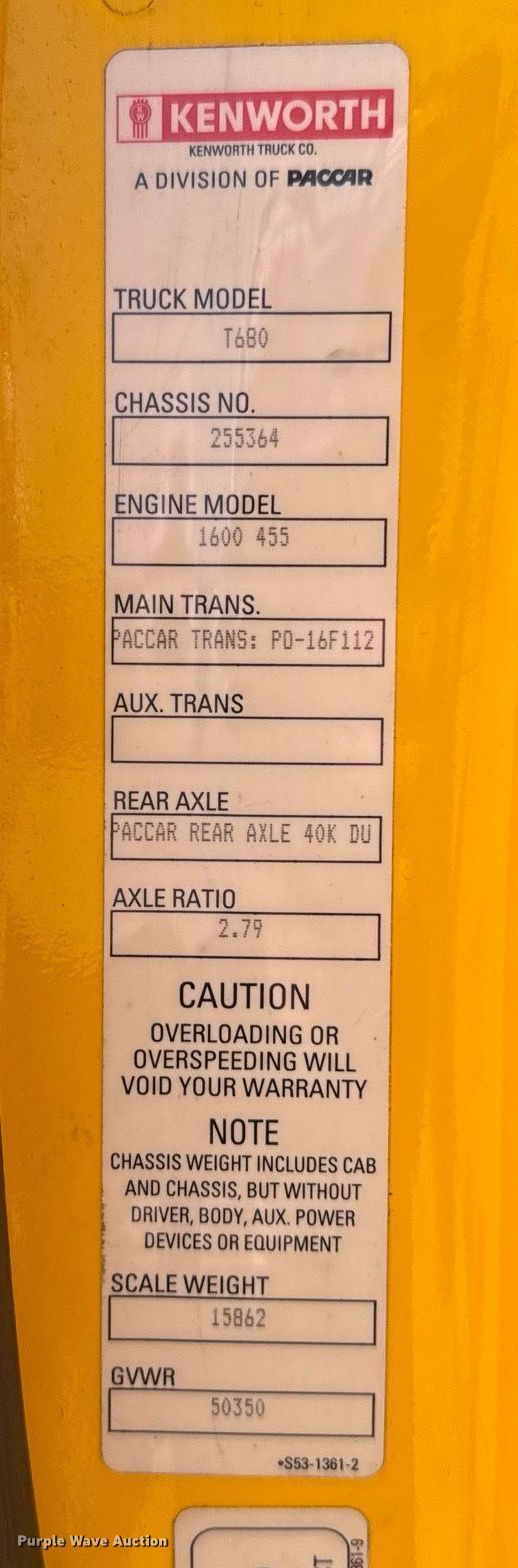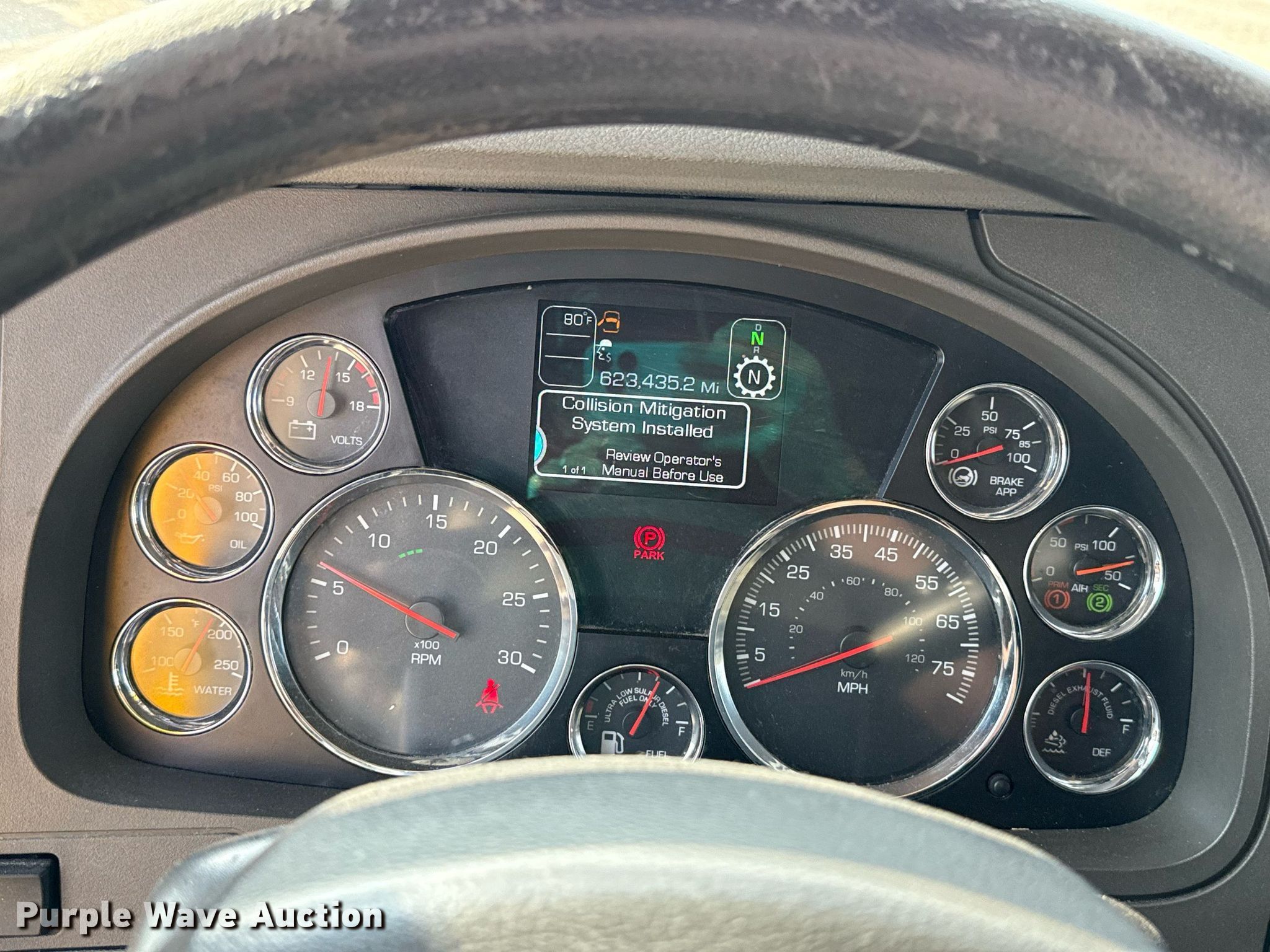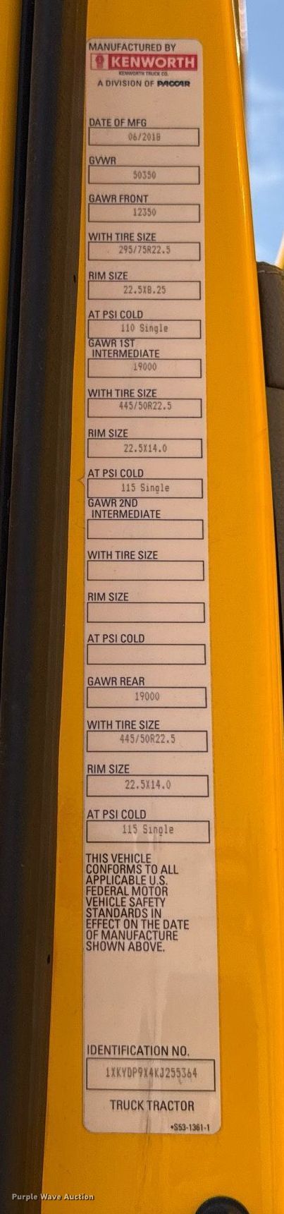 2019 Kenworth T680 semi truck. Miles: 623,435 on odometer, Engine hours: 21,090 on meter, VIN: 1XKYDP9X4KJ255364, Unit #: 2549. Engine Paccar MX-13, Serial: Y169654, Displacement: 12.9L, Cylinders: 6, Fuel type: Diesel, HP: 455, kW: 340, Engine brake. Transmission Automated manual. Chassis Axles: Tandem, Differential lock: Inter-axle, Suspension: Air Dump valves, Brakes: Air, GVWR: 50,350 lbs FAWR: 12,350 lbs, IAWR: 19,000 lbs, RAWR: 19,000 lbs. Interior AC, Heat, Heated mirrors, Power windows, Power locks, Cruise control, Air ride cab, Sleeper Sleeper length: 63", Beds: Single, Refrigerator, Microwave, Rear climate control. Features Deck plate: Aluminum, Fifth wheel type: Fixed, Fuel tank: Dual. Tires Front: 295/75R22.5, Rear: 445/50R22.5. Notes Windshield chipped or cracked. Oklahoma title. Title distribution may be delayed up to 30 days from verification of funds. Gemini Motor Transport. Oklahoma City, OK 73127