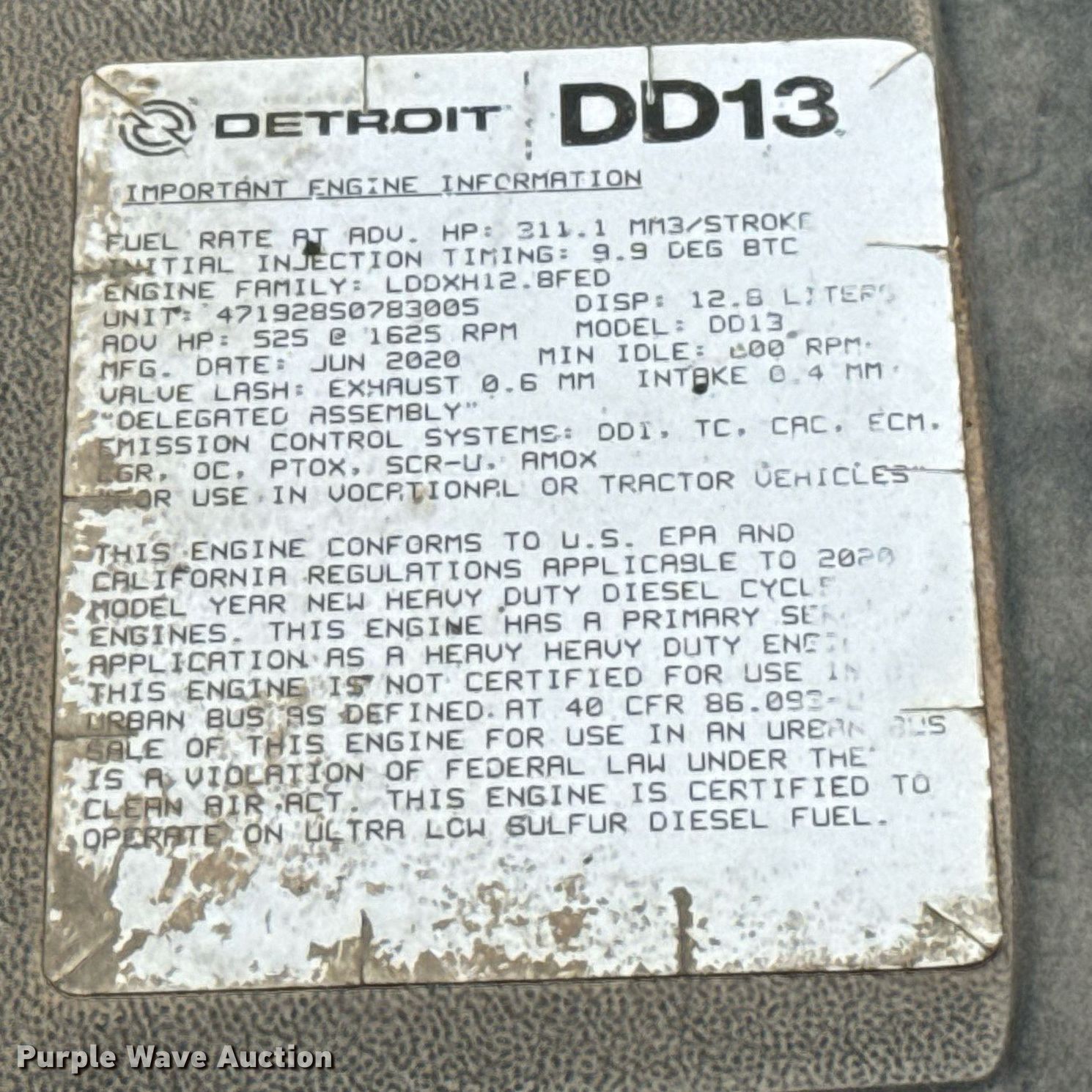 2021 Freightliner Cascadia 126 semi truck. Miles: 537,936 on odometer, Engine hours: 13,681 on meter, VIN: 3AKJHLDV7MSMK9822, Unit #: 21083. Engine Detroit Diesel DD13, Displacement: 12.8L, Cylinders: 6, Fuel type: Diesel, HP: 525, Engine brake. Transmission Automated manual. Chassis Axles: Tandem, Differential lock: Inter-axle, Suspension: Air Dump valves, Brakes: Air, GVWR: 52,500 lbs FAWR: 12,500 lbs, IAWR: 20,000 lbs, RAWR: 20,000 lbs, Wheelbase: 180". Interior AC, Heat, Heated mirrors, Power windows, Power locks, Cruise control, Air ride cab. Features Deck plate: Aluminum, Fifth wheel type: Fixed, Fuel tank: Single. Tires Front: 295/75R22.5, Rear: 445/50R22.5. Notes Dash warning indicator: Check engine, Windshield chipped or cracked. Oklahoma title. Title distribution may be delayed up to 30 days from verification of funds. Gemini Motor Transport. Oklahoma City, OK 73127